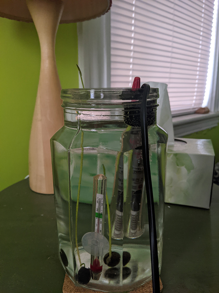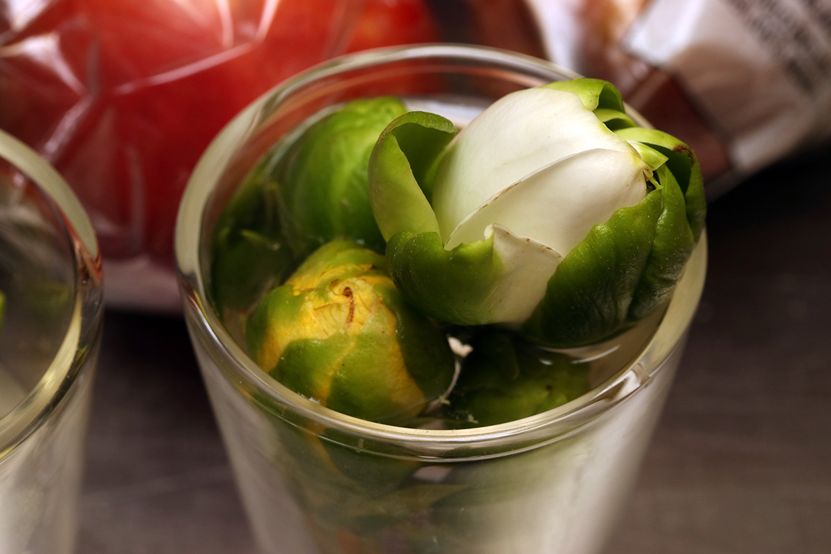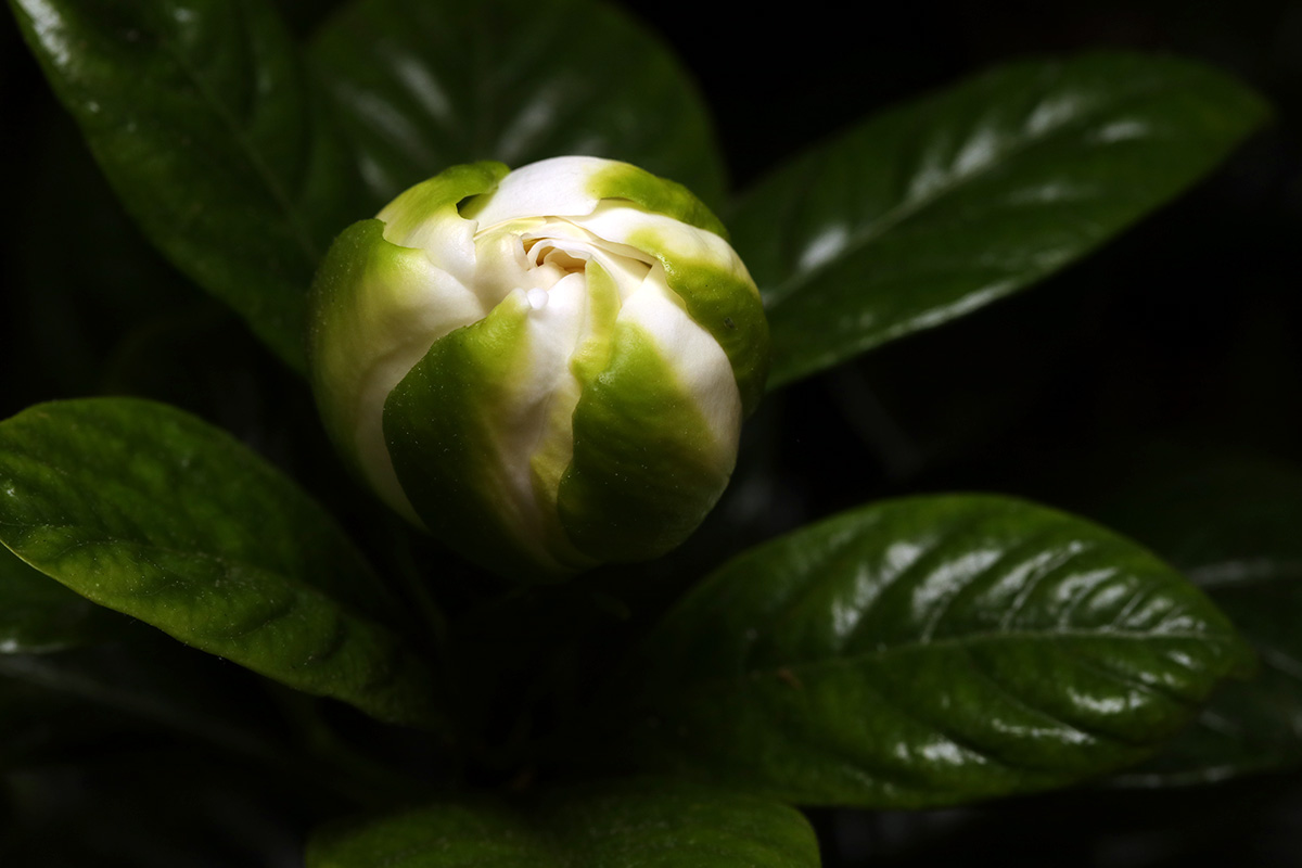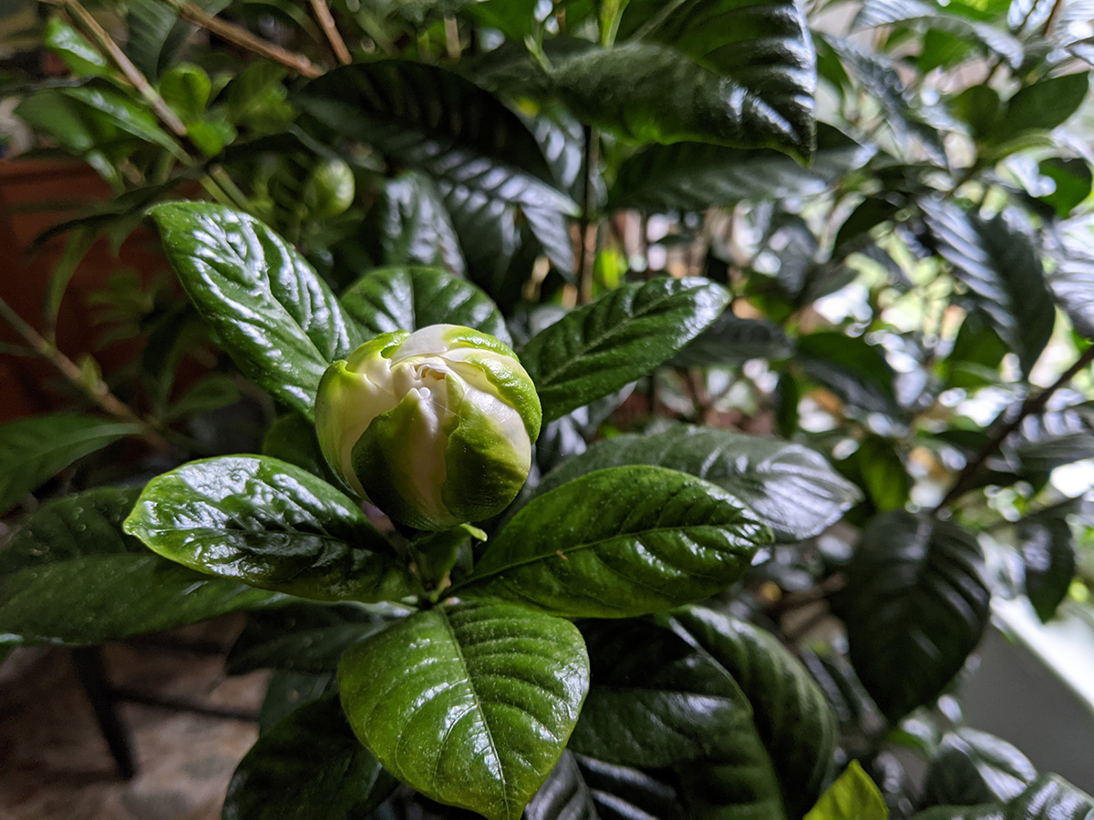 a few of the remaining flower buds on the gardenia seem like they might bloom. at the very least two looked promising, the buds swelling up to reveal some white petals on the inside. but as has been happening since last weekend, the flower buds continue to fall, and one of the nearly-opened flower buds fell off today, so now there's just one.