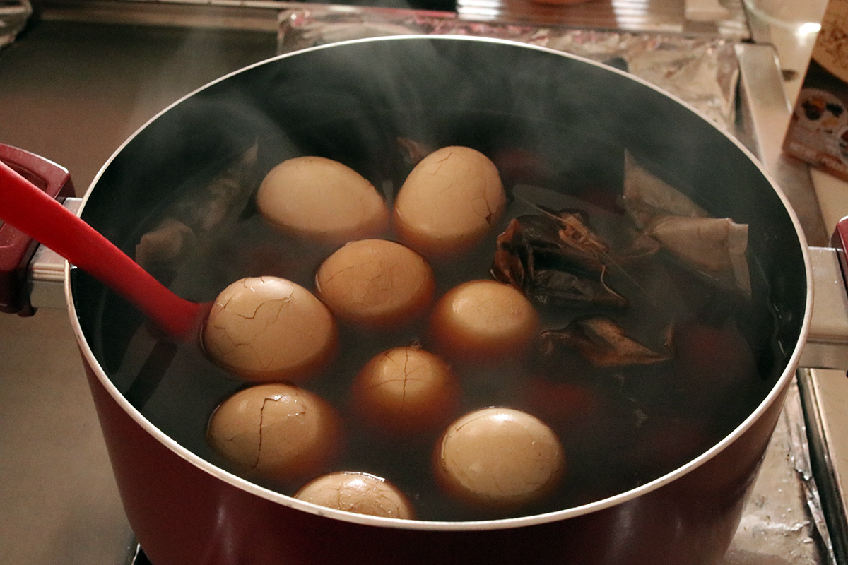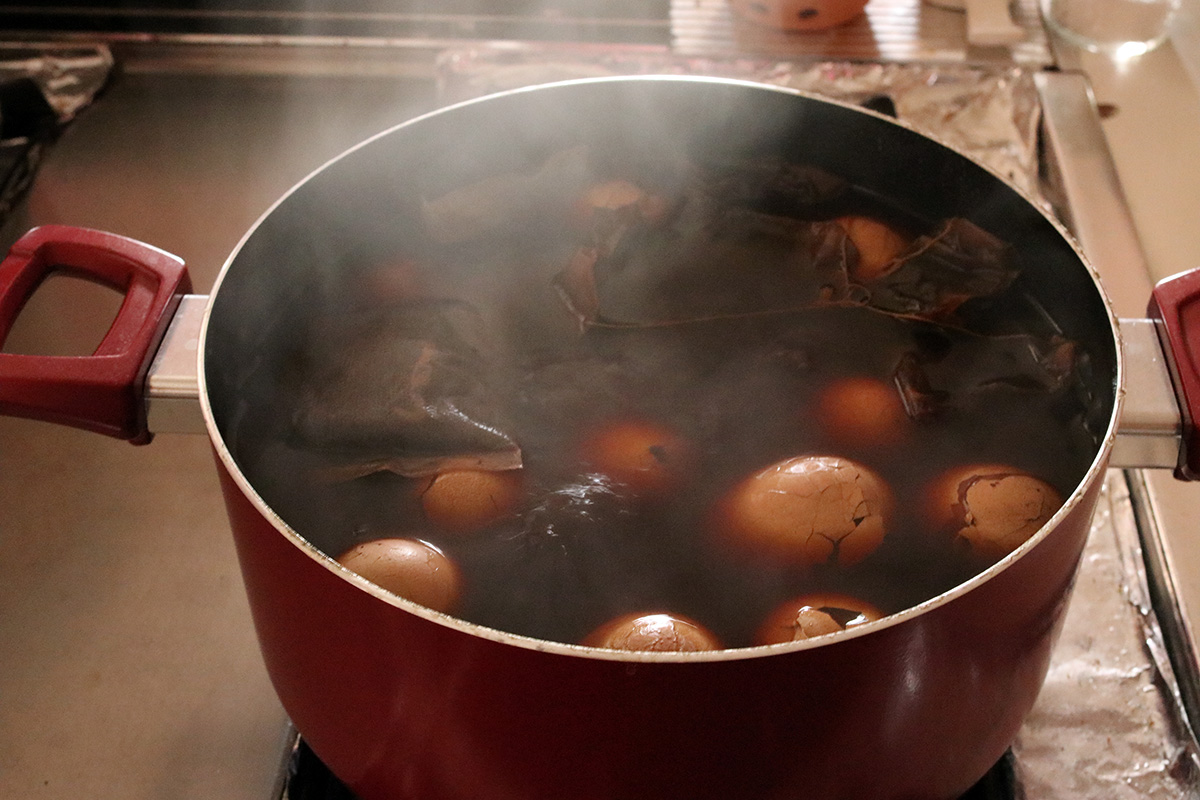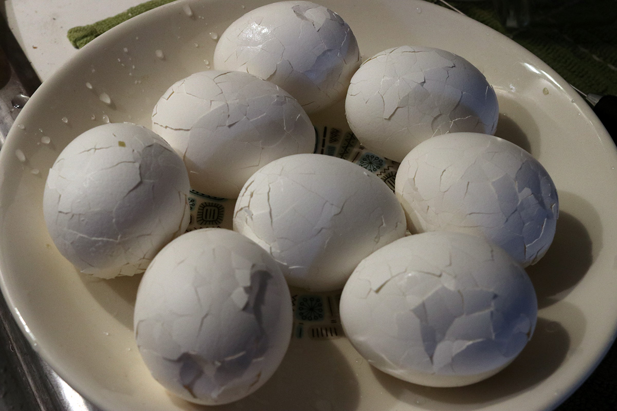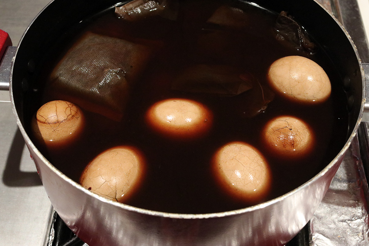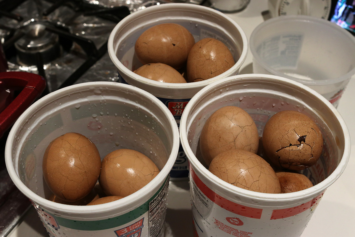 back in 2018 i wrote a very detailed description of how to make 2 dozen tea eggs. i basically followed that recipe. i used all white eggs, and they were straight from the fridge. like i said, they're at least 3 weeks old, maybe older. i didn't bother adding the sichuan peppercorns this time, since i can't really taste it. after an hour of boiling in tea egg brine solution, i left them to cool. once they were at room temperature, i put them into 32oz. yogurt containers, filled them up with tea egg brine, then put them in the fridge. they should be ready to eat in 3 days, so by friday. i've made so much, i'm going to some to my parents to sell. one great thing about making tea eggs at home is the house starts smelling like a taiwanese 7-11, brings back some memories.