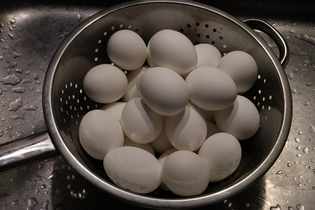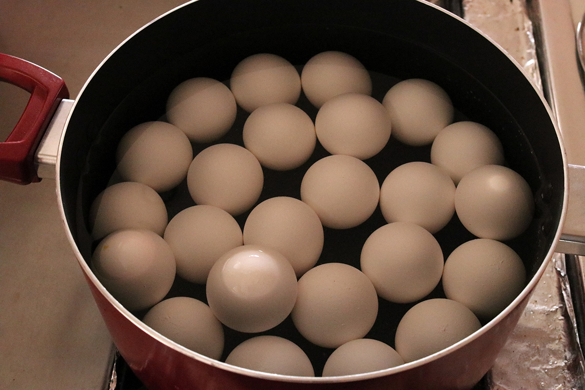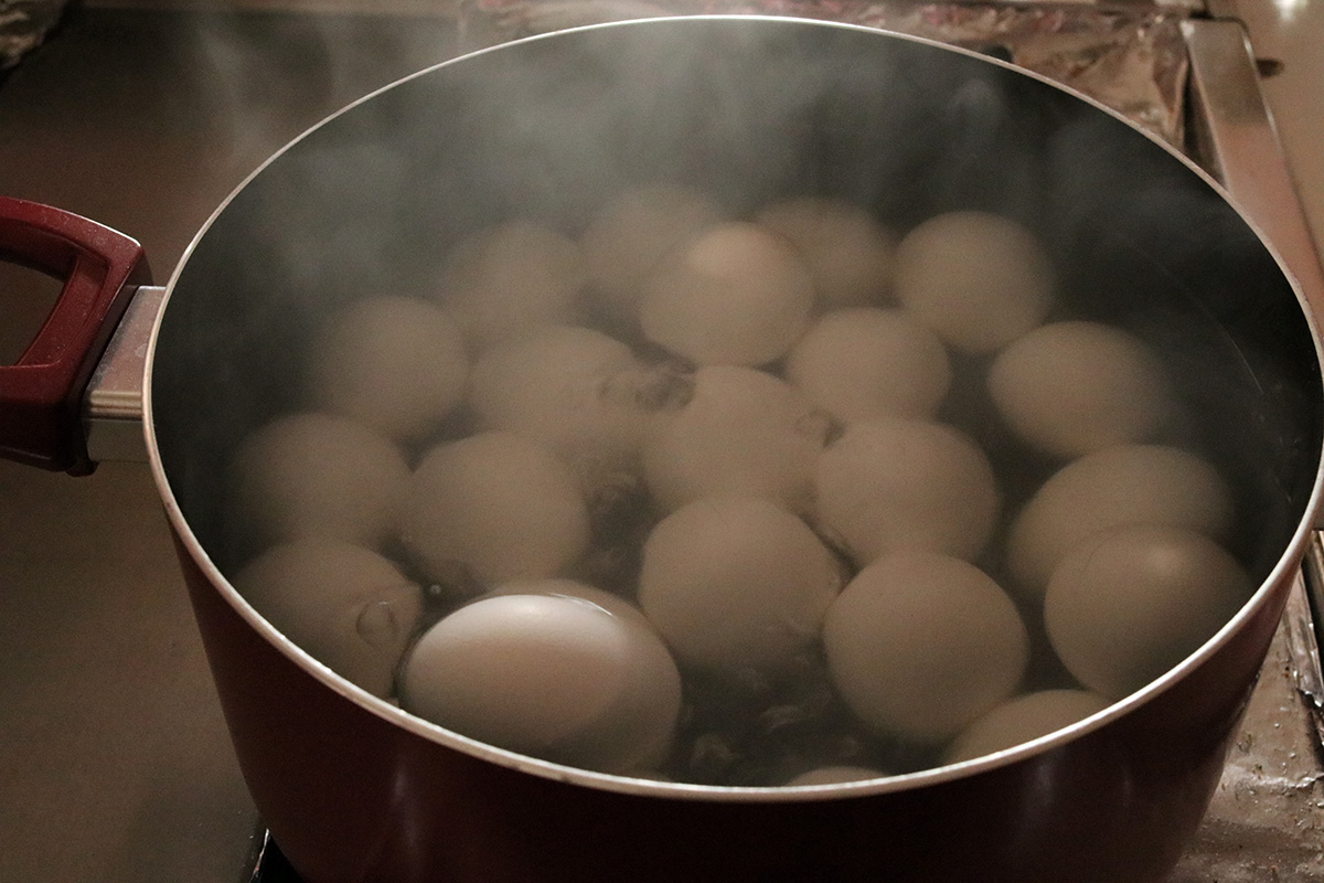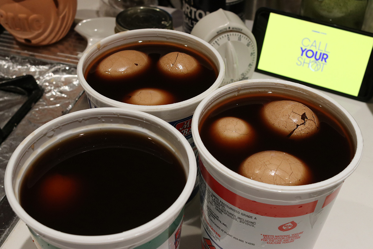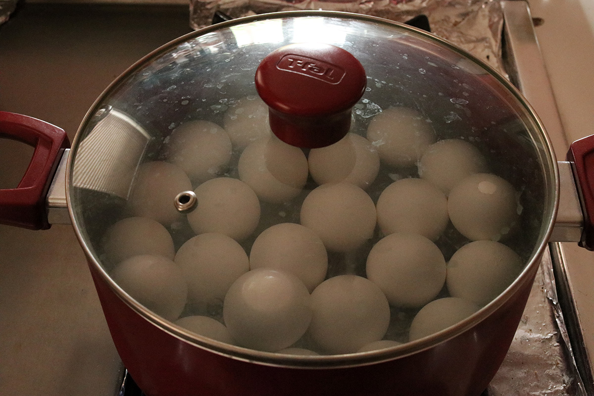 back in 2018 i wrote a very detailed description of how to make 2 dozen tea eggs. i basically followed that recipe. i used all white eggs, and they were straight from the fridge. like i said, they're at least 3 weeks old, maybe older. i didn't bother adding the sichuan peppercorns this time, since i can't really taste it. after an hour of boiling in tea egg brine solution, i left them to cool. once they were at room temperature, i put them into 32oz. yogurt containers, filled them up with tea egg brine, then put them in the fridge. they should be ready to eat in 3 days, so by friday. i've made so much, i'm going to some to my parents to sell. one great thing about making tea eggs at home is the house starts smelling like a taiwanese 7-11, brings back some memories.