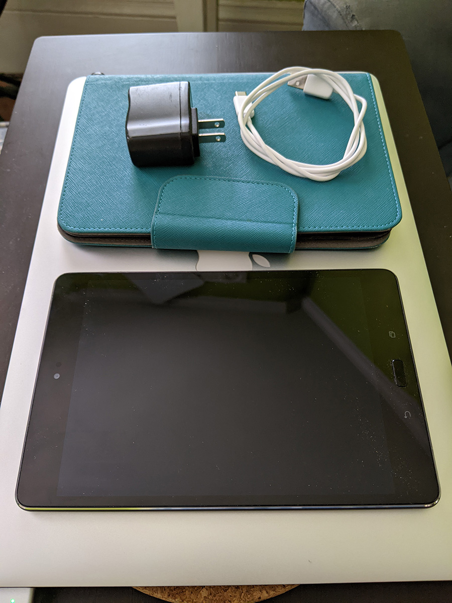 the thing i noticed right away about the ASUS zenpad Z8s tablet was how thin it was. it also felt pretty solid, with a hefty metal backing. i tried powering it on but the battery was completely drained. i plugged it into a charger. the seller also gave me a case and a charger. i don't think i'll ever use the case, and the charger and cable were mismatched, the plug was for some texas instrument equipment, the cable some white USB-C. i don't need them anyway, since i have my own charger and cables.