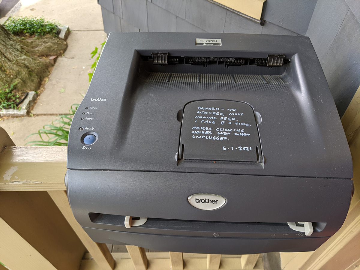 a box was waiting for me on my doorstep: the ASUS tablet! i didn't have time to open it just yet though, as i needed to visit the cambridge recycling center to drop off my used brother printer. it's only opened on tuesday and saturday. i wrote a little note on the printer regarding its issues (i don't think they care, it's just going to get scrapped, i don't think anyone is there trying to fix the printer, nevertheless, just in case). i strapped the printer to the back of my bicycle with some bungie netting then slowly biked to the recycle center. slow because any bumps might jostle the printer and have it fly off the bike. originally i was just going to relegate the printer into the basement, maybe one day figure out a way to fix it. but i already bought a new brother's laser printer, and the chance of me ever using this old printer is probably zero, despite the sentimental value. so the logical choice was to throw it out responsibly.