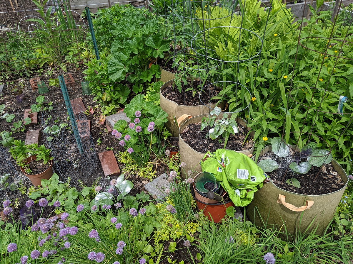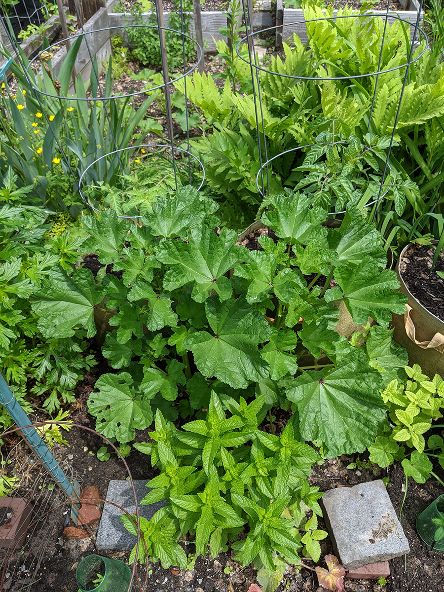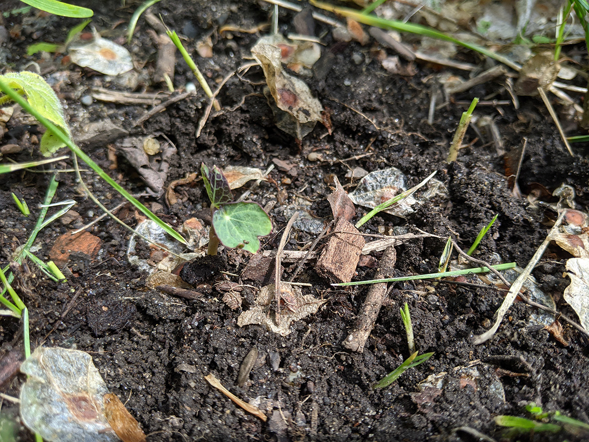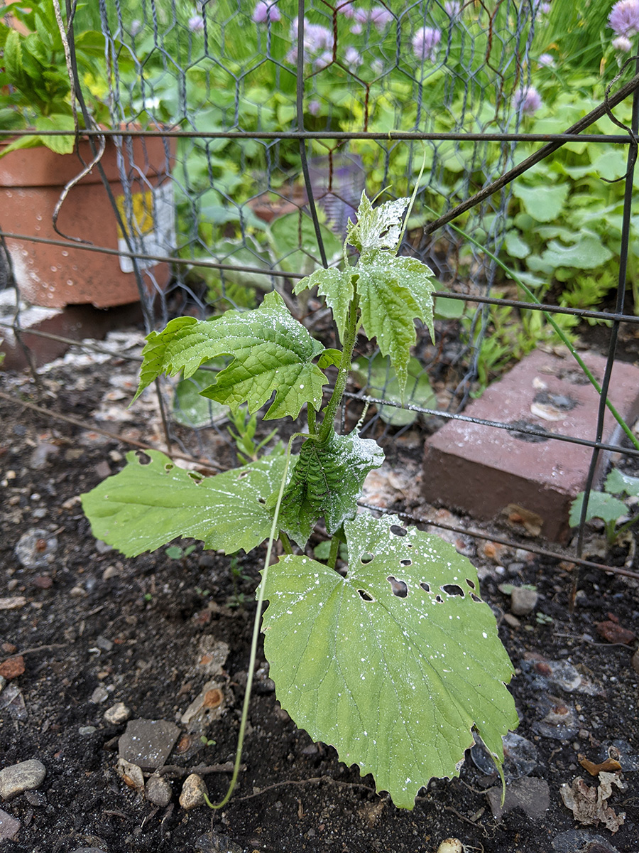i went to the community garden this morning. not to water - i probably don't need to water for a few days given how much rain we got over the weekend - but rather i went down to check on my plants and to spray diatomaceous earth. sure enough, i found cucumber beetles feeding on my ground cherries, they flew away as soon as they detected i was nearby. i doused the ground cherries, as well as bitter melons, eggplants (i noticed some flea beetles), and baby bokchoi. i noticed a few of the nasturtium seedlings have emerged.