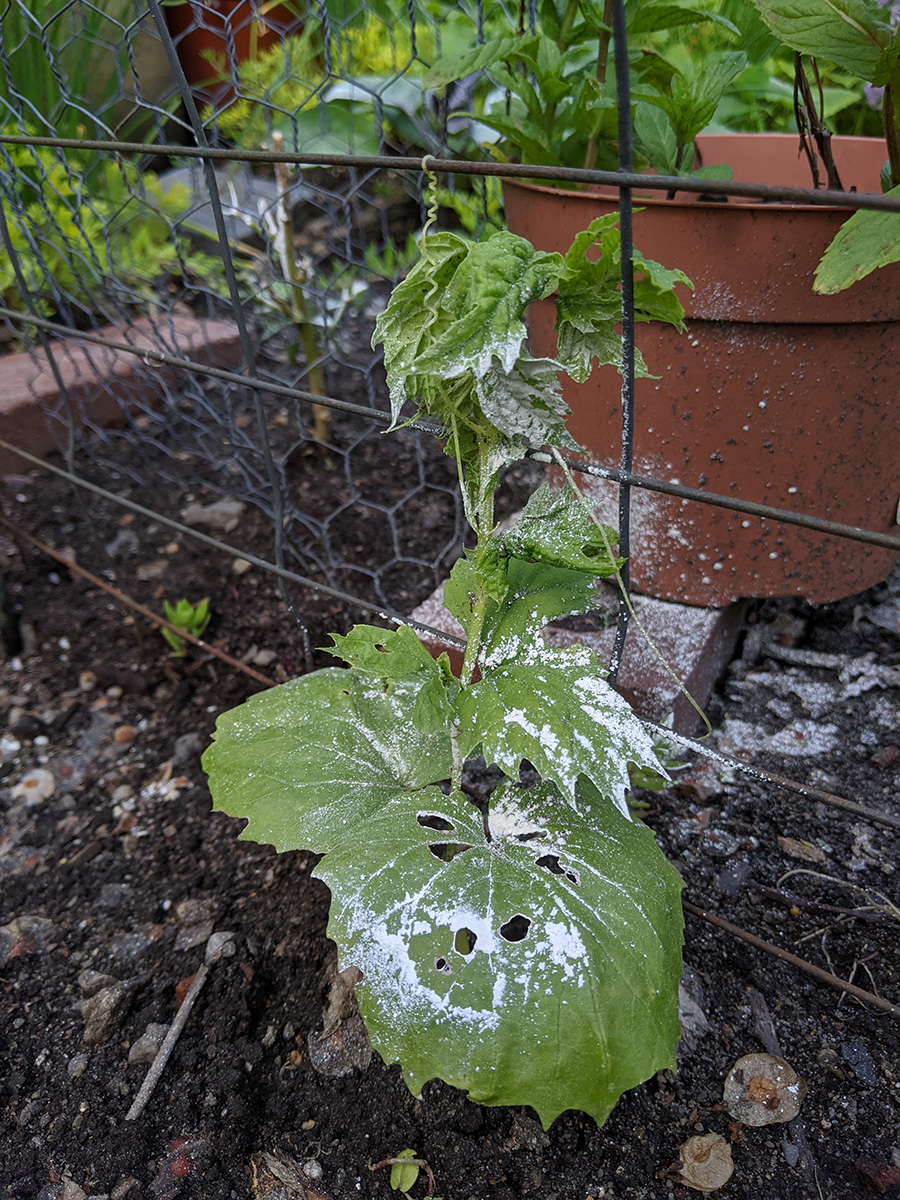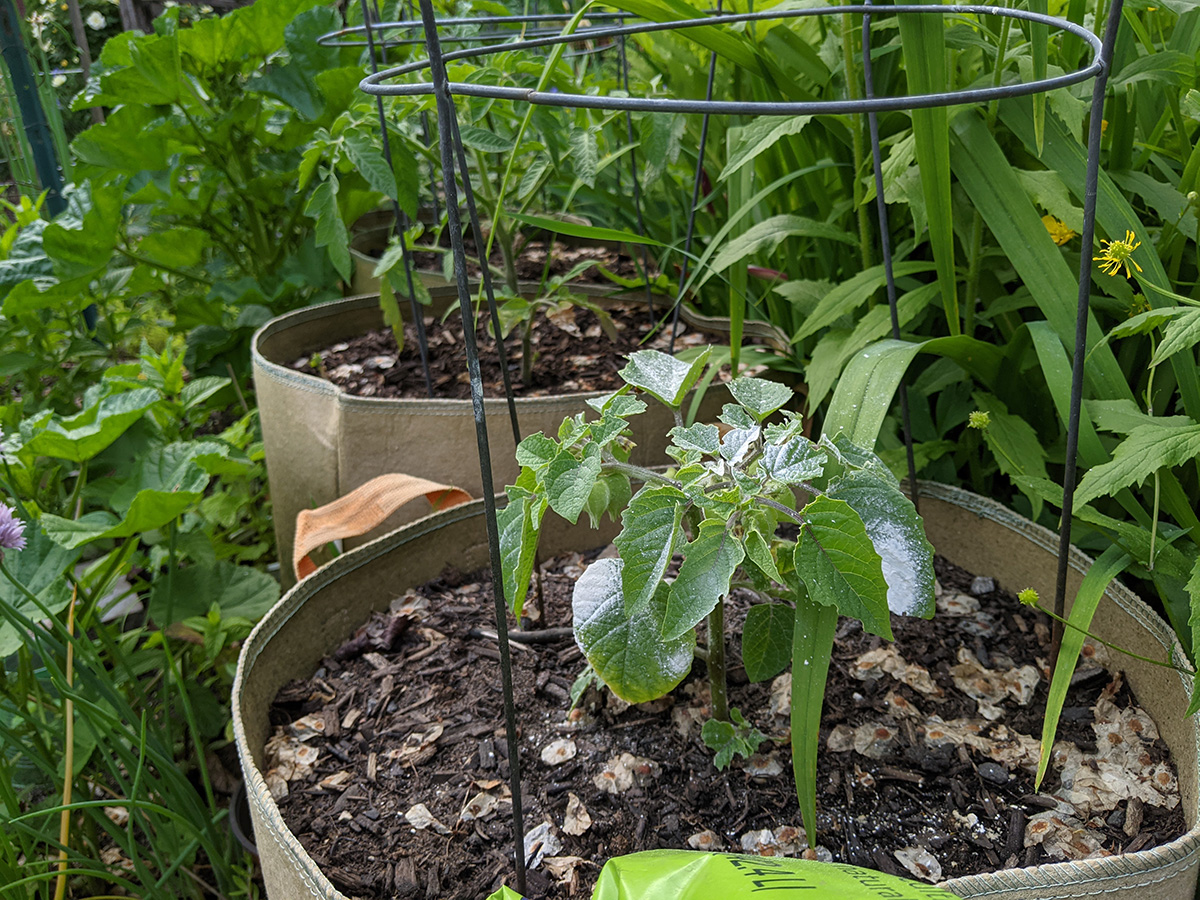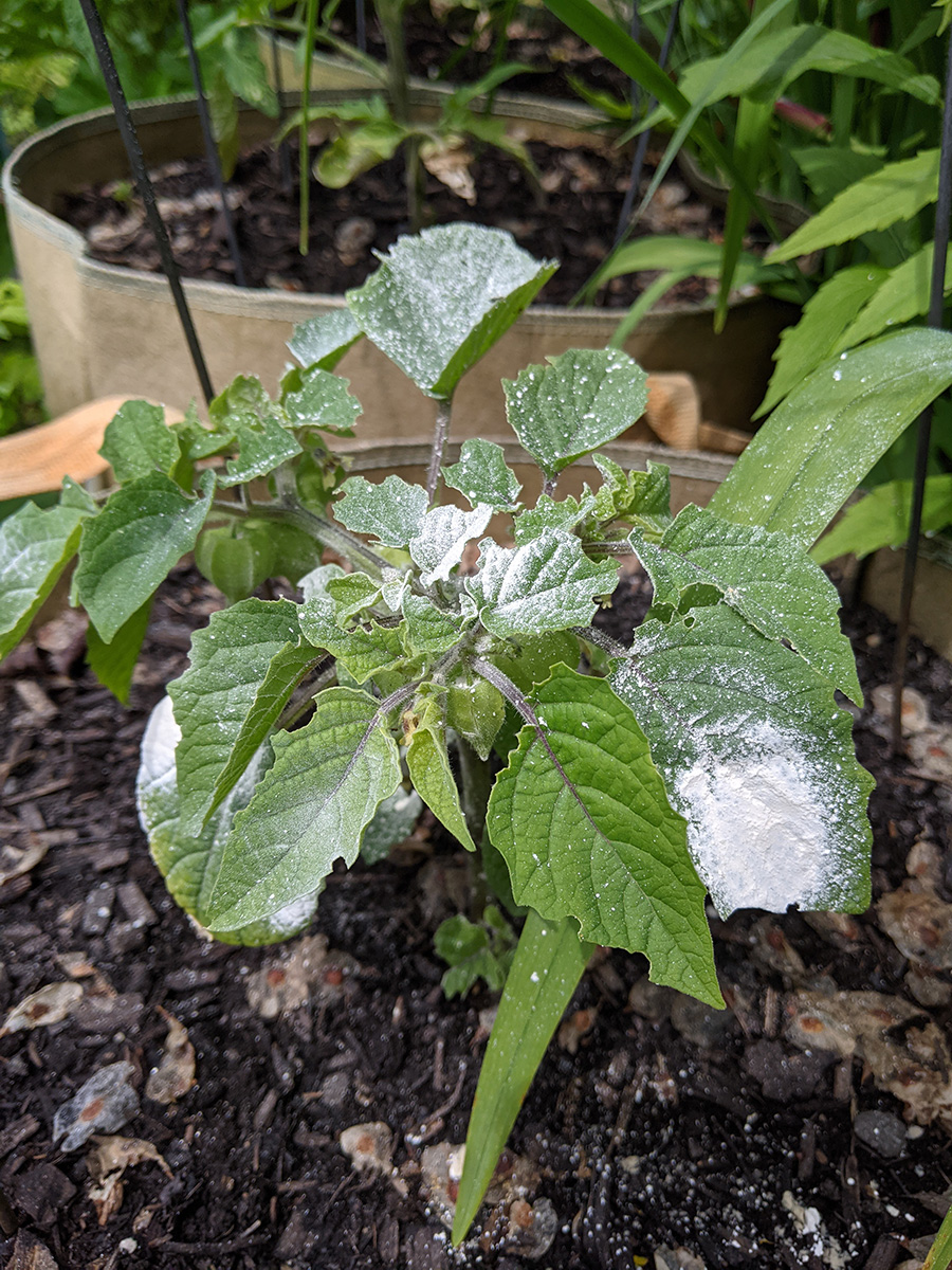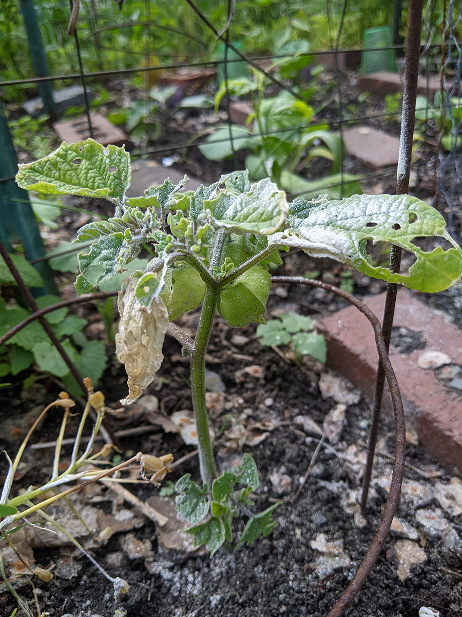 i also filled a squeeze bottle with diatomaceous earth and sprayed all the ground cherries and eggplants. i haven't noticed any flea beetles or cucumber beetles, but better to spray before their arrival instead of waiting for them to show up and start feeding on the leaves.