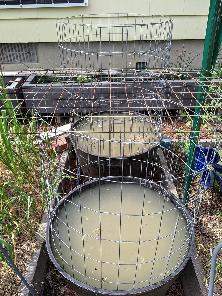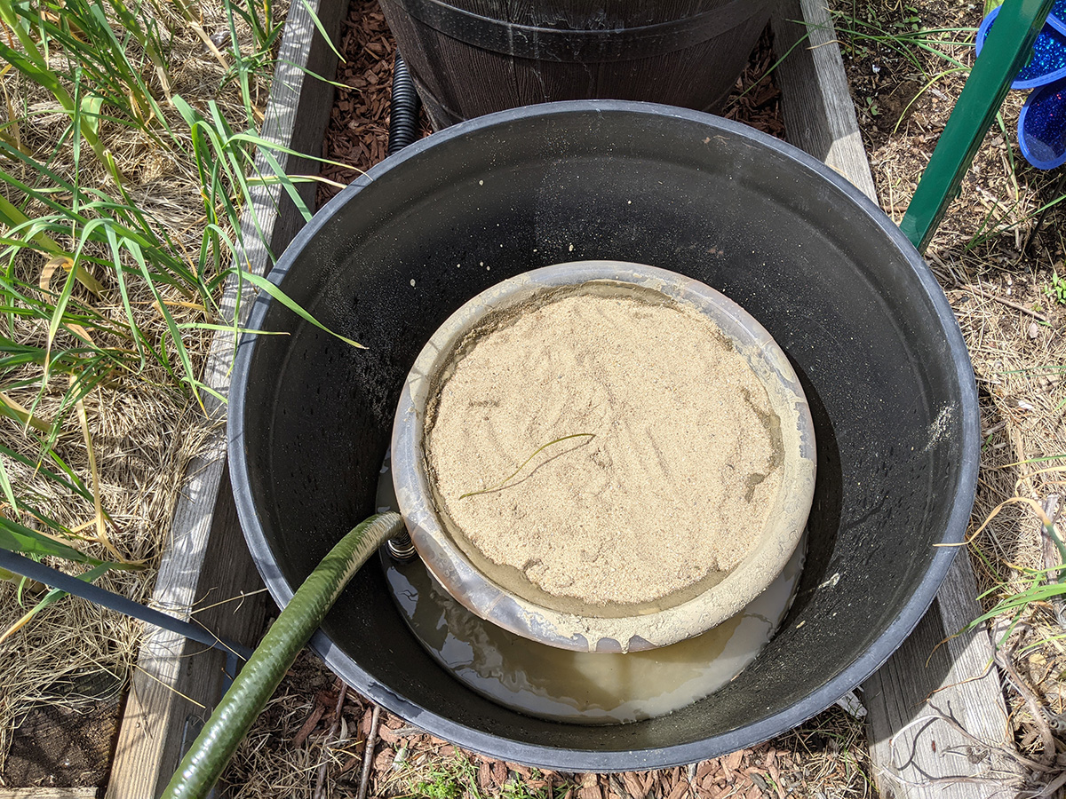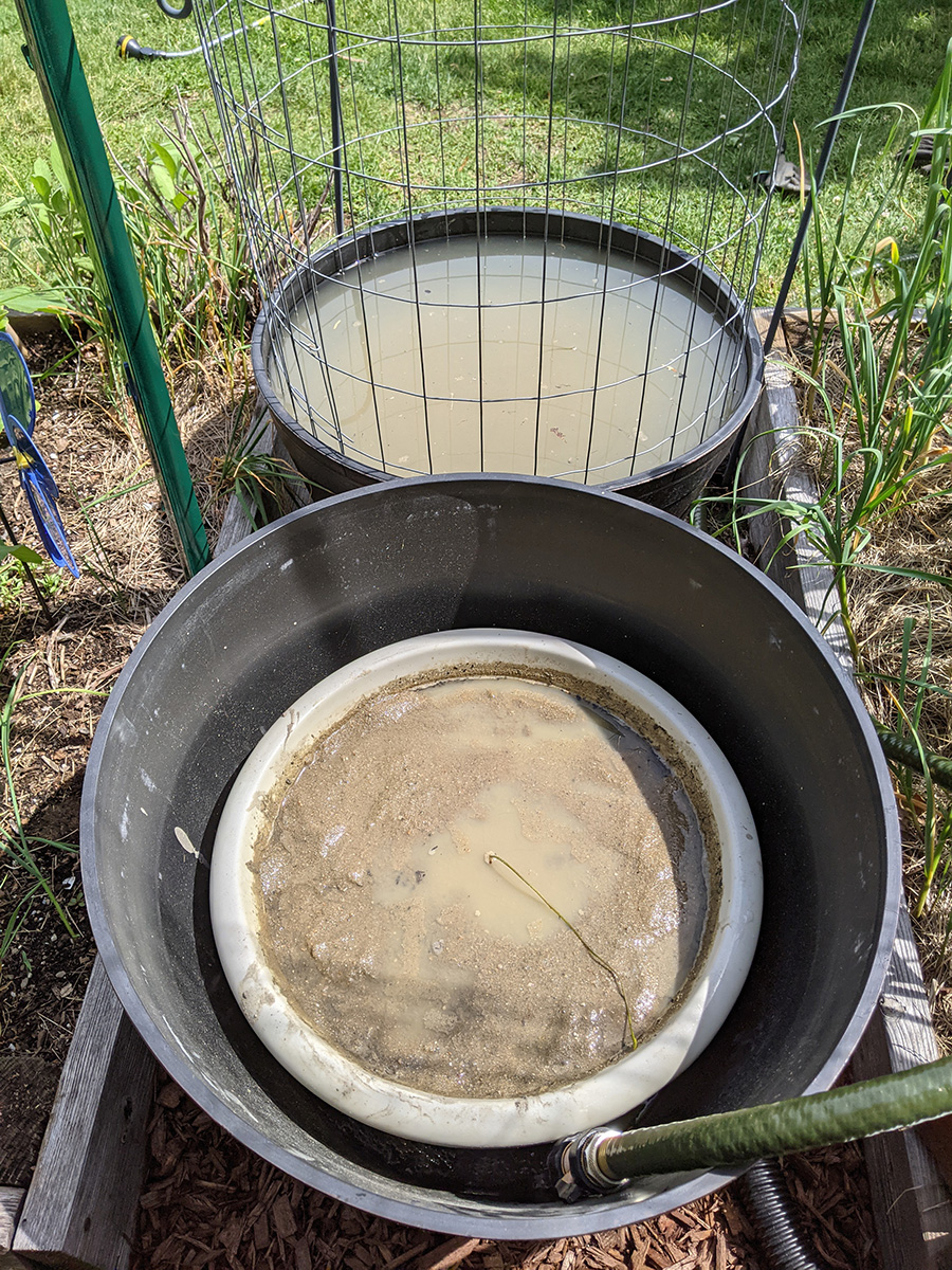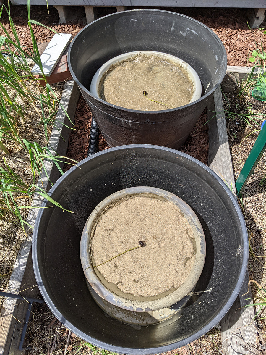 after covering up the clay mud with sand, i planted the lotus seedlings then started slowly filling up the barrels. filling them up too fast might wash away the sand and expose the muddy layer underneath, which would then dissolve in the water. after that was finished, i erected some wire fencing around the barrels. i learned the hard way the past two seasons that raccoons occasionally wander into the backyard and find the water-filled lotus barrels irresistible as they did through the muddy look for something to eat. as for the third lotus seed, it's partially germinated, i'm keeping it in water, but i don't have much hope. if it does sprout a second stalk (since the first stalk broke), i may try raising it as a tabletop mini lotus.