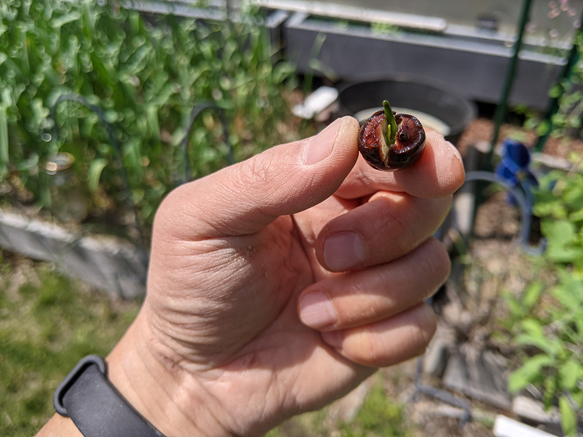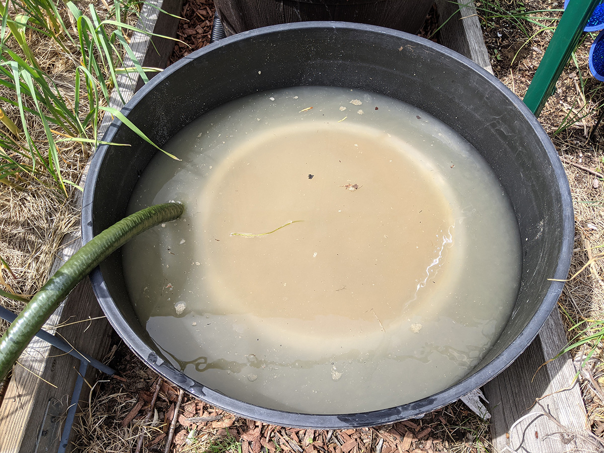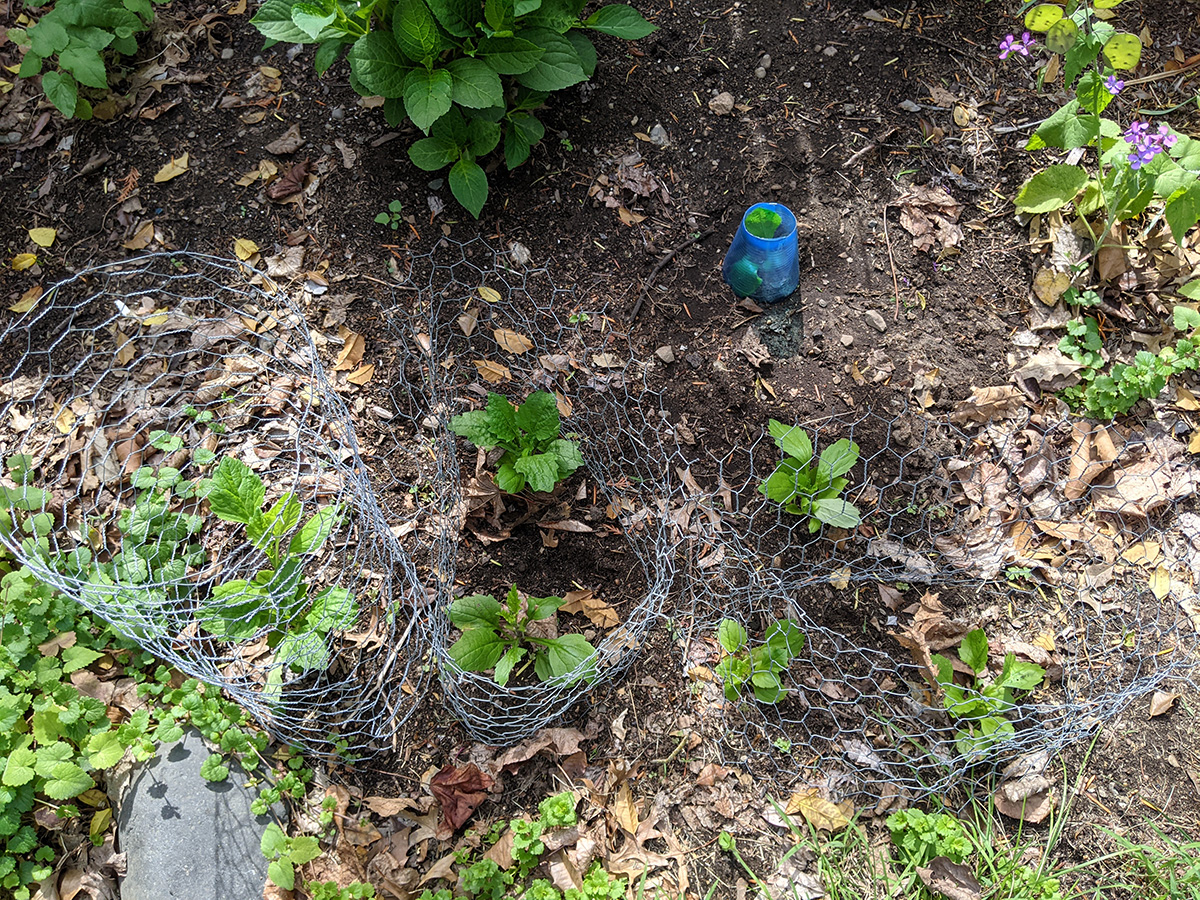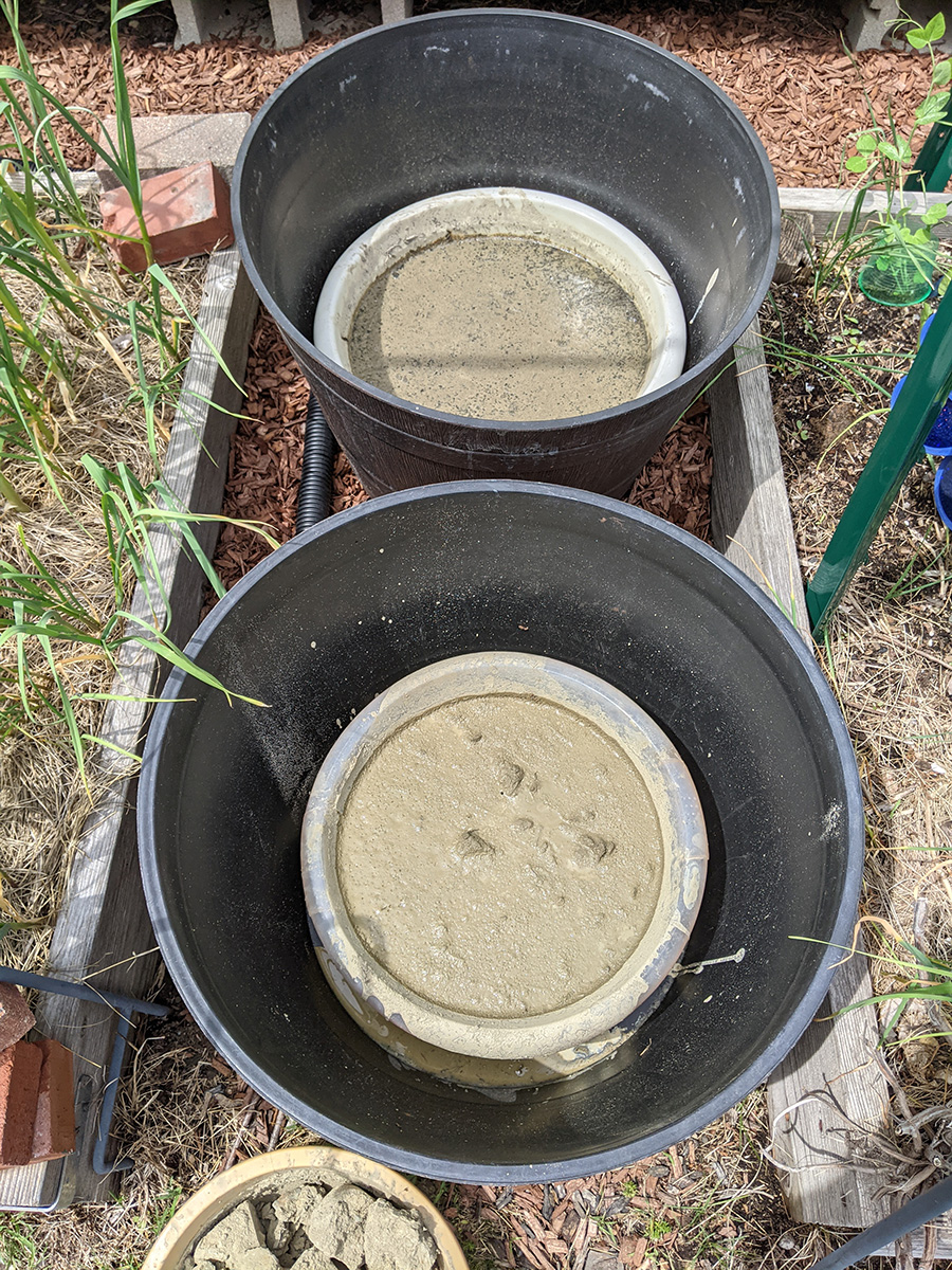 after covering up the clay mud with sand, i planted the lotus seedlings then started slowly filling up the barrels. filling them up too fast might wash away the sand and expose the muddy layer underneath, which would then dissolve in the water. after that was finished, i erected some wire fencing around the barrels. i learned the hard way the past two seasons that raccoons occasionally wander into the backyard and find the water-filled lotus barrels irresistible as they did through the muddy look for something to eat. as for the third lotus seed, it's partially germinated, i'm keeping it in water, but i don't have much hope. if it does sprout a second stalk (since the first stalk broke), i may try raising it as a tabletop mini lotus.
