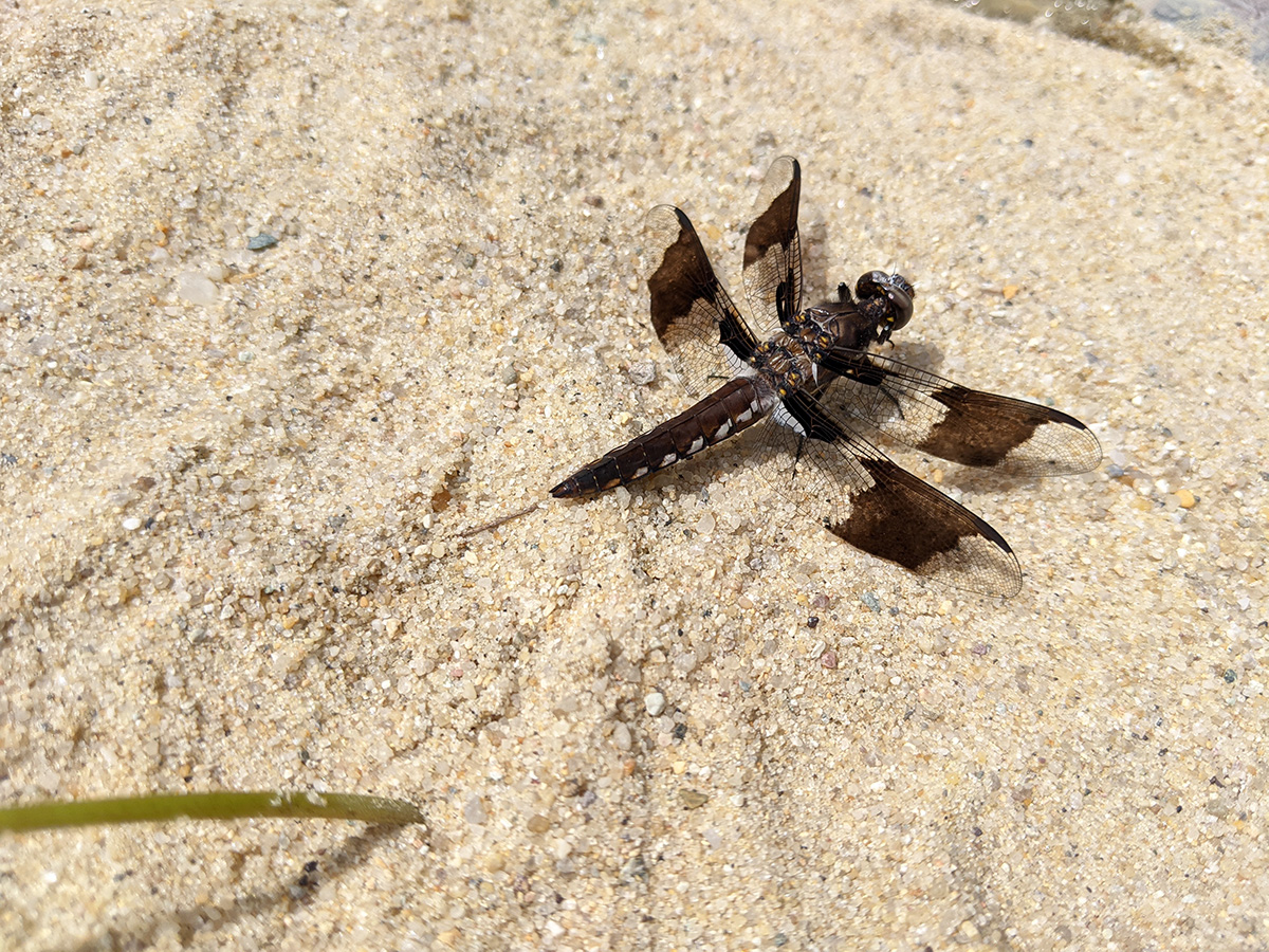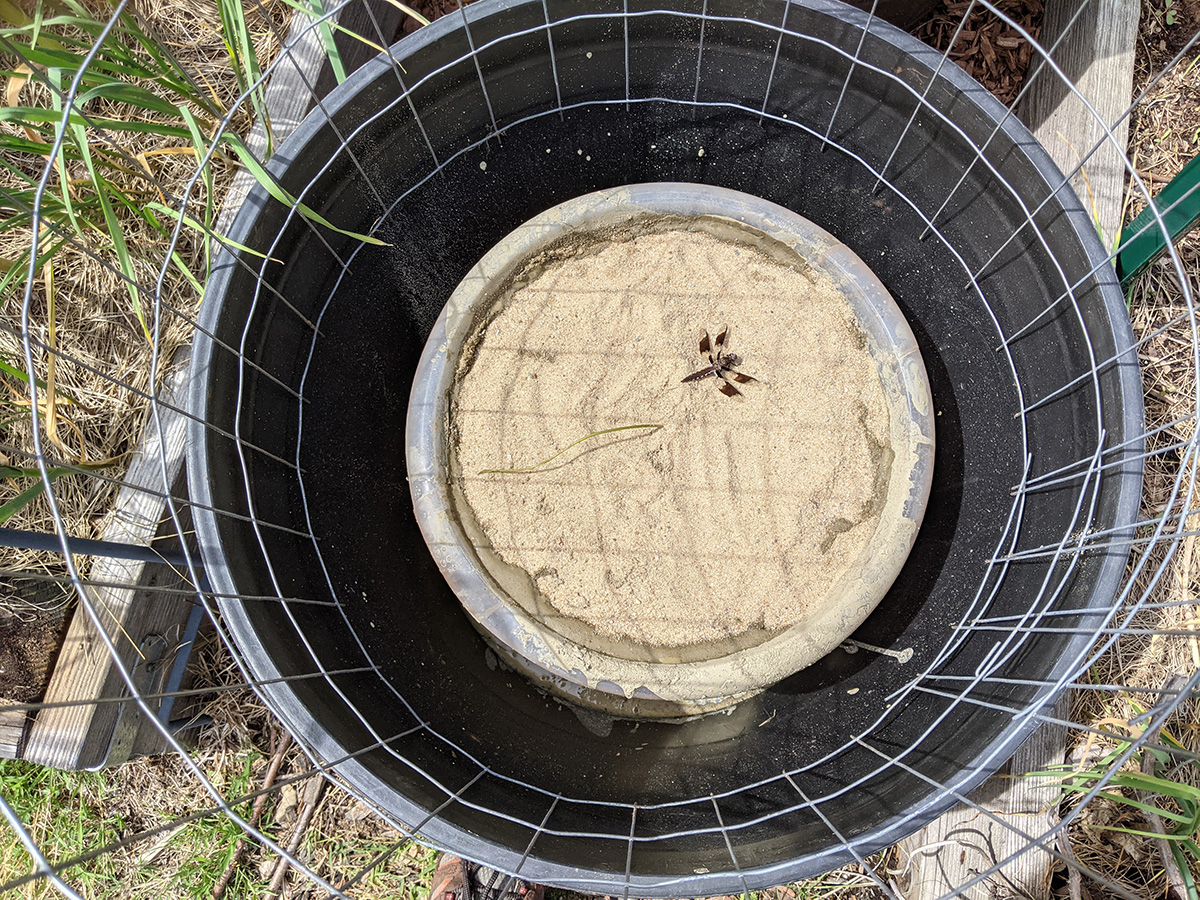 i couldn't wait any longer and left for belmont around 2pm. i was there to plant my 2 lotus seedlings. i'm 2 weeks behind in my planting compared to last year. the reconstituted leftover clay mix in the plastic basins weren't as watery as it was yesterday, but it was still more liquid than solid. i thought about adding more clay, but decided that if i added a top layer of sand it'd prevent the watery clay mud from dissolving in the water. at one point a large dragonfly landed on the sandy surface, maybe mistaking it for a sandy shoreline. it was completely fearless as it groomed itself, and i got close enough to take some photos and a video. my parents' house, with its close proximity to fresh pond, frequently gets dragonfly visitors. later on when i had time to look it up, i discovered it was an immature male whitetail.