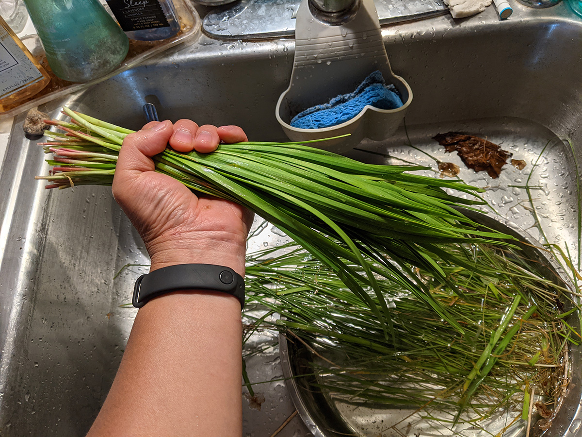 while the tablet was charging, i sifted through my garlic chives in the kitchen sink. not everything i harvested was garlic chives, half was it was actually just grass, both are very similar looking.