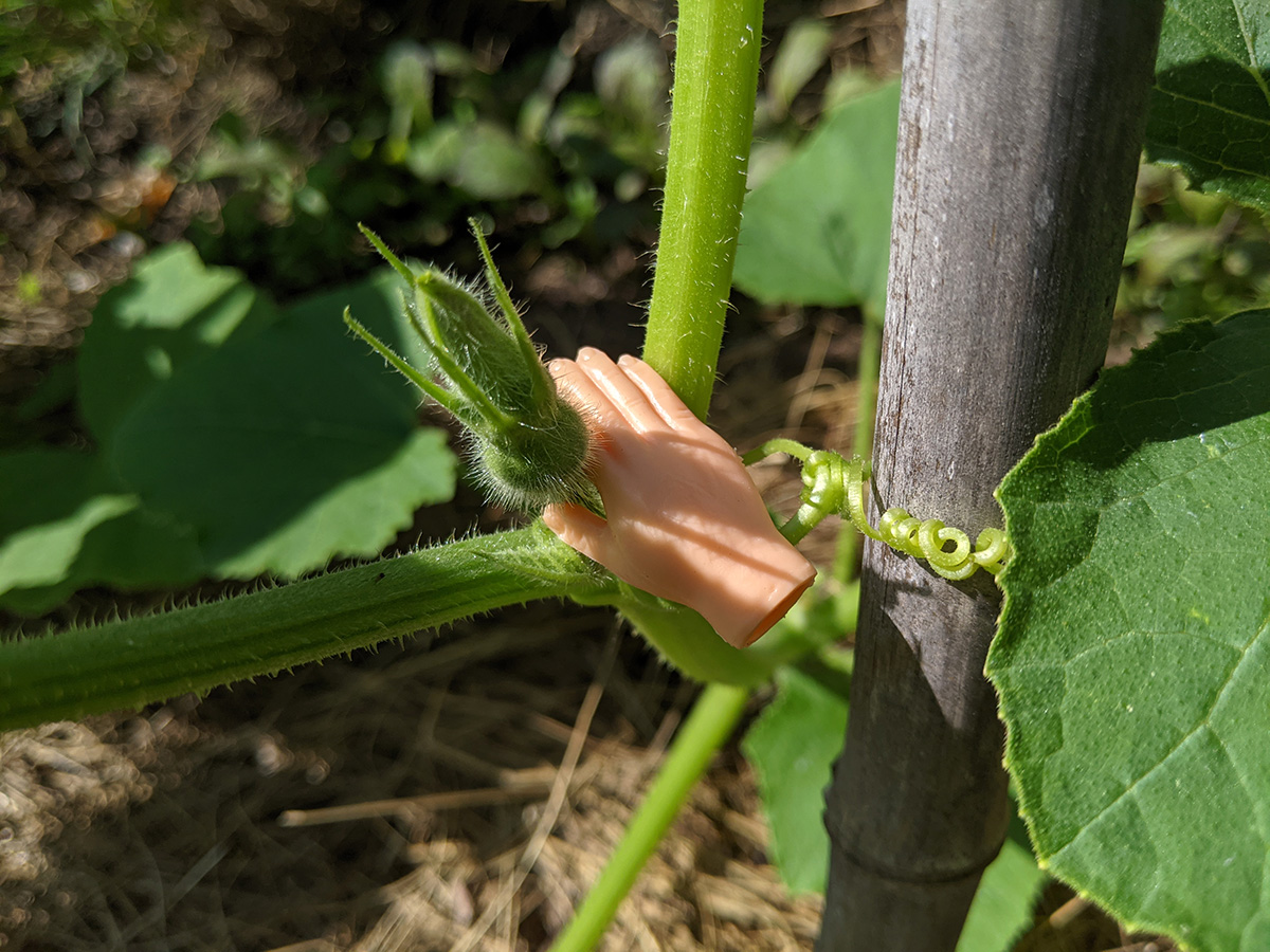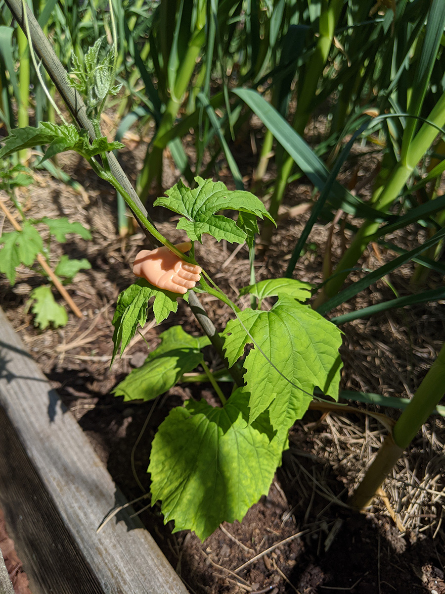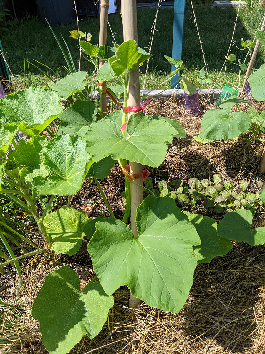 earlier my father had added more bamboo poles to the raised beds so now each squash plant has its own pole to climb on. he's also been removing the flower buds, since we think the plants are still too immature to begin making fruits.