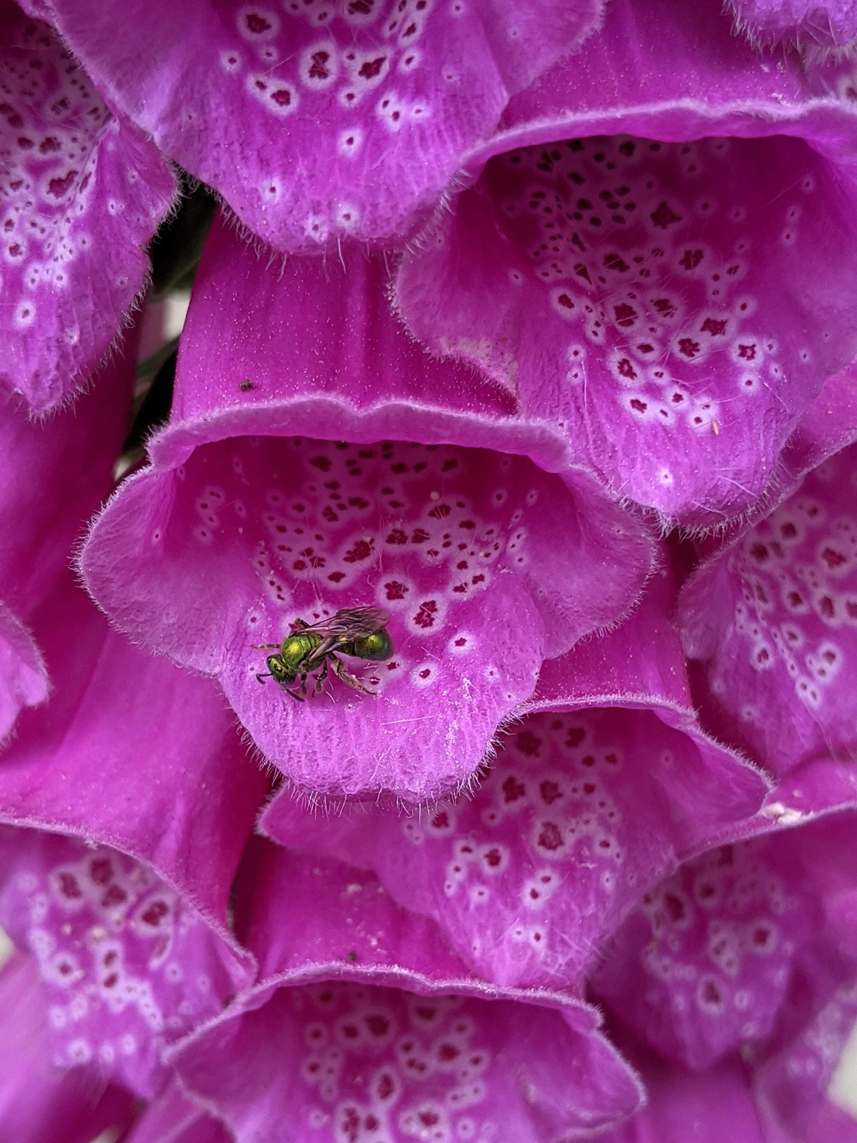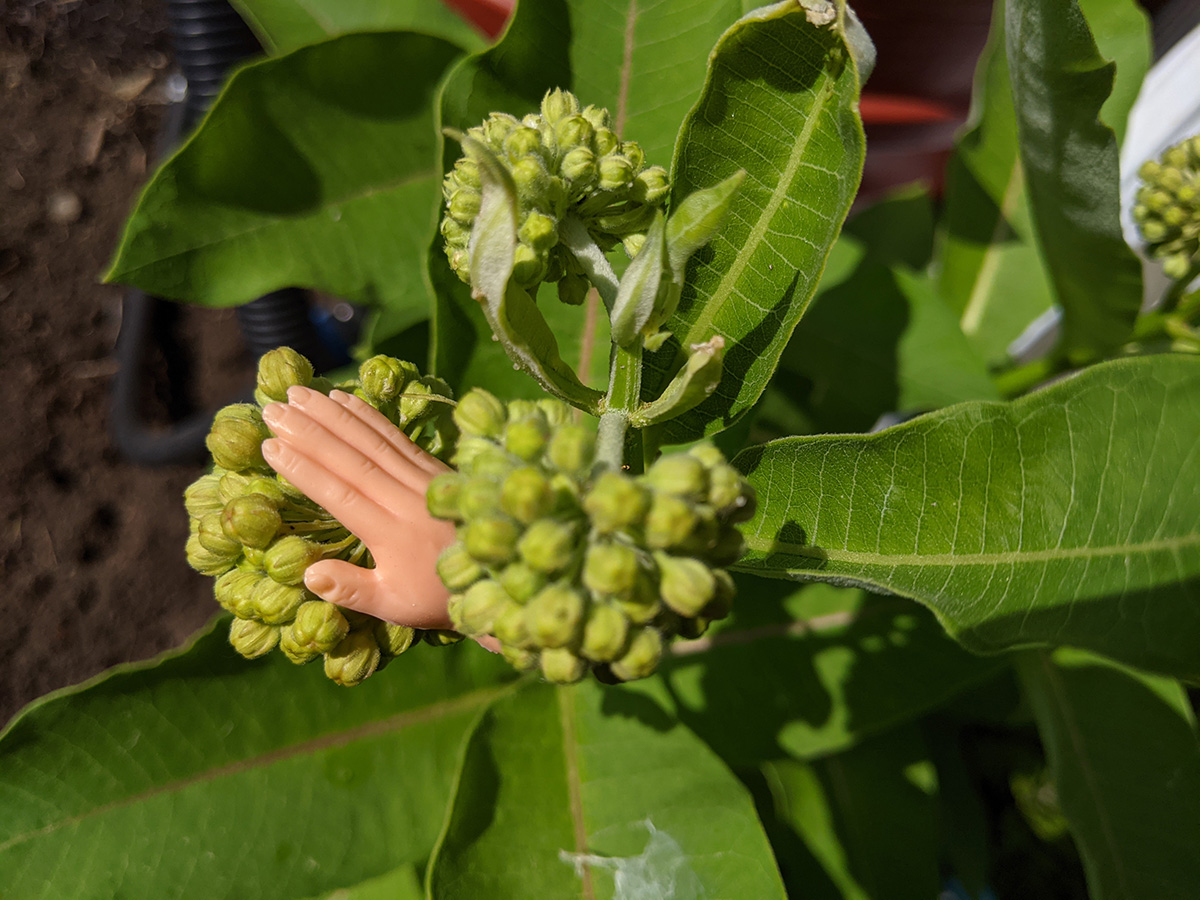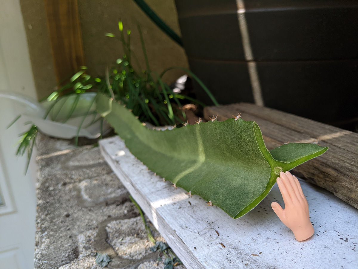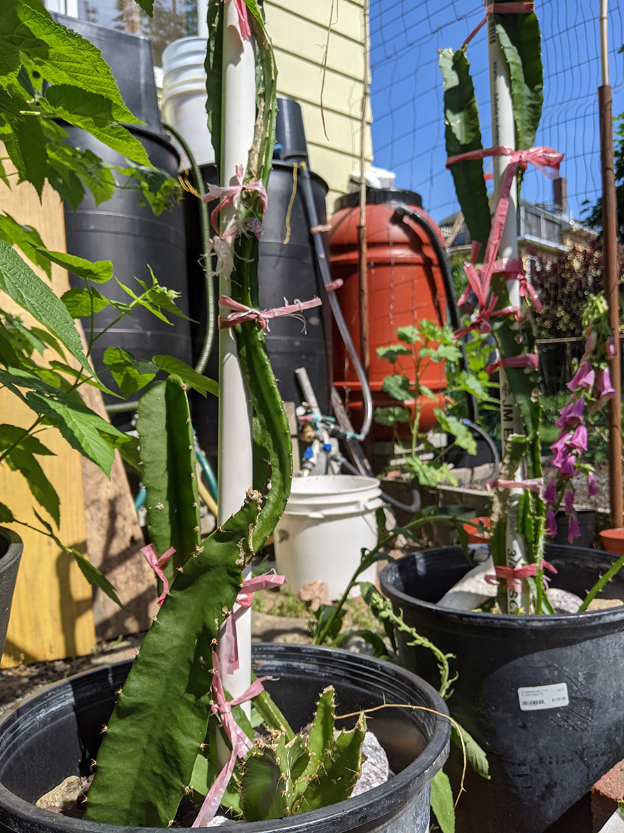 elsewhere in the garden: one of my lotus plants have started to unfurl it's first floating leaf. under the water i can see the second stalk emerging for both plants, which is a good sign that they lotus is growing. i redug the bamboo trench. the extra soil i used to block some holes underneath the fences. i did come across another escaped runner which i prompted cut off. our rain barrels are at 2/3 capacity. there's the possibility of rain on wednesday but none of the local meteorologists are willing to make a much-needed rain forecast that many days into the future. i got photos of a metallic green cuckoo wasp bee visiting some foxglove flowers. it was only on my phone, if only i had my dSLR. my father also pruned the dragonfruit cactuses. too many of them are growing from very slender bases. it doesn't seem to affect them from growing bigger on top, but it looks strange. all that's really important is the central "spine" which channels water and nutrients up to the top of the cactuses.