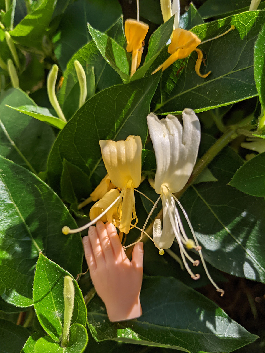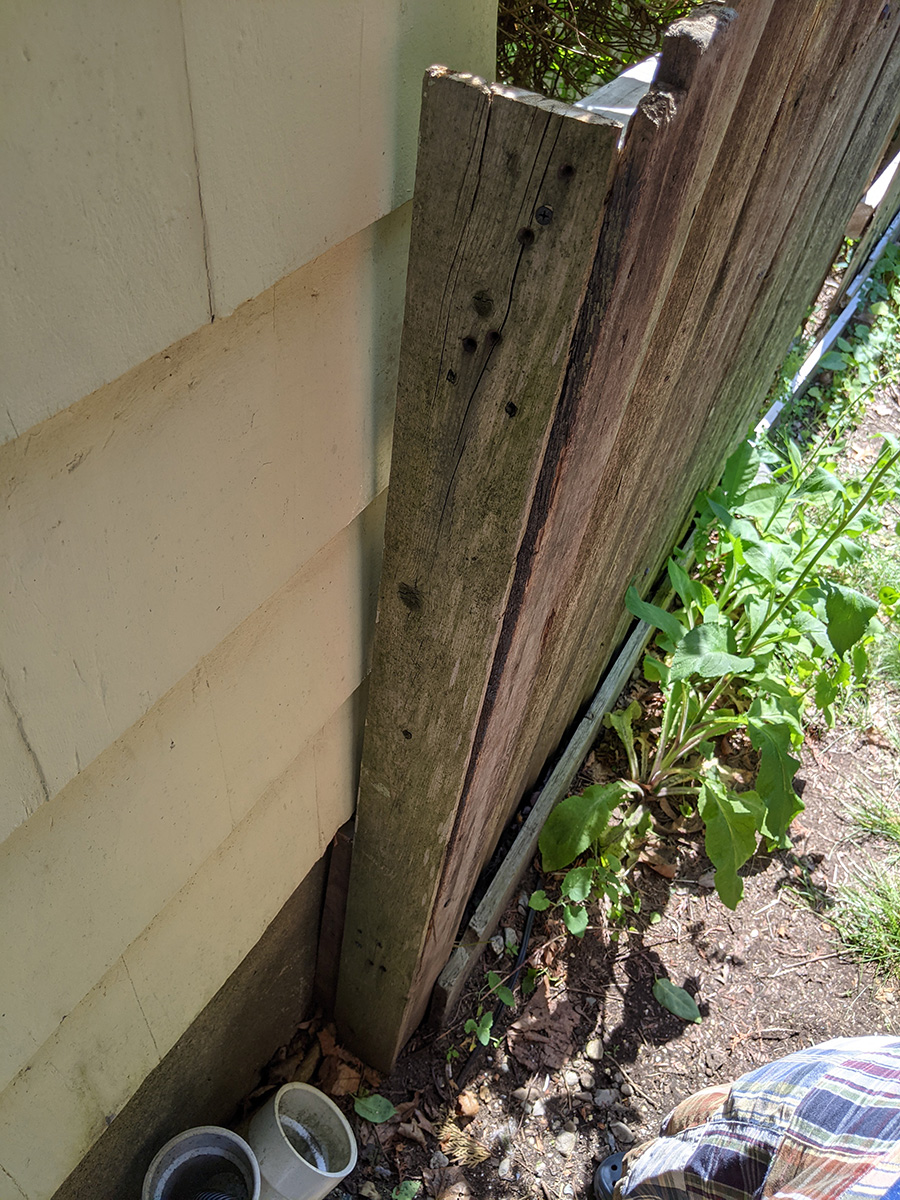 my father said he saw two bunnies this morning, one on either side of the house. i did another perimeter check and found that on one side of our western street-facing fence, there was a gap big enough for small rabbits to get in. we patched it up using scrap wood. i also pruned back the honeysuckle while we were at it.