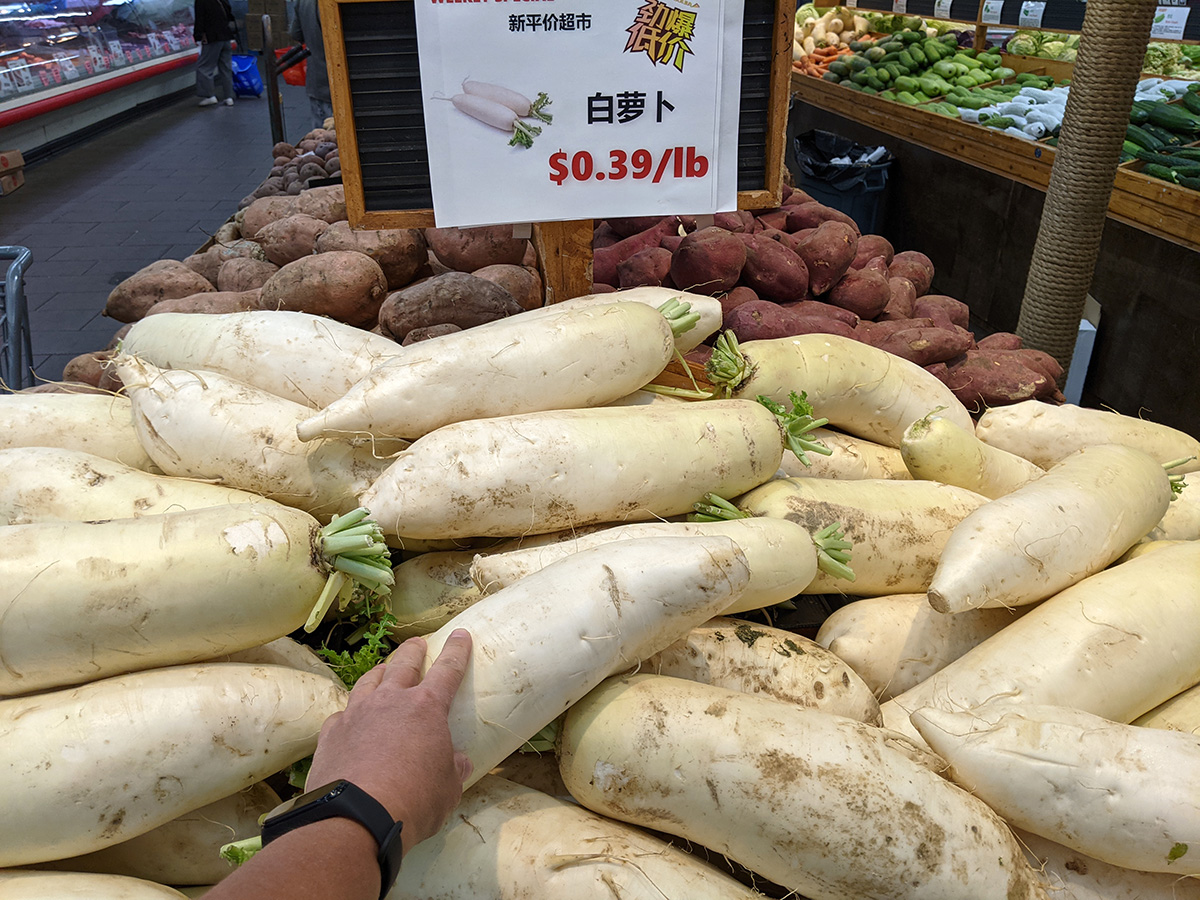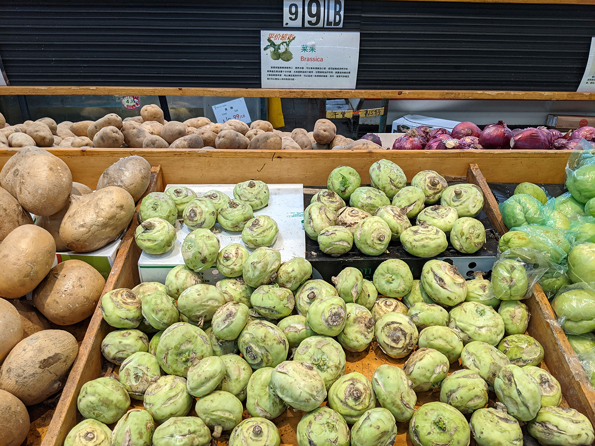 i only went to ming's market this time (2:25pm), despite their smaller selection. most of the stuff was for the cafe so i used the company debit card to pay. i almost bought a ladle strainer - for the next time i need to empty my paocai jar - but i didn't like the size (7.5cm), i wanted a larger one, so didn't buy it. i also discovered they sell kohlrabi, i didn't realize it was used in asian cookie. they called it "èœæžœ" (caiguo) but when i looked it up on wikipedia yesterday, they called it "苤è“" (pielan).
