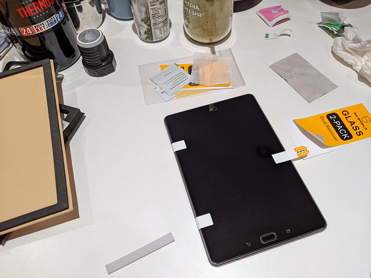 but i ended up getting dust underneath the protector and i had to lift it up a few times to remove the dust. as a rule, screen protectors don't like being lifted, especially glass ones, which are delicate and have a tendency to crack. in fact, i managed to get a hairline fracture but it's not noticeable, and i figured eventually i'll need to replace the screen protector again. my bad luck with my phone made me afraid to work on the tablet with its bigger screen. but i managed to do a perfect job on the tablet, zero dust.