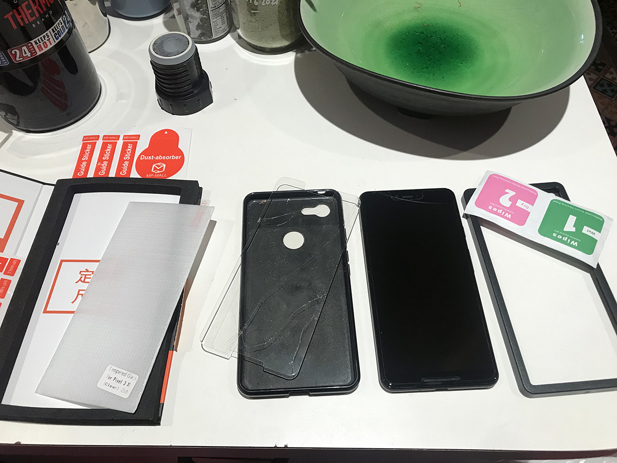 i put on new tempered glass screen protectors for my pixel 3XL phone and ASUS zenpad Z8s tablet. i started with the phone first, which should've been easy, since it came with a handy screen frame to position the protector just right.