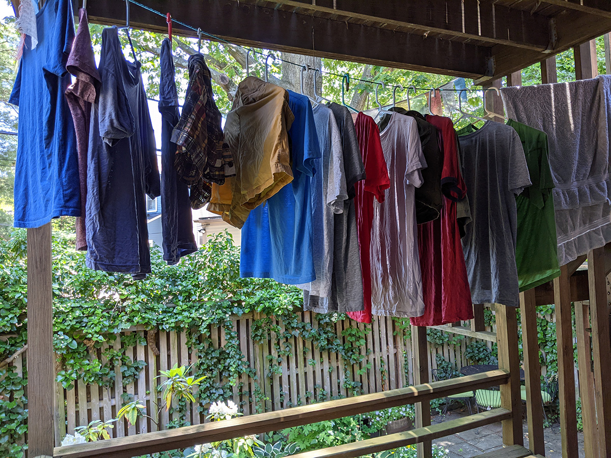 i took down my laundry around 7pm. most of my t-shirts were dry, i found one that had a wet sleeve because it was bunched up when i hung it on the line. a few of my shorts were still wet though, i left them to hang dry inside my kitchen.