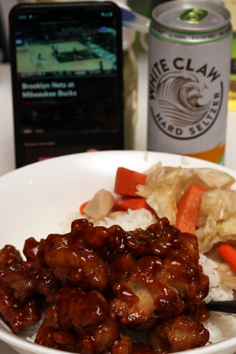i finally got around to making my trader joe's crispy orange chicken. i only cooked half, saving the rest for tomorrow night. i also prepared a cup of jasmine rice in the rice cooker. the bowl seemed to have lost its non-stick capability, so i had a bunch of rice stuck to the bowl that i couldn't remove. i had the orange chicken with some leftover sichuan paocai and a can of white claw, pineapple flavor. my sister gave me an assortment of white claw, it's not bad, but it's pretty gimmicky. of the 5% alcoholic beverages, i prefer the woodchuck amber hard cider, which my local liquor store no longer carries. the orange chicken was pretty good as well, i cooked it just enough for it to be crispy, and the warmed up sauce made everything taste even better.