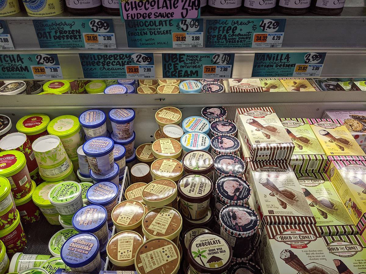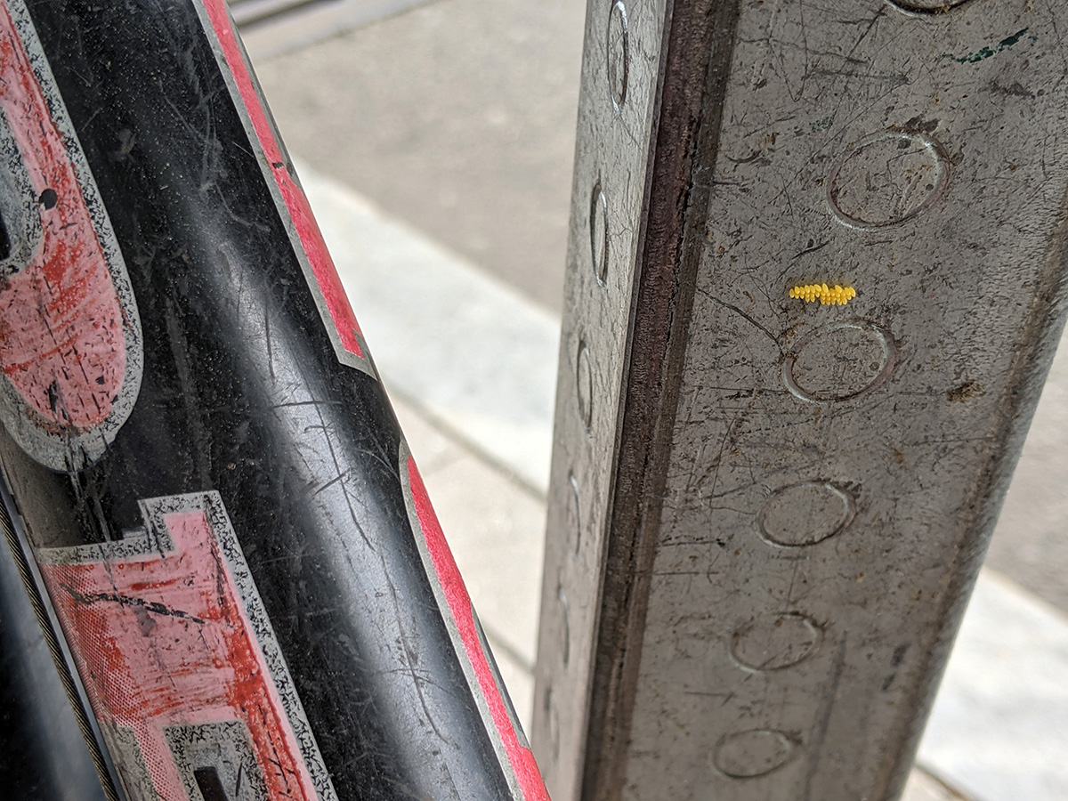 around 1pm i biked down to the allston trader joe's for some groceries. the sky was starting to turn dark, but the weather forecast and the doppler radar all agreed that rain wouldn't begin until after 3pm, so i had some time. while parking my bike to a signpost, i noticed some beetle eggs. they all look the same, but if i had to guess, maybe ladybugs. i picked up a bag of frozen mandarin chicken and two bags of giant peruvian inca corn. i also looked for their ube ice cream. there was a tag for it ($2.99) but it seems like they were all sold out.