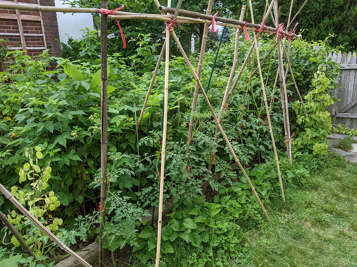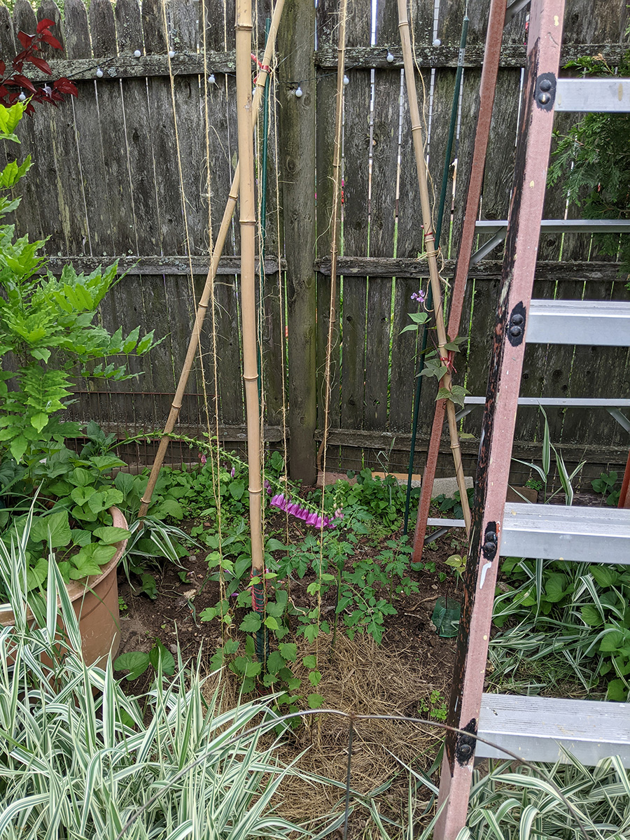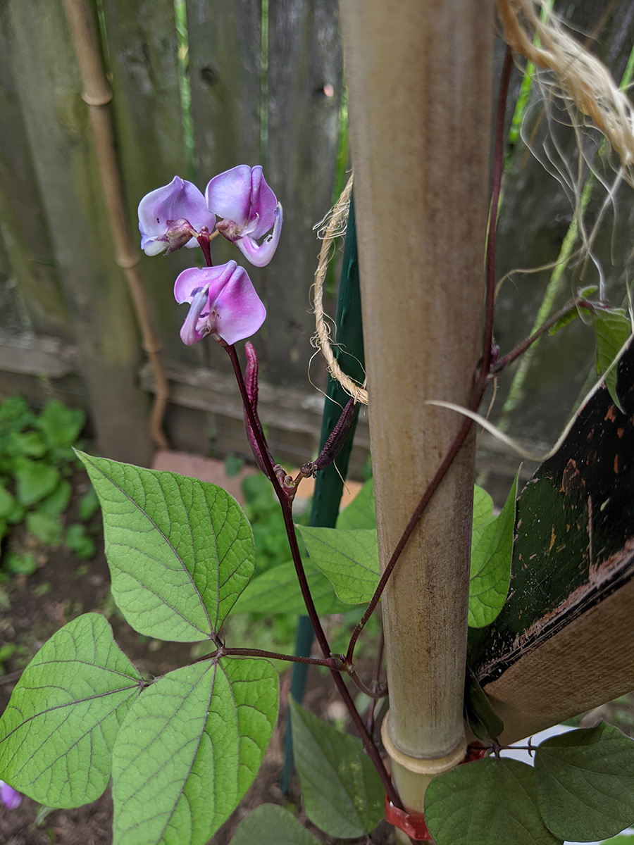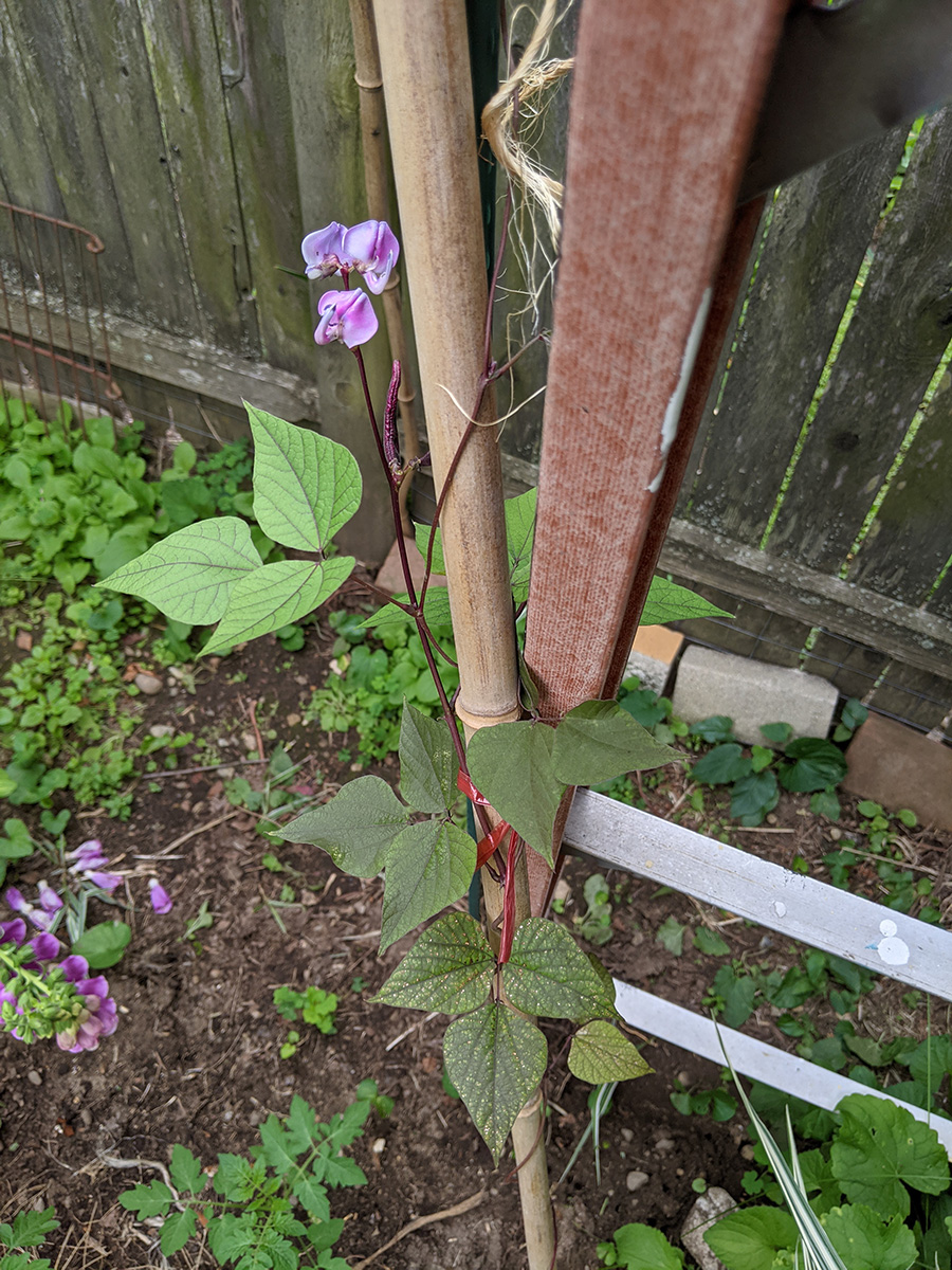 i packed up my things and left for belmont via motorcycle. my father and i spent the rest of the morning touring the backyard. he told me one of the hops bines has died, the tendril must've gotten kinked during transport. the bottom part of the bine is still alive and will probably produce a new tendril, so we're not too worried. he did have a hyacinth bean wrapped around the hops trellis until i told him it was better if the bean had its own trellis otherwise it'll just take over the hops. so he made a teepee trellis using some bamboo poles, and managed to wrap some long beans onto the new trellis as well.