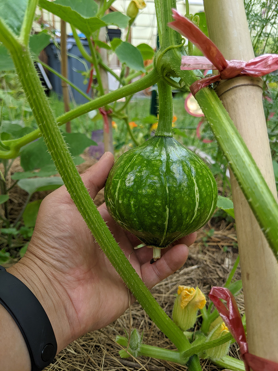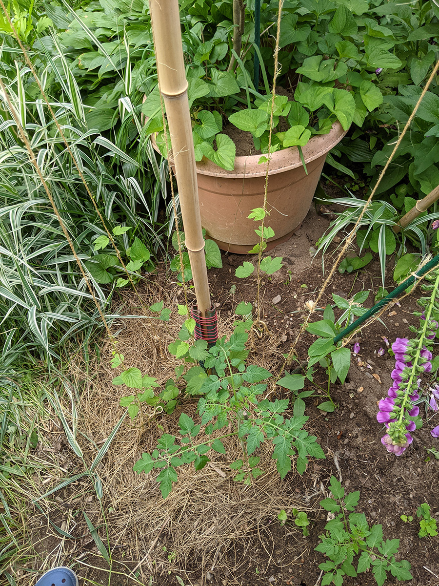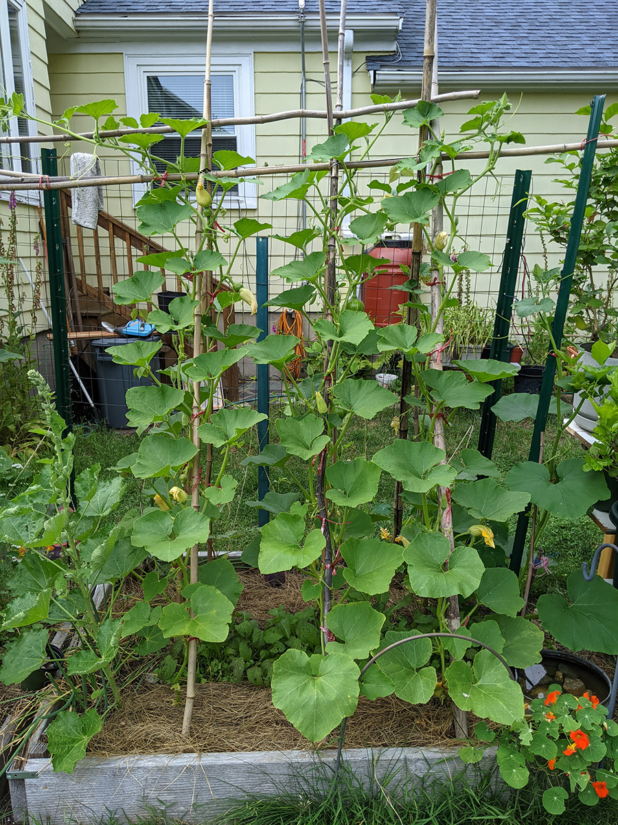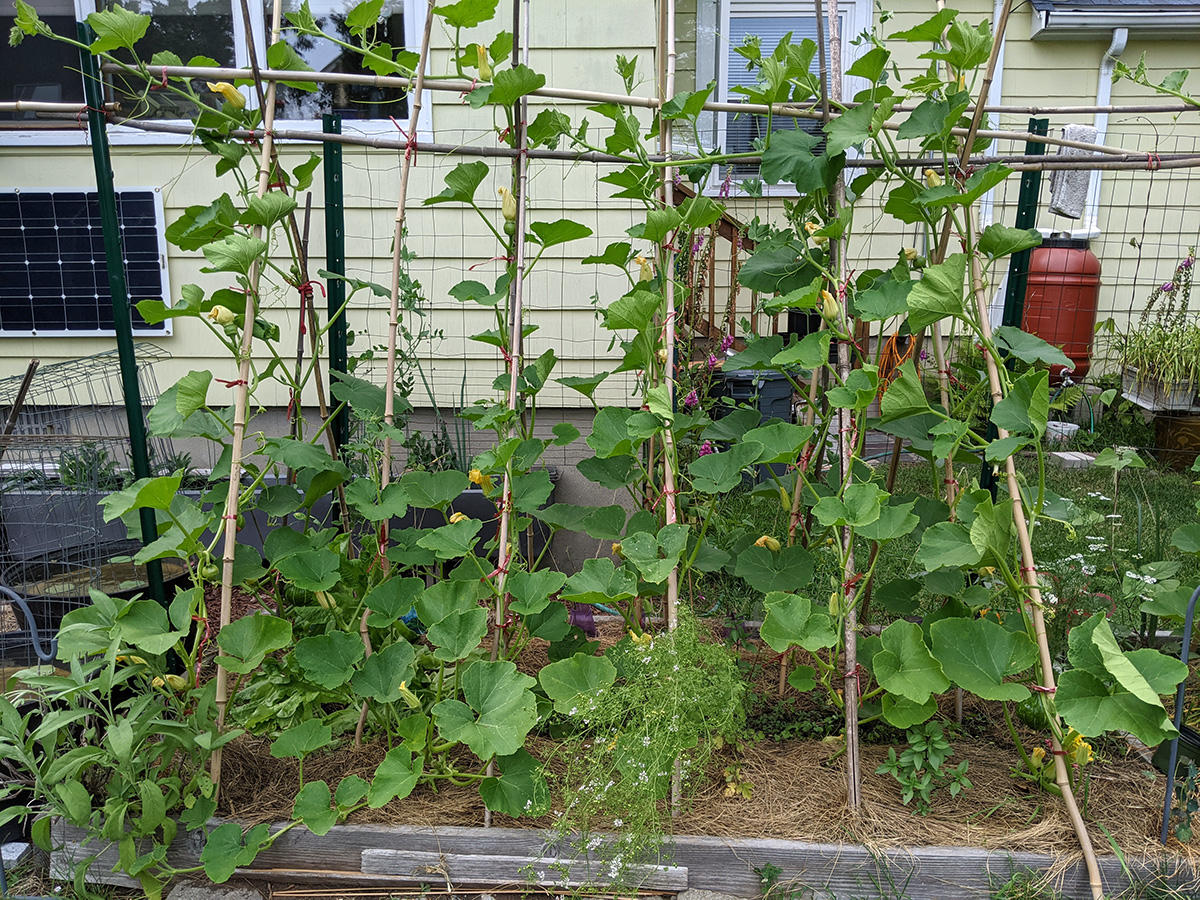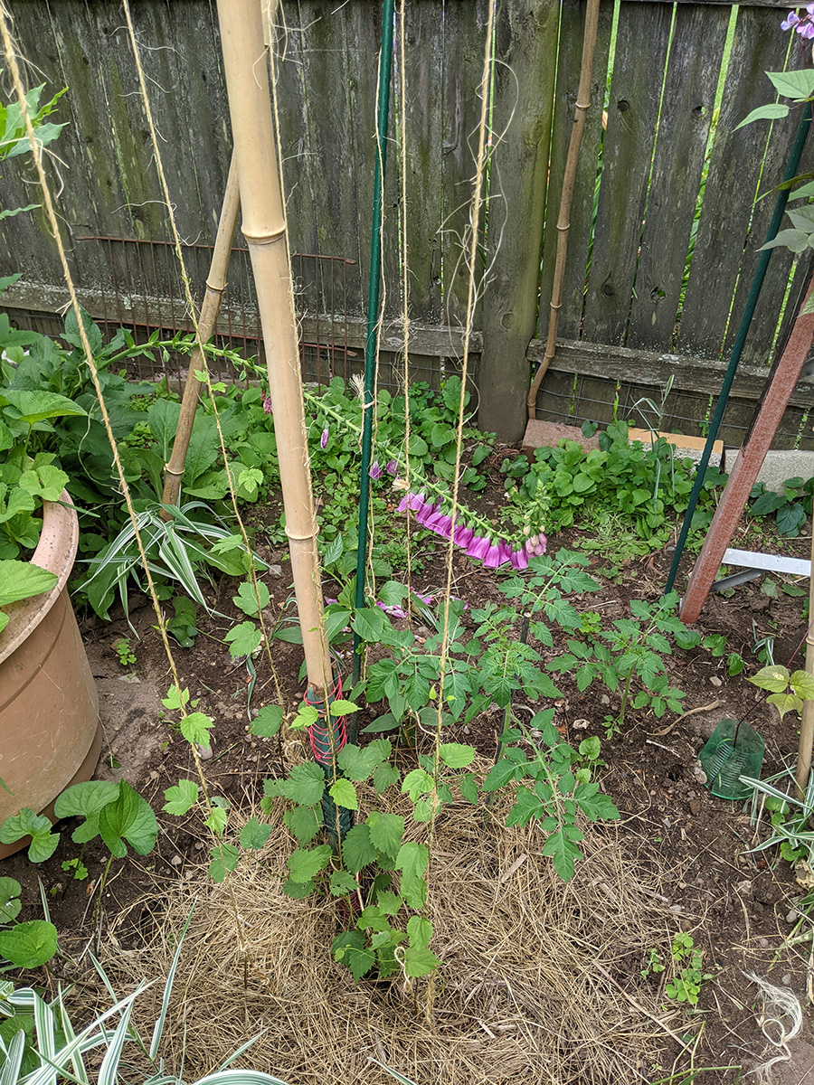 i packed up my things and left for belmont via motorcycle. my father and i spent the rest of the morning touring the backyard. he told me one of the hops bines has died, the tendril must've gotten kinked during transport. the bottom part of the bine is still alive and will probably produce a new tendril, so we're not too worried. he did have a hyacinth bean wrapped around the hops trellis until i told him it was better if the bean had its own trellis otherwise it'll just take over the hops. so he made a teepee trellis using some bamboo poles, and managed to wrap some long beans onto the new trellis as well.