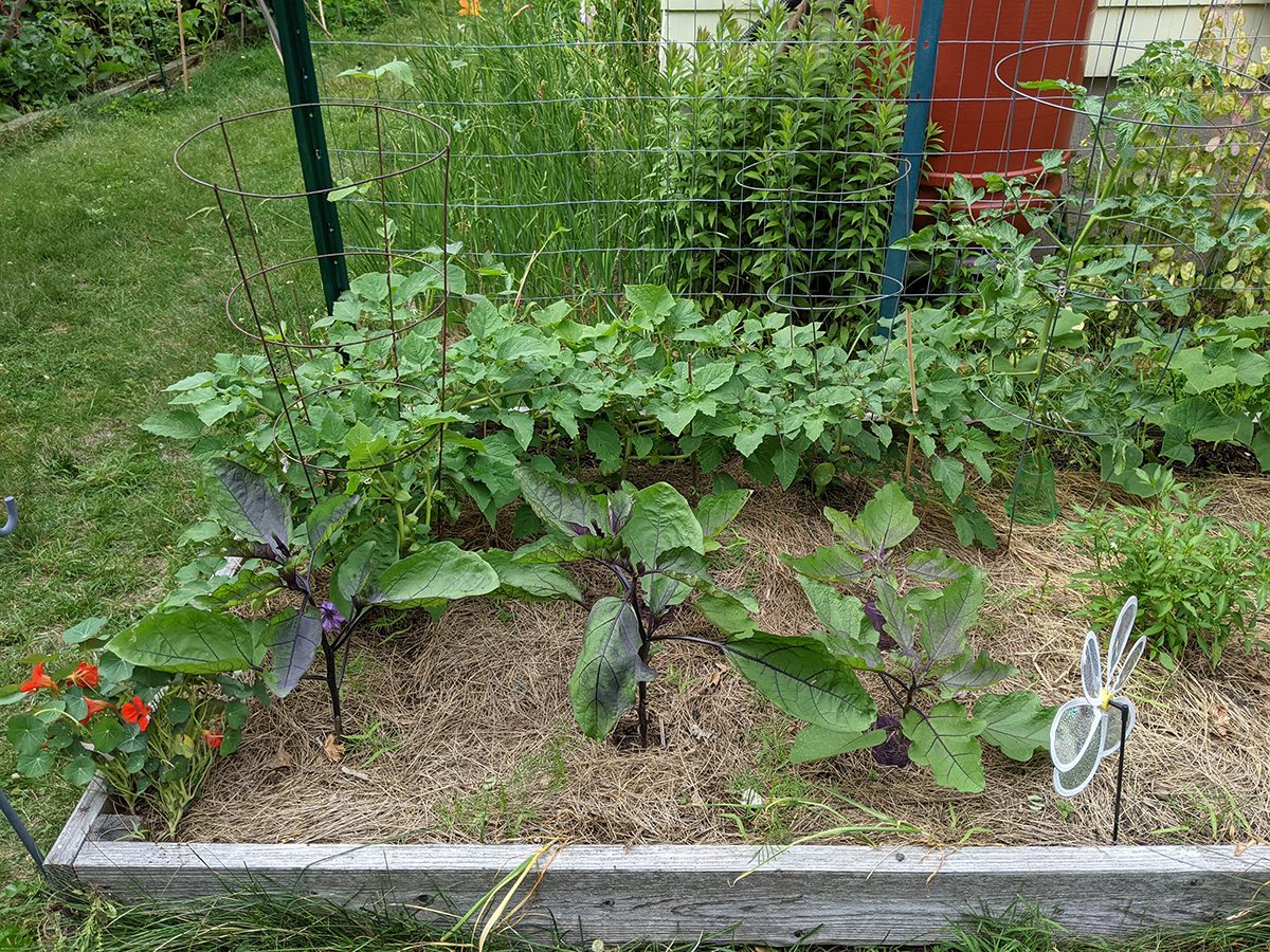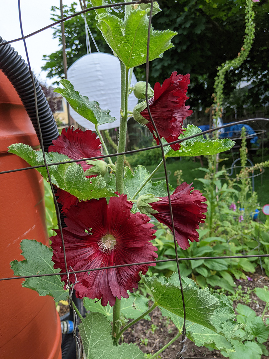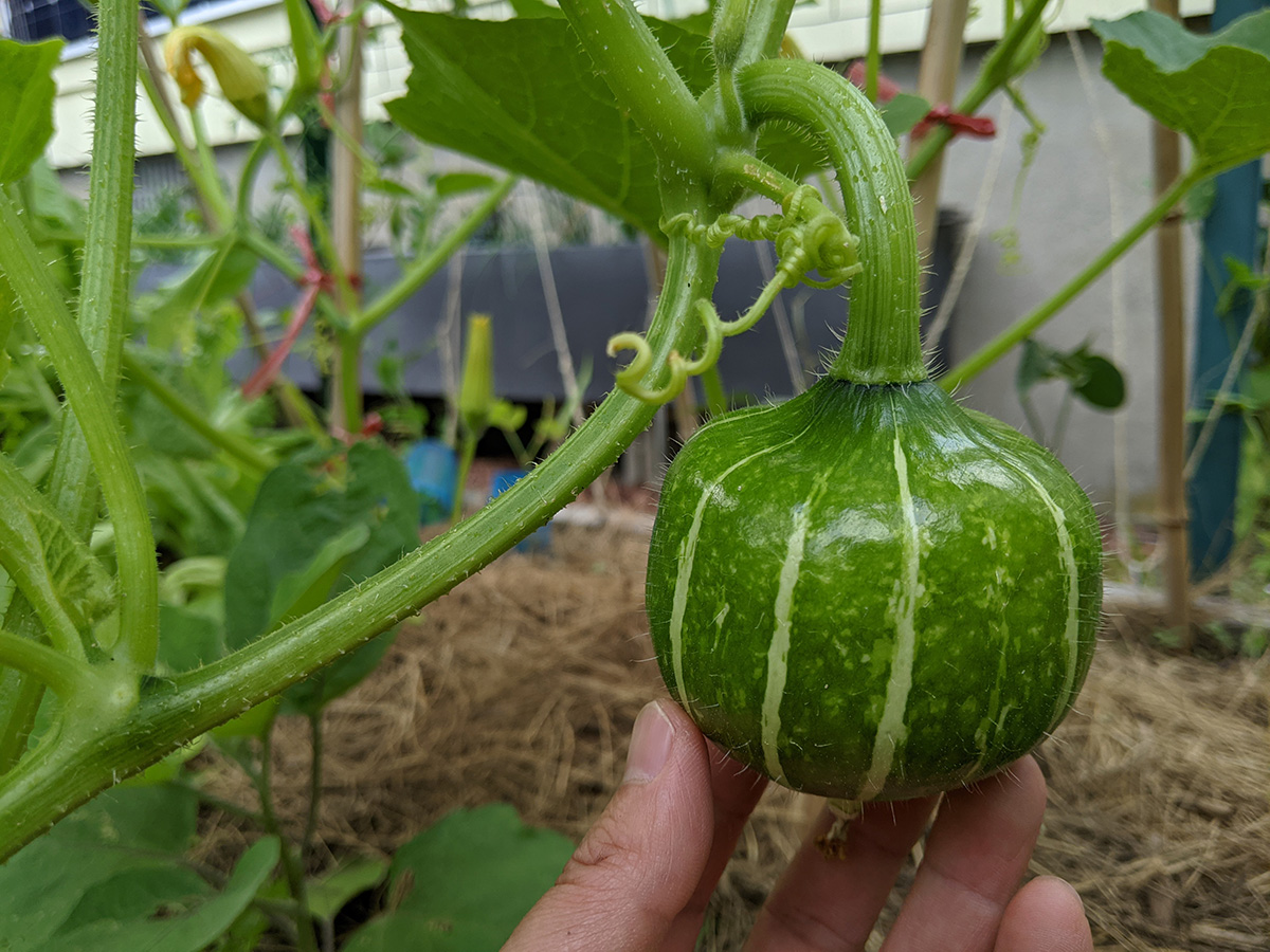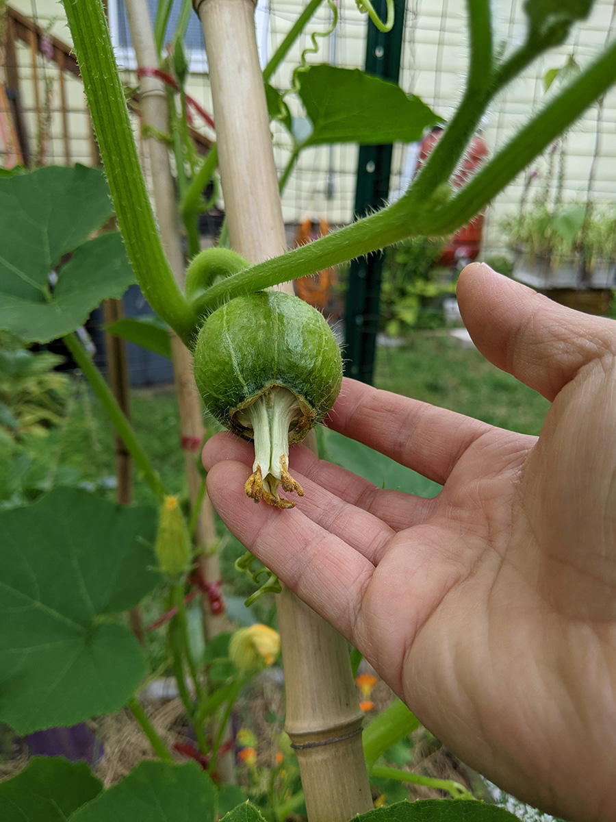 i packed up my things and left for belmont via motorcycle. my father and i spent the rest of the morning touring the backyard. he told me one of the hops bines has died, the tendril must've gotten kinked during transport. the bottom part of the bine is still alive and will probably produce a new tendril, so we're not too worried. he did have a hyacinth bean wrapped around the hops trellis until i told him it was better if the bean had its own trellis otherwise it'll just take over the hops. so he made a teepee trellis using some bamboo poles, and managed to wrap some long beans onto the new trellis as well.