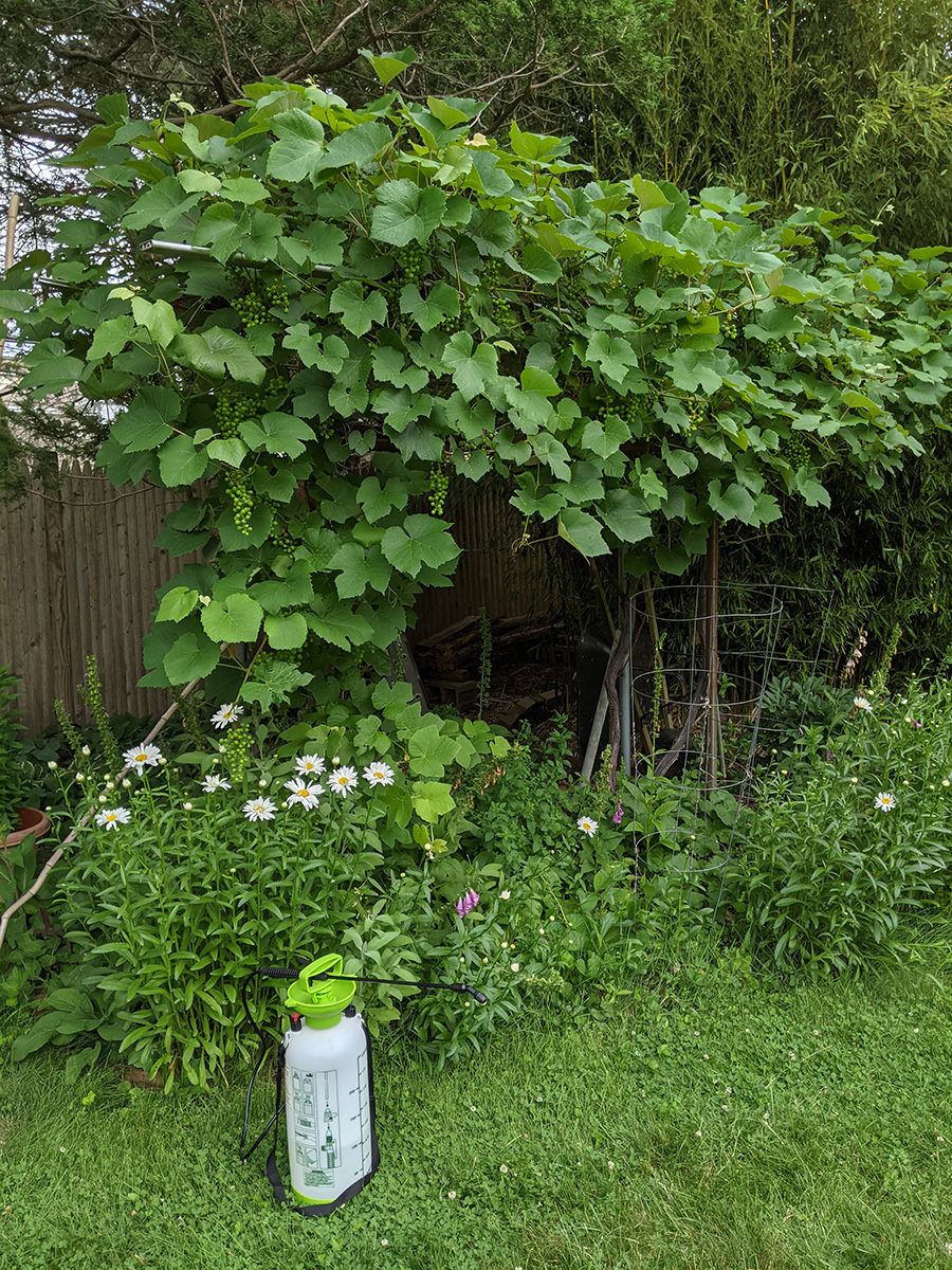 as it was hot outside, i stayed indoors until later in the afternoon when the sky became overcast and the temperature seemed to have cooled down. i mixed up 0.8 gallons of immunox solution (with 2 tbsp of concentrated immunox) and sprayed the grapevines. this was the 5th and last application. if immunox really works, i shouldn't be seeing any black rot infections. otherwise it's back to the drawing board. one problem i see is we didn't prune the grapes early in the season. next season, we'll cut everything back so it's just the main trunks and a few main vines. there were plenty of concord grapes, but it's like this every year: at first everything seems healthy, but as the summer progresses, developing grapes will turn black until they're all infected and we're left with no grapes. this is my first year using artificial fungicide (immunox), so it's still a work-in-progress.