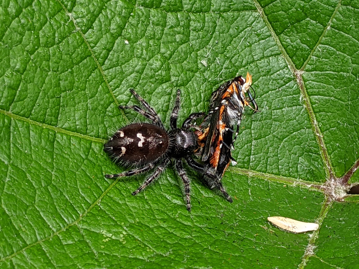 while spraying the grapes, i saw a large jumping spider with a squash vine borer moth in its jaws. so that's 3 dead SVB's today! i tried to spray around the spider and its meal but still managed to get some immunox on them. the spider must not like the smell of immunox because it later abandoned the moth.