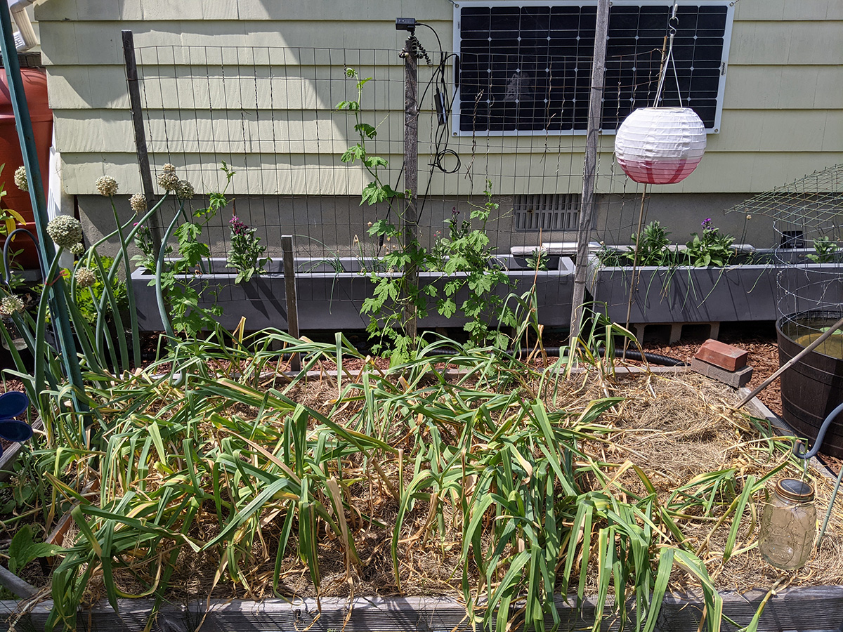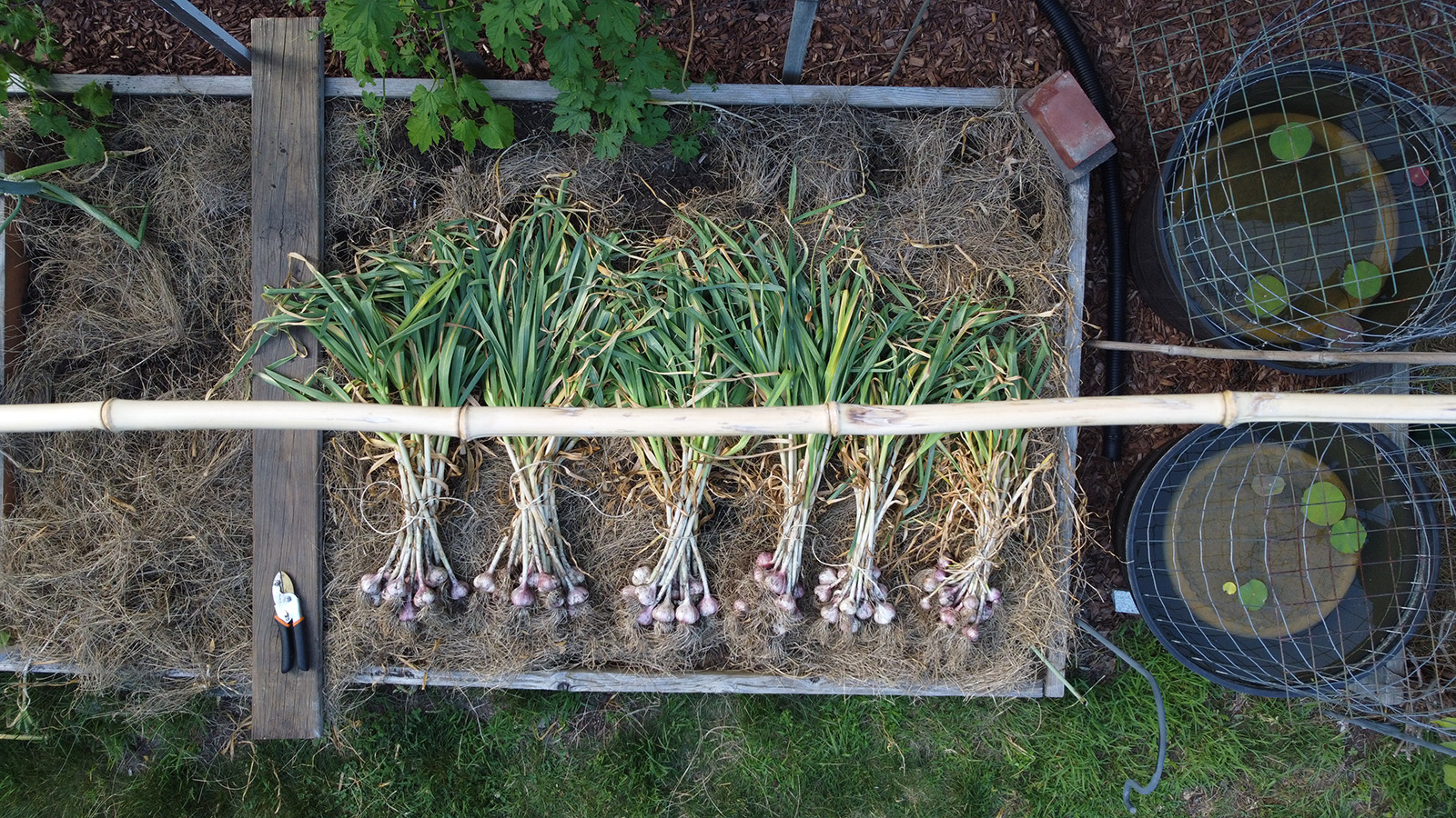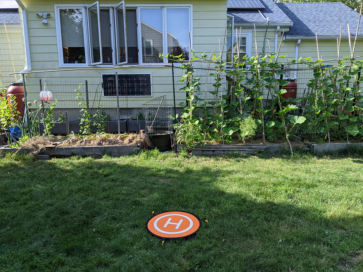 at one point i wanted to get a photo of all my garlics. the best way to do that was from the sky, so i grabbed my drone. this was my first time using the 22" collapsible launch pad ($10). i staked it to the ground with the 3 provided plastic pins so it didn't fly away in the breeze. speaking of which, it was very windy, and i was afraid the drone would get blown away and crash into the house as it wobbled and struggled noisily in the sky. using the iphone 7 i had zero connection issues. afterwards i sent it into the air to take some snapshots before bringing it back down again. the large orange circle made for an identifiable landing target, and it also meant i didn't have to land in the grass and risk clipping the propellers on a bumpy landing surface. a part of me wishes it was a bit bigger (maybe 30") for a more generous landing area but that would make it too conspicuous.