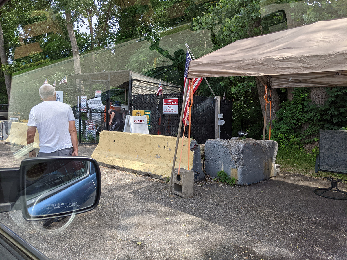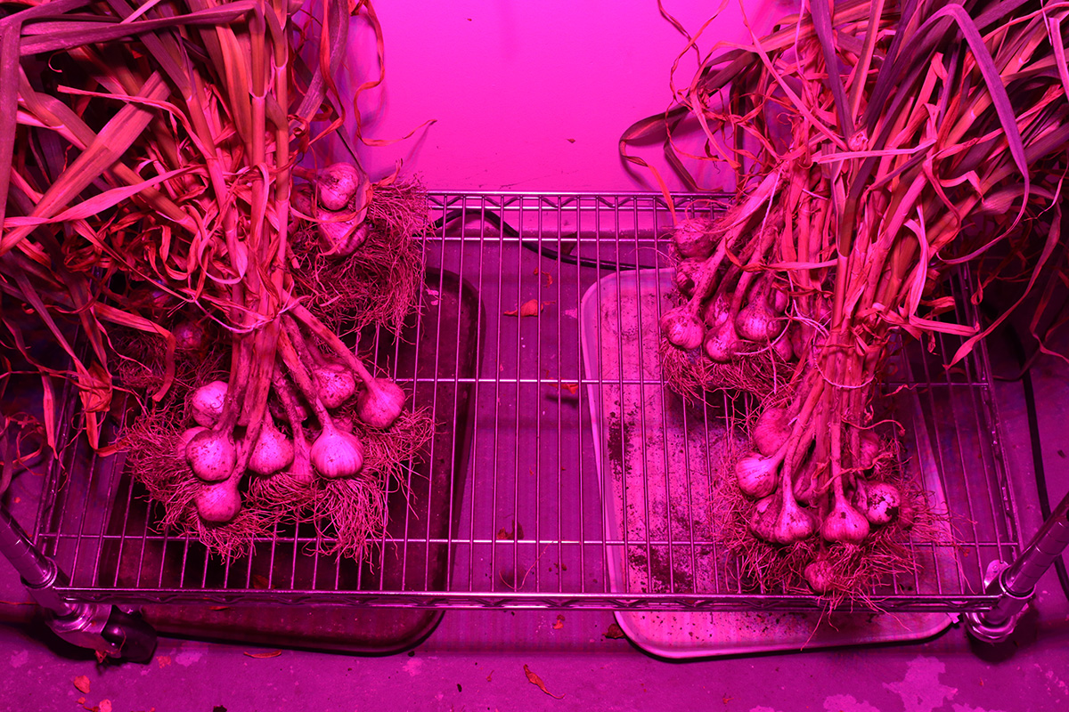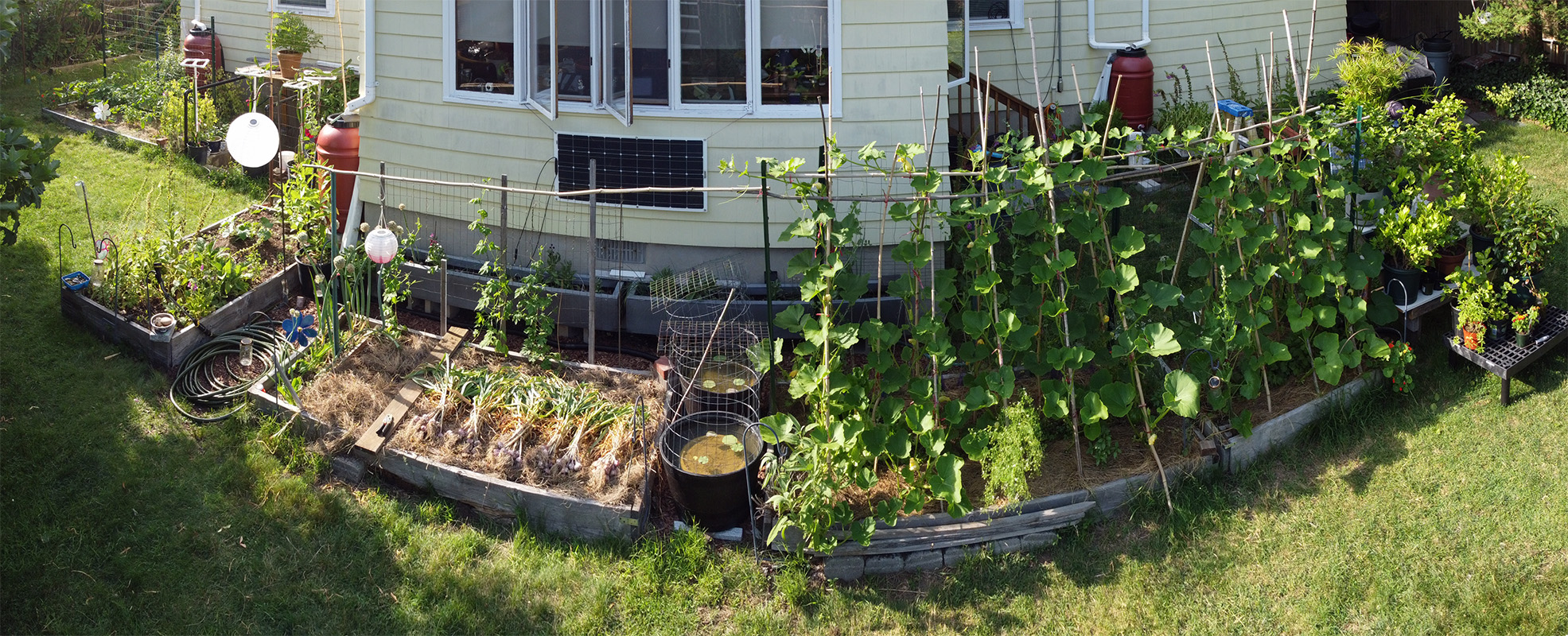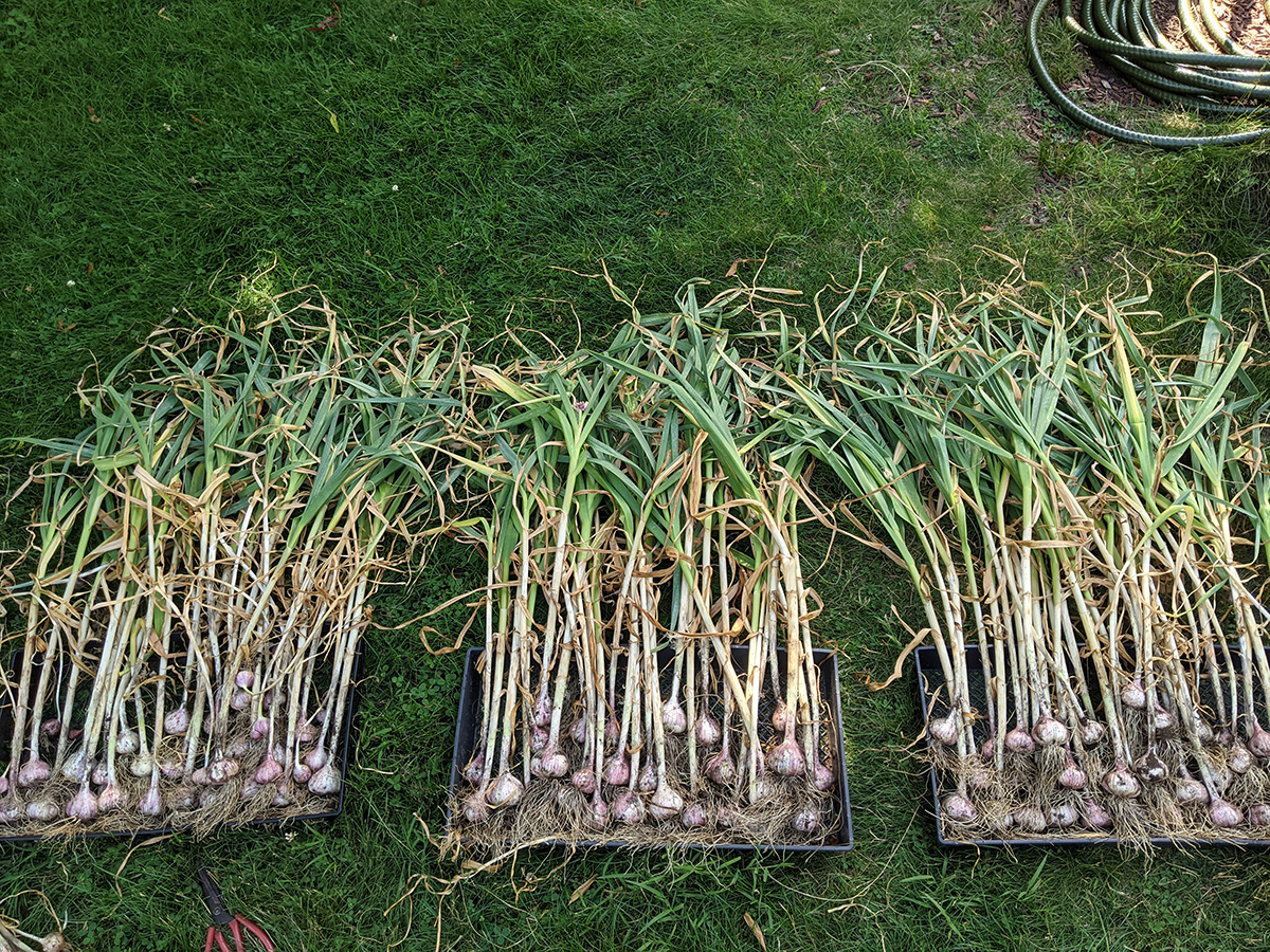 at one point i wanted to get a photo of all my garlics. the best way to do that was from the sky, so i grabbed my drone. this was my first time using the 22" collapsible launch pad ($10). i staked it to the ground with the 3 provided plastic pins so it didn't fly away in the breeze. speaking of which, it was very windy, and i was afraid the drone would get blown away and crash into the house as it wobbled and struggled noisily in the sky. using the iphone 7 i had zero connection issues. afterwards i sent it into the air to take some snapshots before bringing it back down again. the large orange circle made for an identifiable landing target, and it also meant i didn't have to land in the grass and risk clipping the propellers on a bumpy landing surface. a part of me wishes it was a bit bigger (maybe 30") for a more generous landing area but that would make it too conspicuous.