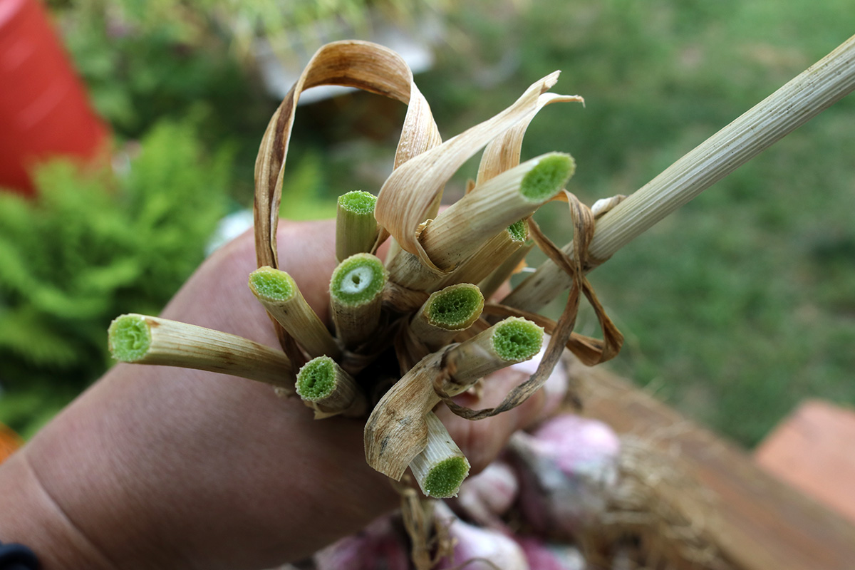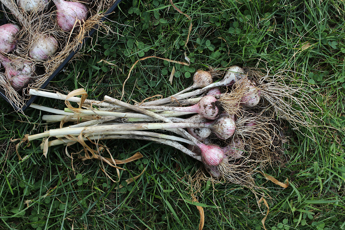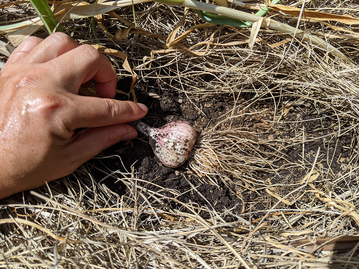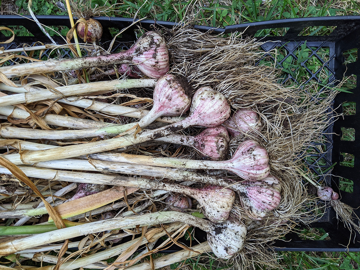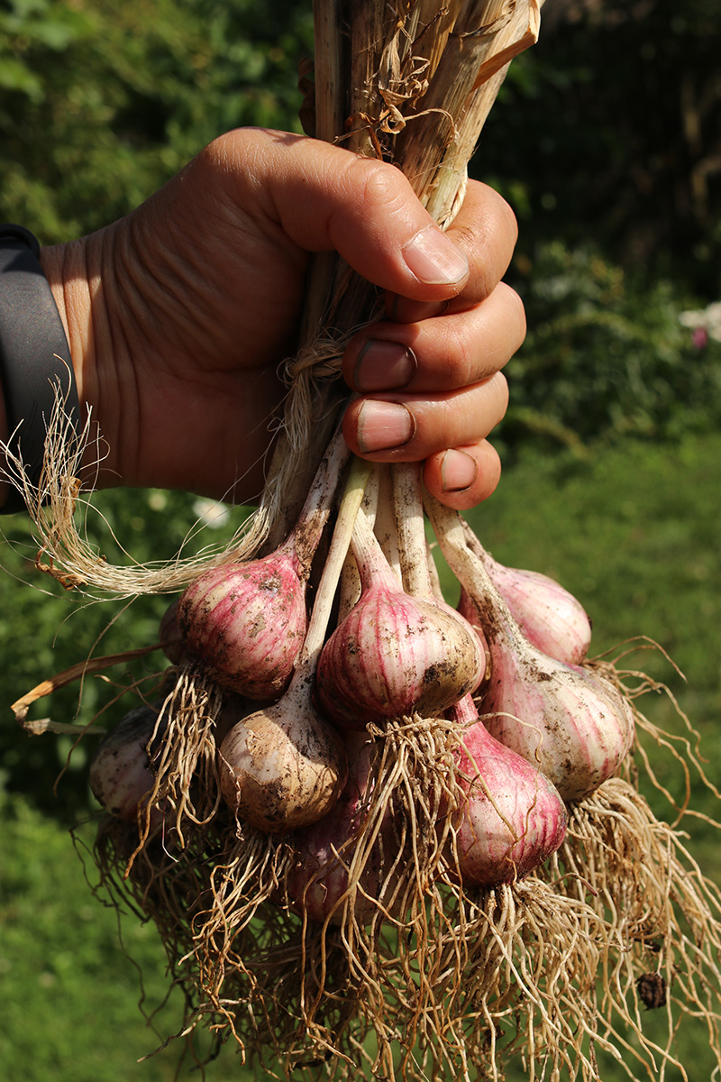 the garlics this year have also started to fall over the past few weeks, which is another sign they should be harvested. when i finally dug them up, they were bigger, but still not the giant size i was hoping for. i think the only way to do that is to have very good nutrient soil. i scooped some fertilizer when i planted the cloves and during the spring i side dressed with nitrogen-rich chicken manure, but that still wasn't enough. after i finished harvesting about a third, my father came out to help my dig out the rest.