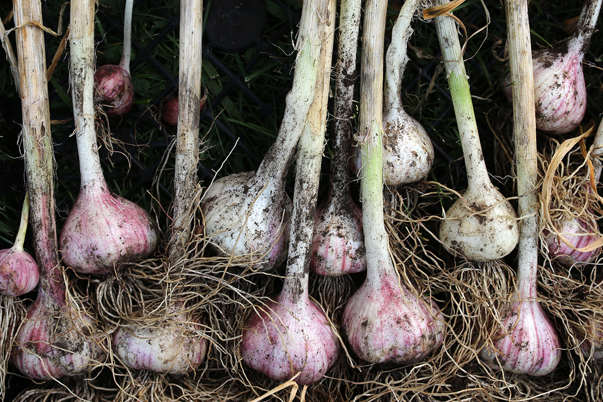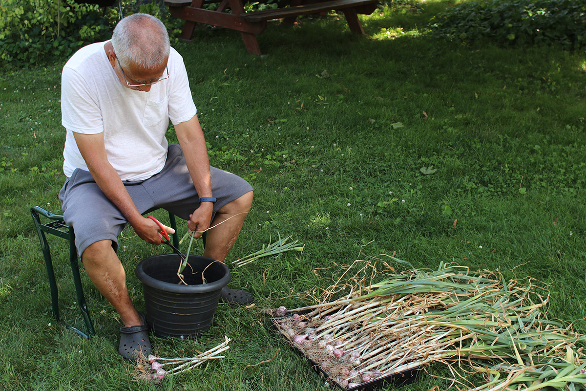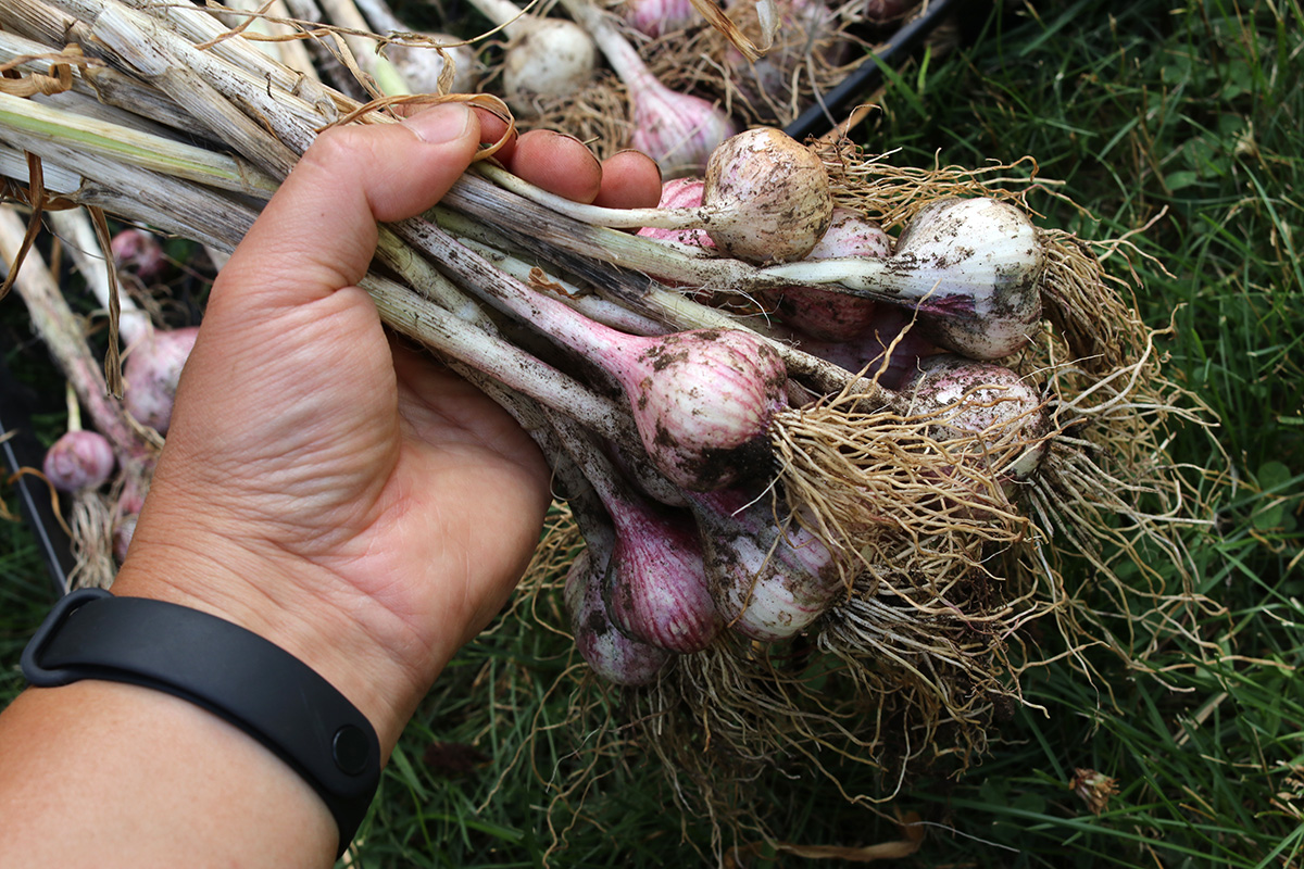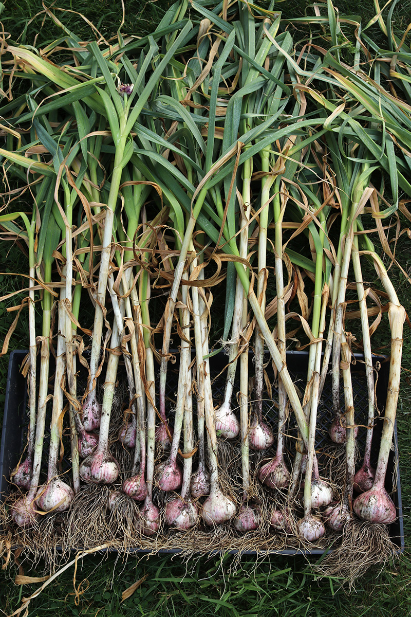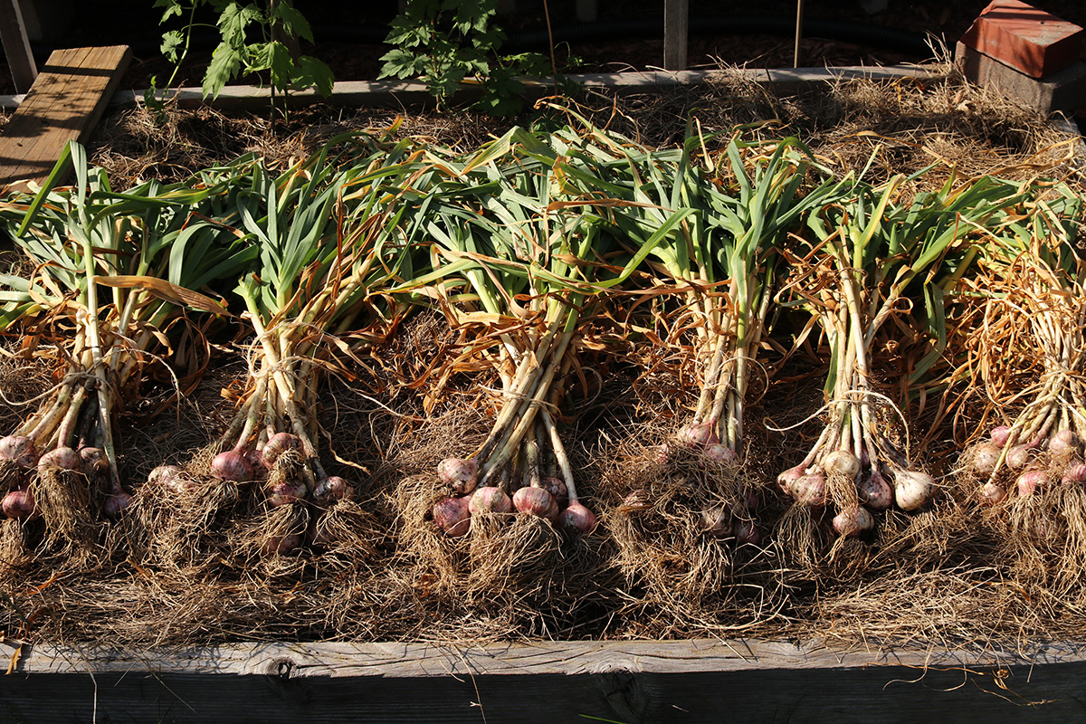 the garlics this year have also started to fall over the past few weeks, which is another sign they should be harvested. when i finally dug them up, they were bigger, but still not the giant size i was hoping for. i think the only way to do that is to have very good nutrient soil. i scooped some fertilizer when i planted the cloves and during the spring i side dressed with nitrogen-rich chicken manure, but that still wasn't enough. after i finished harvesting about a third, my father came out to help my dig out the rest.