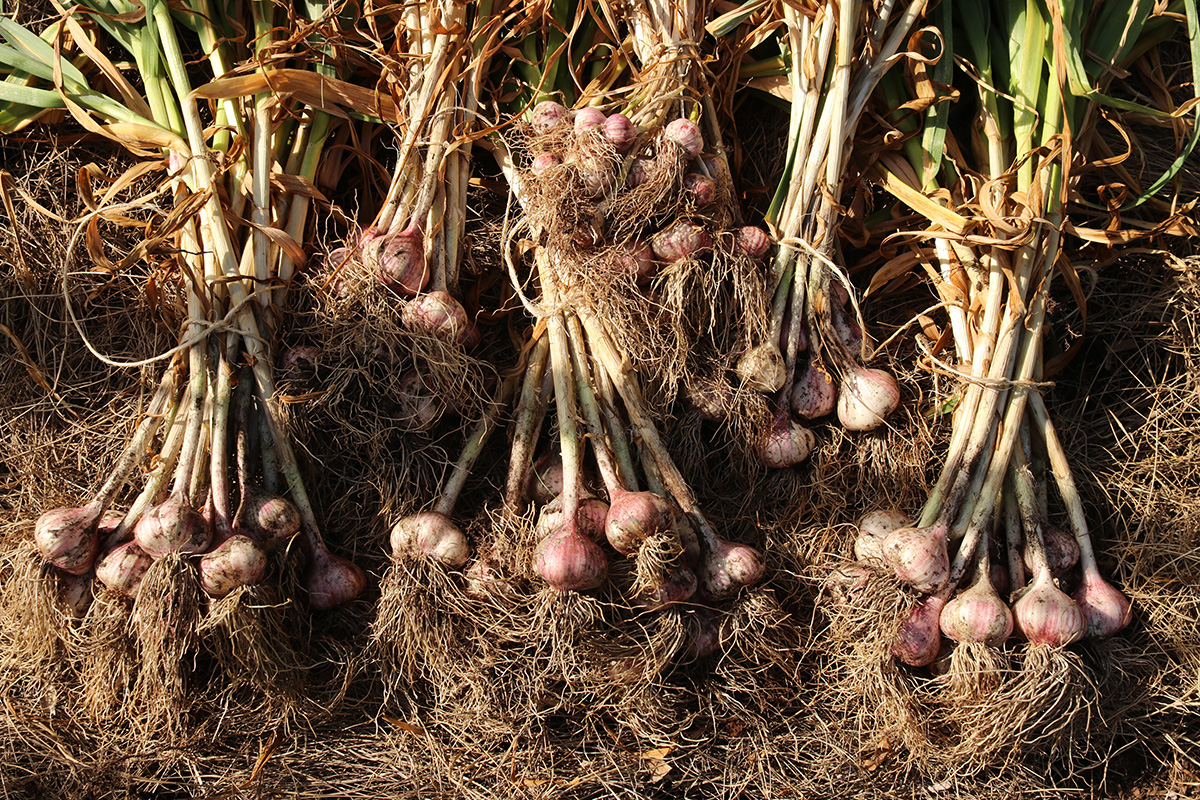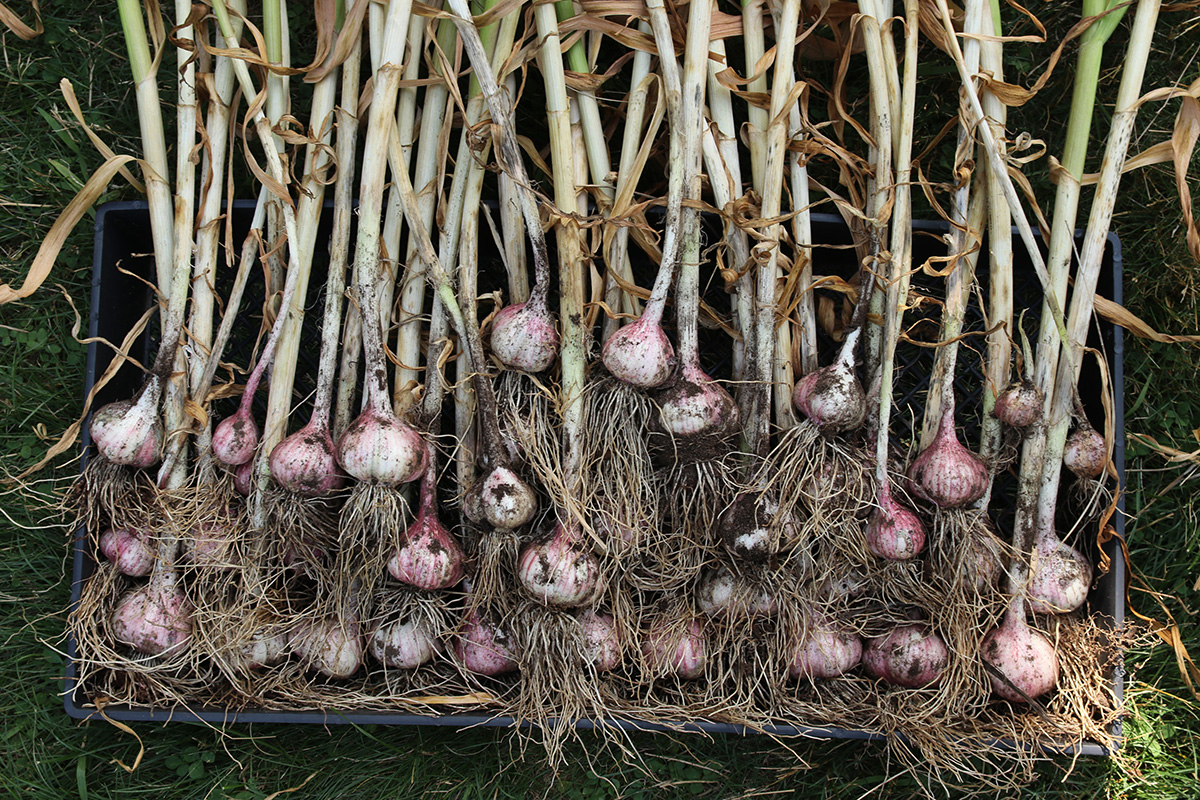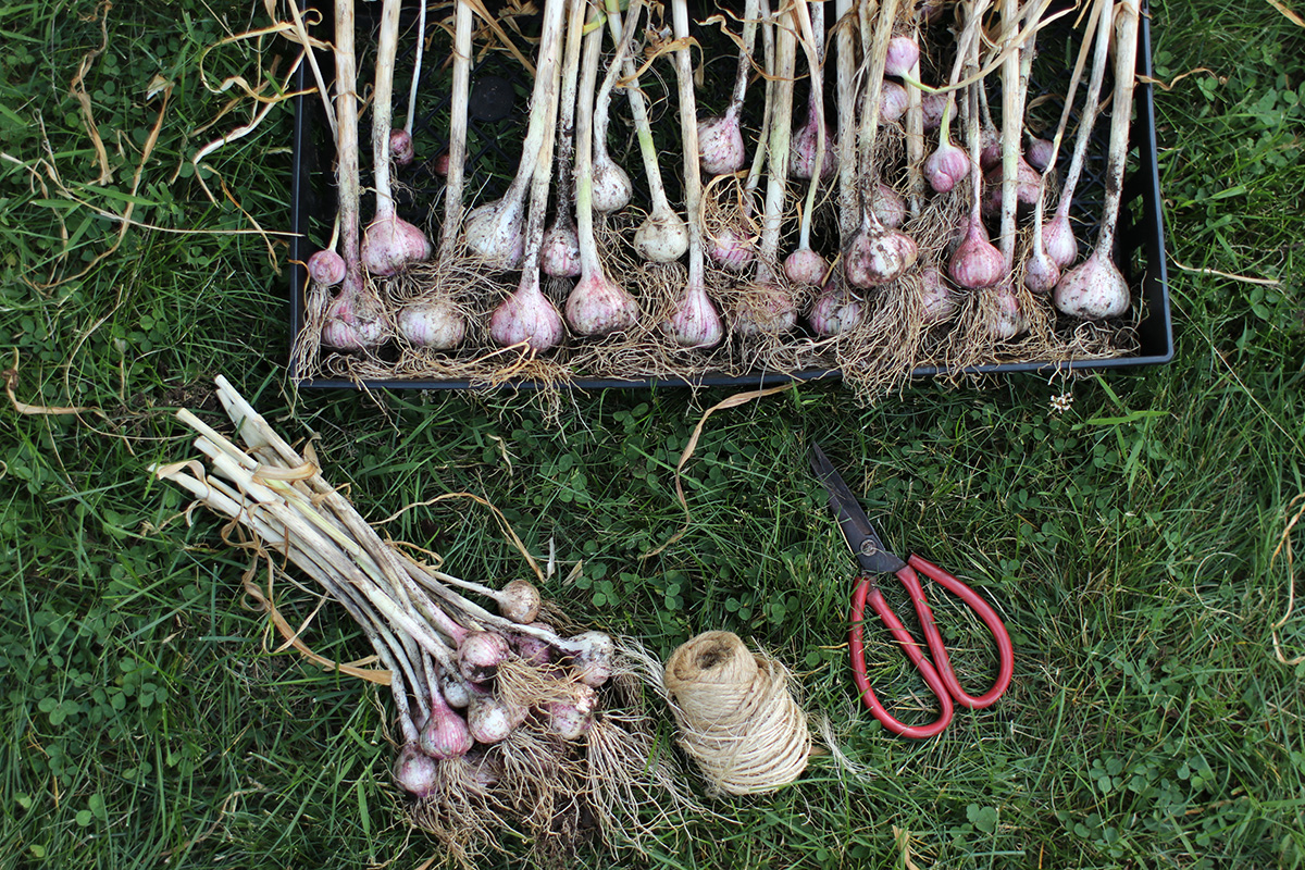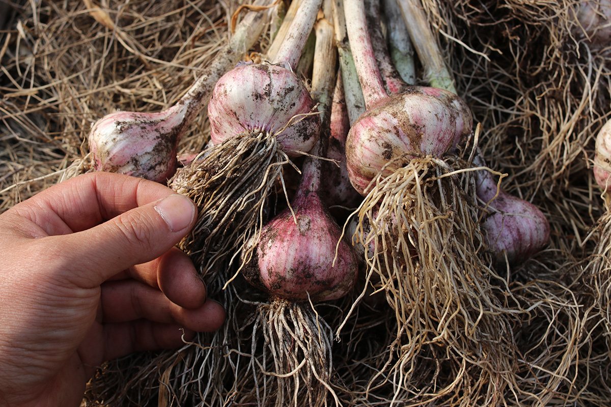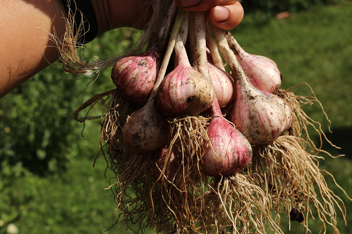 the garlics this year have also started to fall over the past few weeks, which is another sign they should be harvested. when i finally dug them up, they were bigger, but still not the giant size i was hoping for. i think the only way to do that is to have very good nutrient soil. i scooped some fertilizer when i planted the cloves and during the spring i side dressed with nitrogen-rich chicken manure, but that still wasn't enough. after i finished harvesting about a third, my father came out to help my dig out the rest.