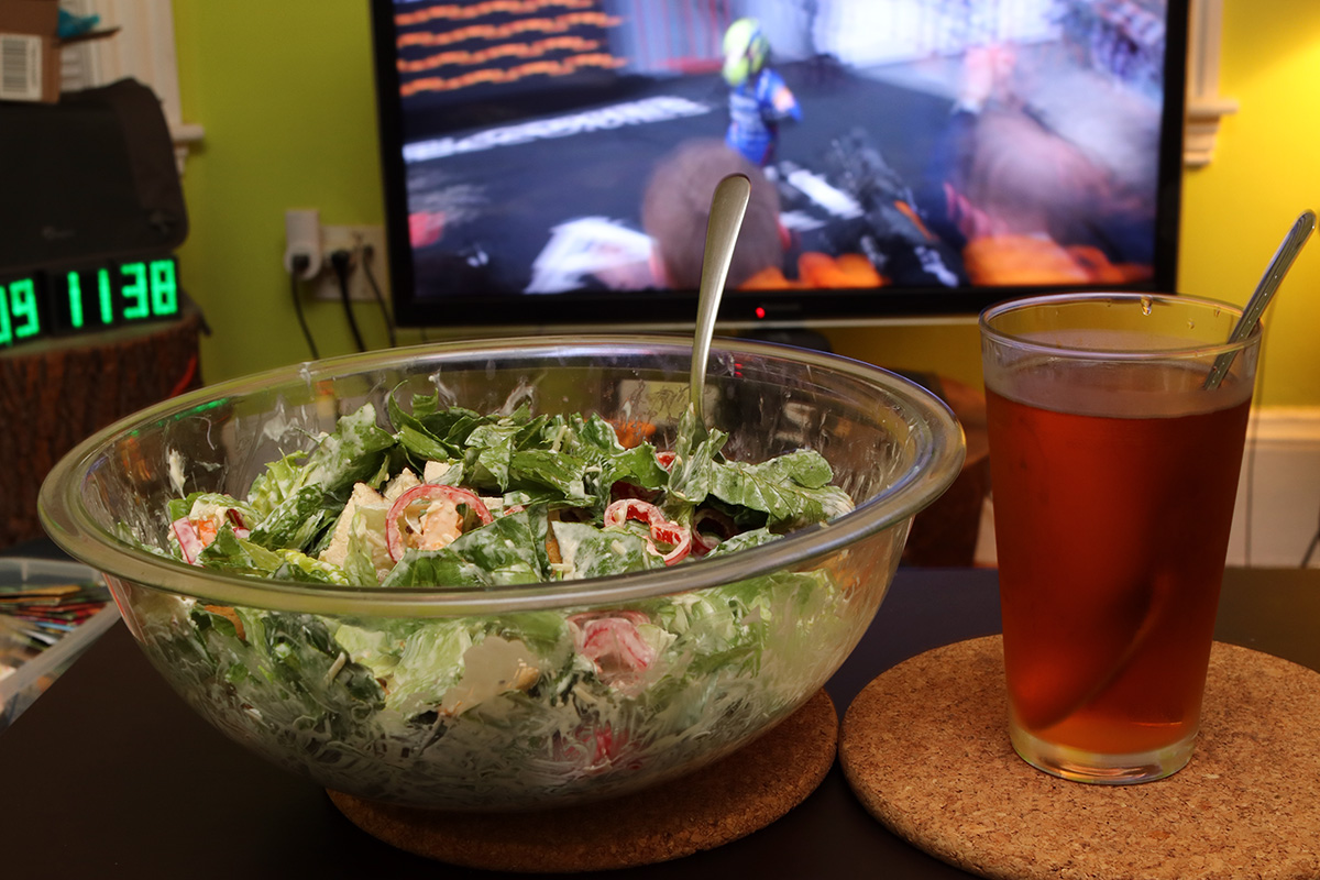 when evening came i made my chicken caesar salad. i grilled 2 large chicken breasts in the pan instead of the foreman grill. i've found although that foreman grill is convenient, it wastes a lot of the meat juices and it's easy for the the chicken to end up too dry. grilling them in the pan - although more of a hassle, preserves the juices. i also tried some of the mio sweet tea liquid water enhancer ($3). it did taste like sweet tea, but having tried the 4C half & half (ice tea & lemonade) water enhancer, i prefer the 4C more. the mio just has a mellow sweetness, while the 4C has an acidic bite to it which i like better.