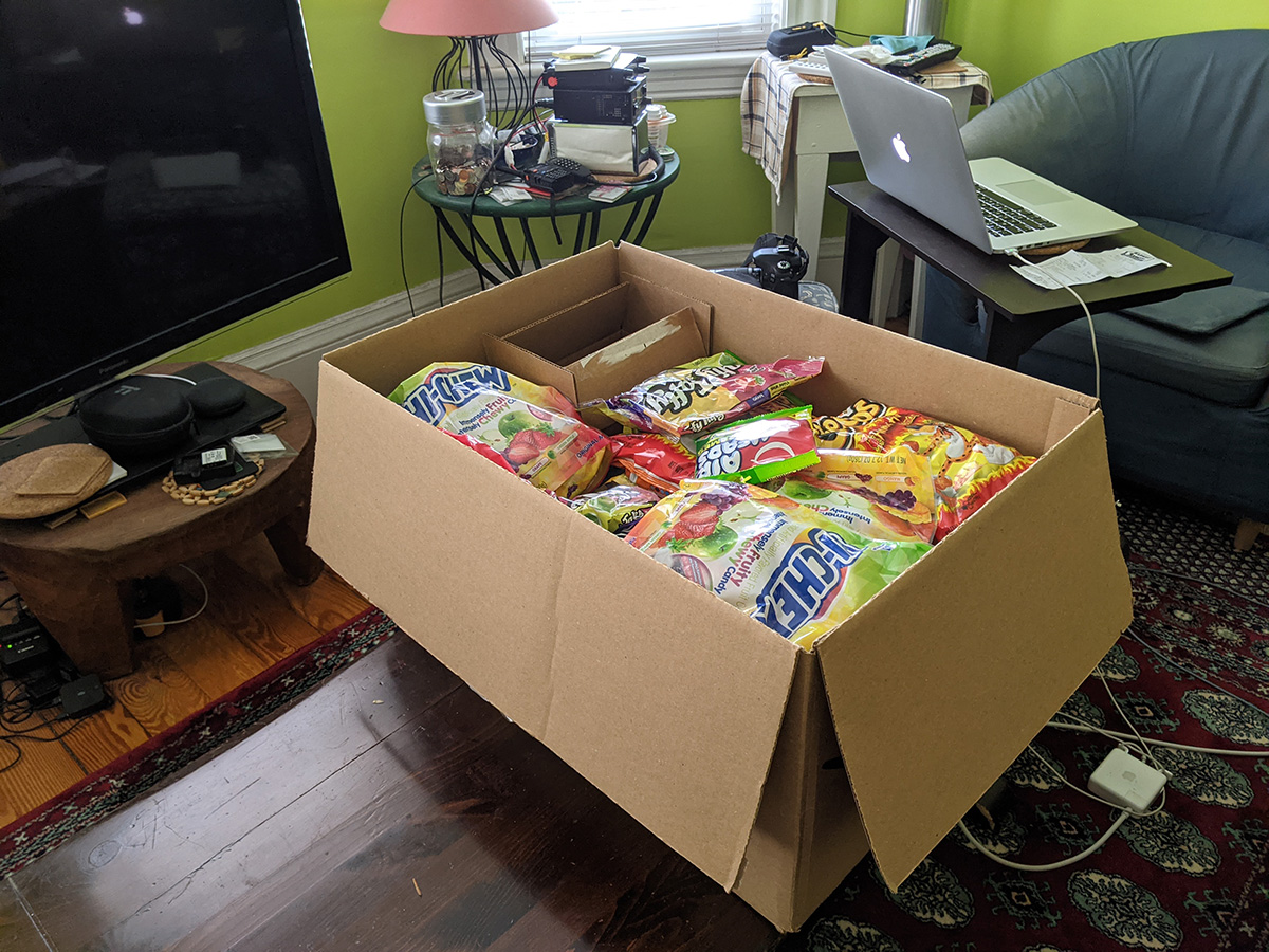 i spent some time packaging up frances' shipment (i had to upgrade to a bigger box, fortunately i was prepared) then entering in the necessary info to print out some USPS shipping labels. the box weighed 32 lbs., and the shipping cost $150. all that candy was like shipping bags of cement.