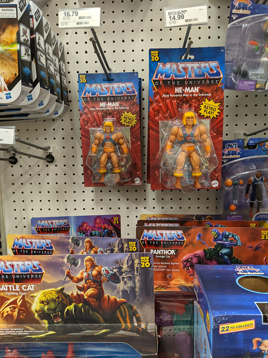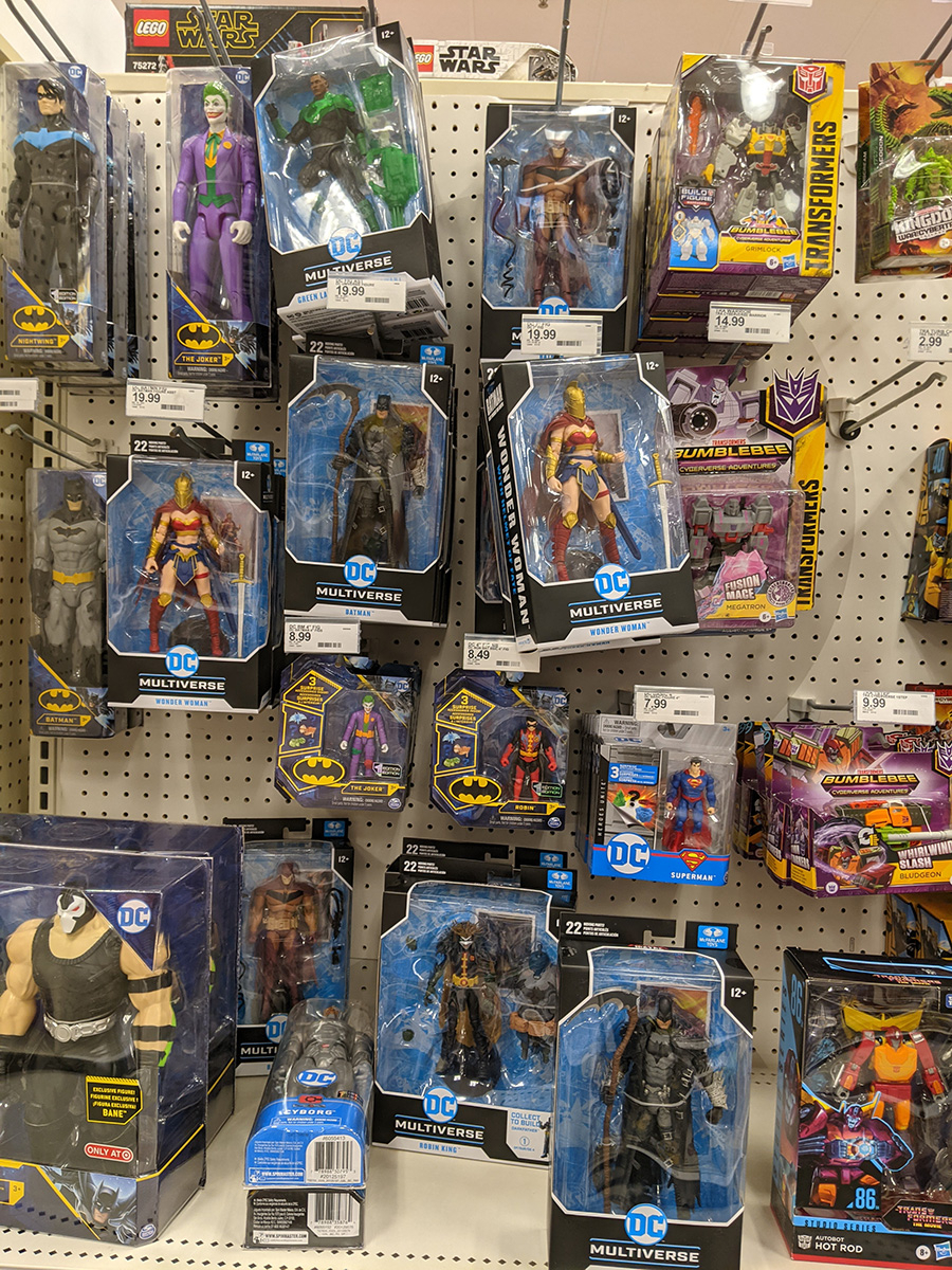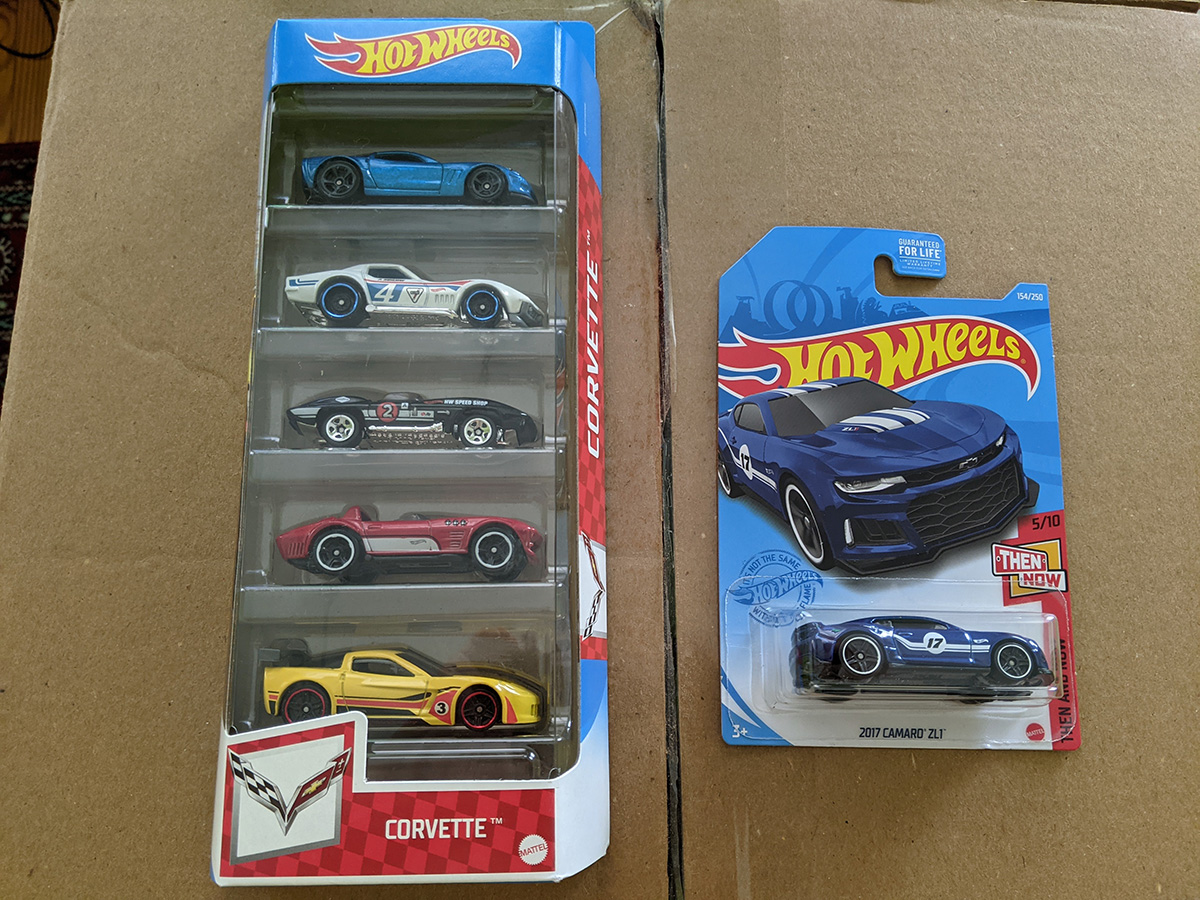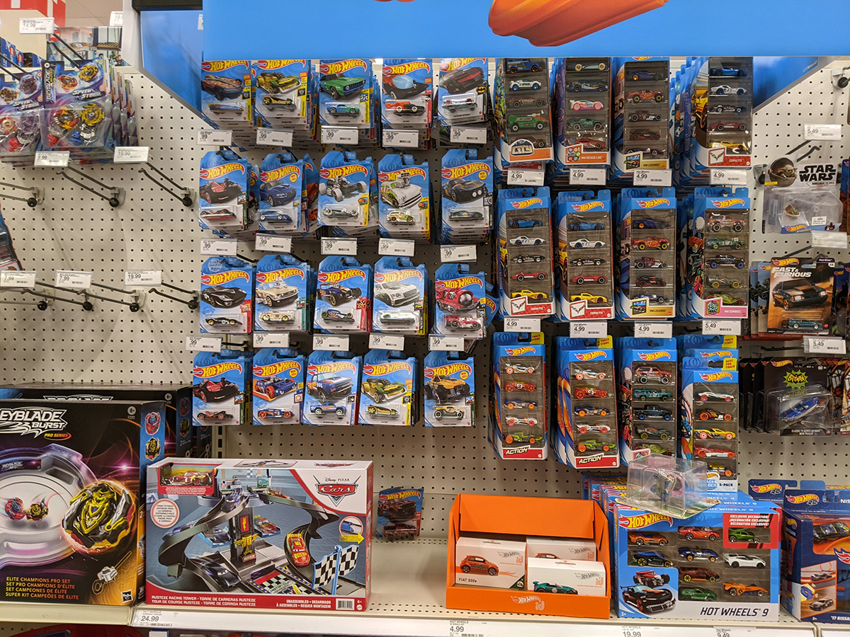 searching for hot wheels for lars gave me a legitimate excuse to hang around the toys department, otherwise i'd feel weird. i was surprised how cheap they were, 99¢ per car (although the special edition cars were more expensive, as much as $5.50/car). i didn't see any fast & the furious vehicles, so i ended up just getting some sports cars: a set of corvettes ($5) and a single camaro ($1).