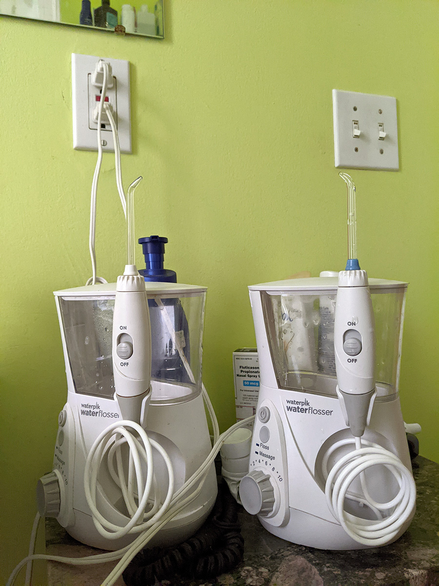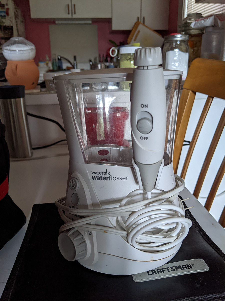 as for the waterpik water flosser i found earlier, it's the exact same model i have. it's not cheap either - it currently sells for $66 on amazon. the owner removed the tip - not that i would've used it, that would be too gross. fortunately the waterpik i have came with a spare tip, so i just attached it to the found waterpik. after cleaning it bit (it probably been outside for at least a day, caught in the rain, a waterpik is not one of those devices people want to recycle and reuse), i filled up the tank and gave it a test. it took a few seconds for the water to come out, but it worked just as well as my waterpik. one thing i wanted to see was if the 30 second indicator worked on this found model. there's supposed to be 3 vibrations after every 30 second to remind you to switch mouth quadrant, but there's only 2 on mine. this one that i found only had 2 vibrations as well, so it seems to be a design flaw.
