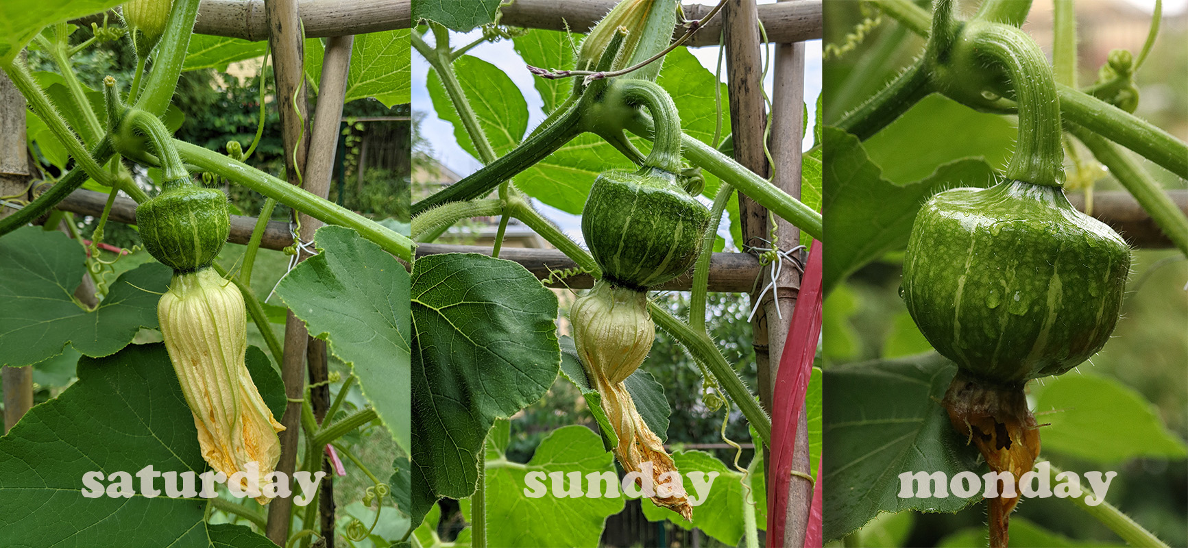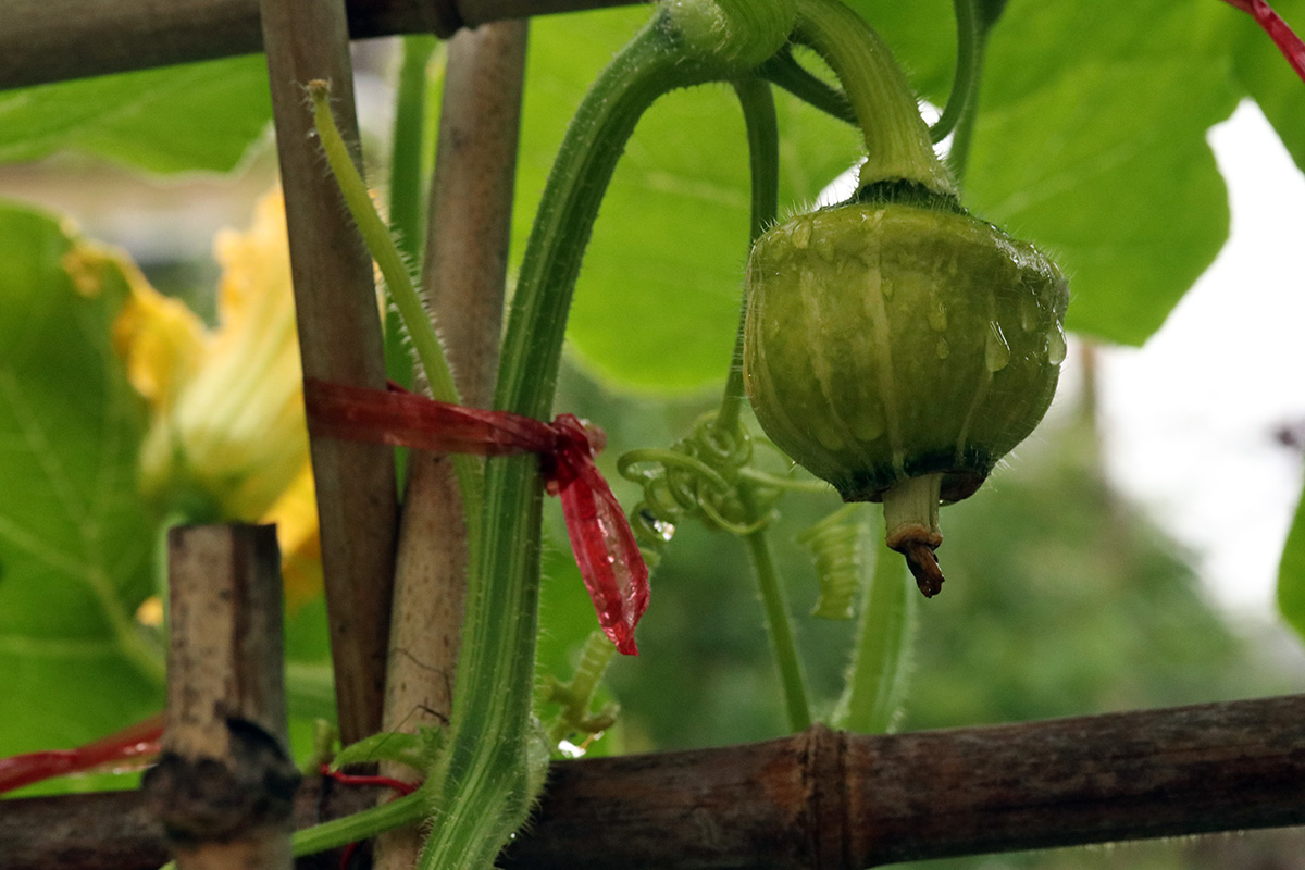 the fruit on the squash vine growing outside of the raised bed continues to get bigger, i've been following its progress since saturday. as its first and only fruit, it has the capacity to grow very big, and the soil out of the raised bed seem to be better with nutrients so there's hope it can be a big one.