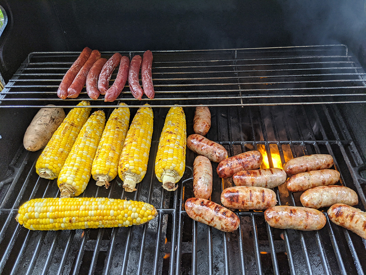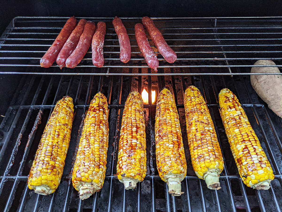 my father started barbecuing in the afternoon: taiwanese sausages, italian sausages, corn, and shrimps. i helped with applying korean barbecue sauce on the corn when they were close to done. we ended up having dinner very early at 4pm. my father gave me a ride back to cambridge around 6pm. it'd started to rain again a little bit, enough that we had to use the windshield wipers.