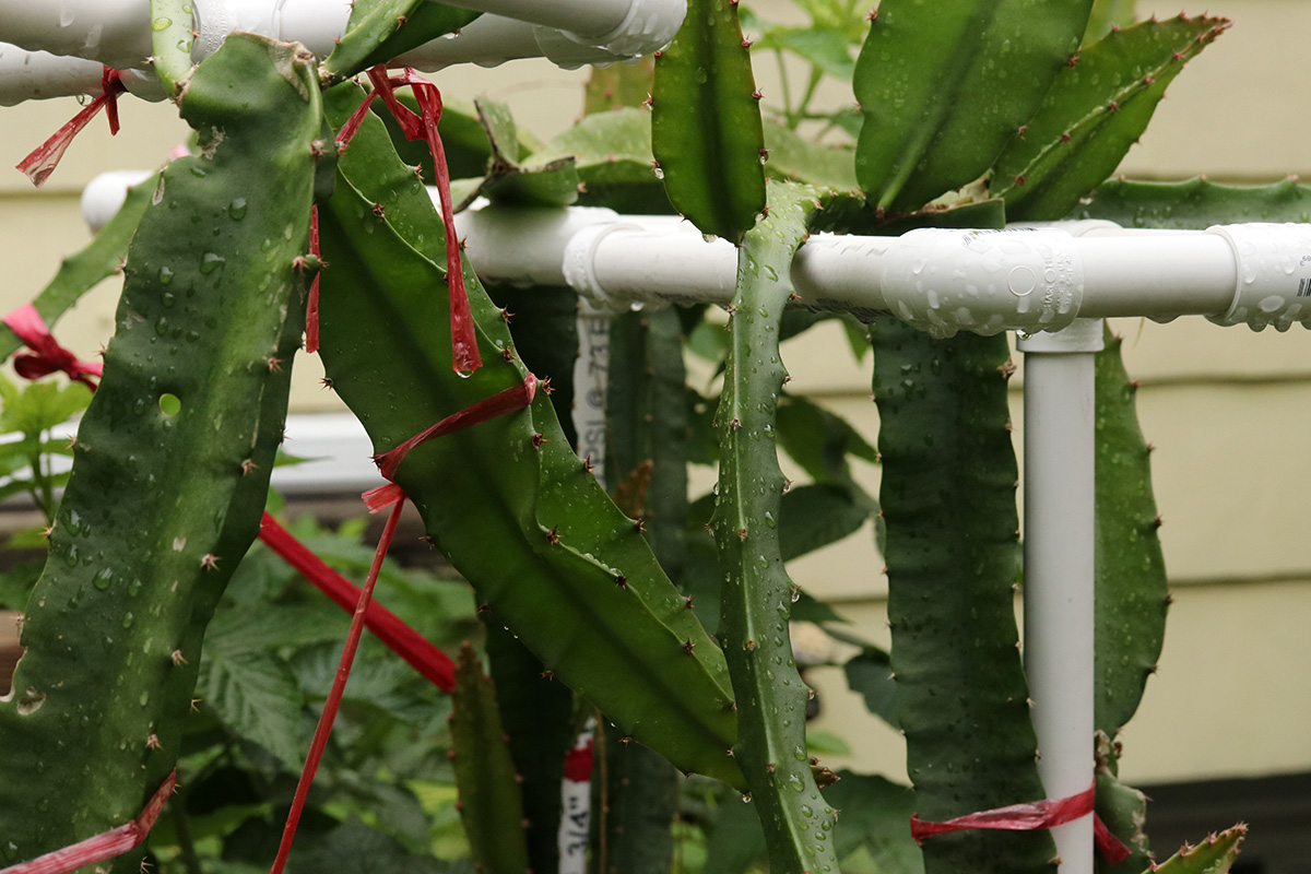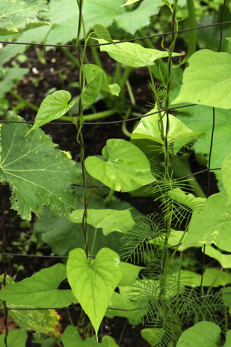 we have an abundance of climbing plants this year: cucumbers, bitter melons, buttercup squashes, hyacinth beans, cashmere hops, snap peas, long beans, morning glories, moonflowers, and cypress vines. the long beans are not doing well at all. my father thinks its birds, i think its insects, but something seems to be eating the hell out of the beans, totally defoliating them in the process.