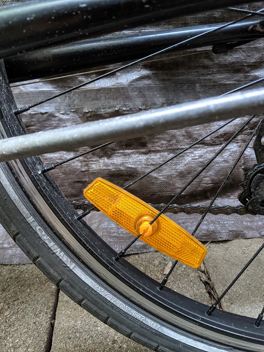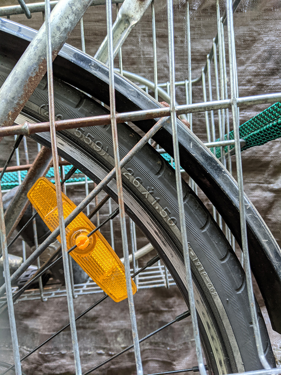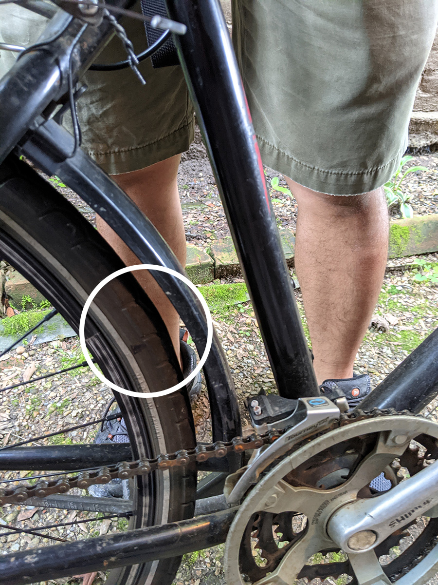 i noticed it when i was coming back from the cafe: there's a sidewall bulge in my rear tire. when the tire exploded last week while i was taking frances' package to the post office, the damage apparently was a lot more than just the inner tube. i can still ride, but for safety concerns, i should probably replace the tire. this was a pretty good tire, the kenda kwest 26x1.50. it came with reflective sidewalls, which i think was a mistake on the seller's part.