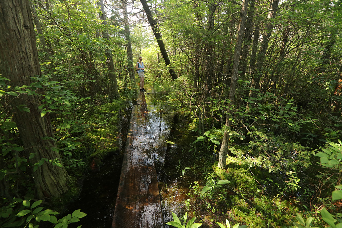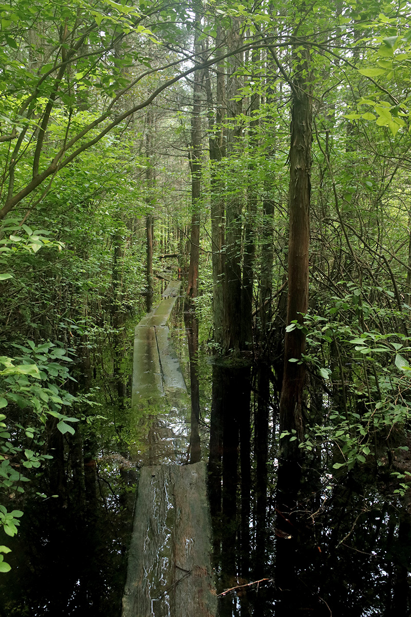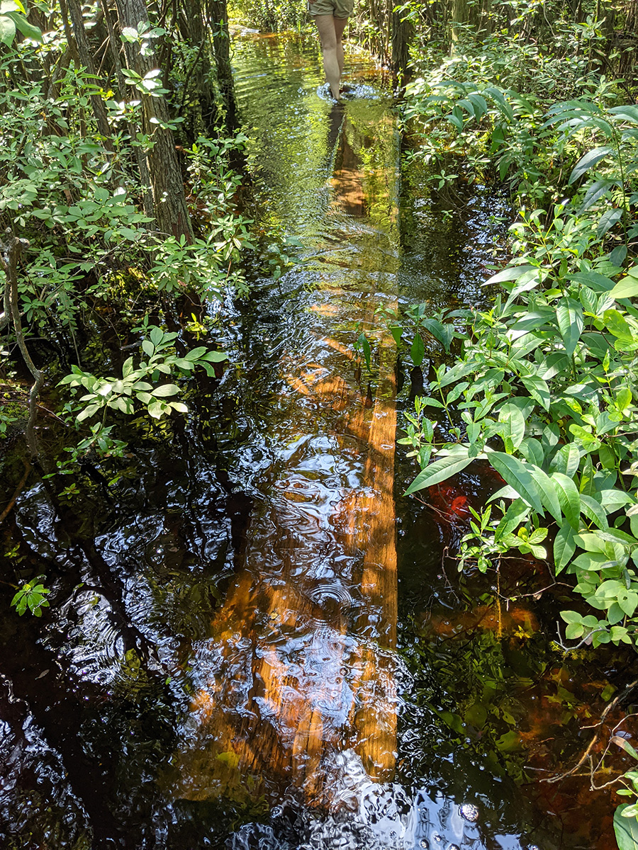 as i was taking a photo, i casually took a small step back and found myself falling into the bog. it happened so fast, i didn't even know what was happening, and i managed to dunk my dSLR camera briefly. apparently there was a hole in one of the planks and my left leg just fell through up to my thigh. eliza was concerned, kept asking if i was okay, i think i was more embarrassed than anything else, total rookie mistake. she also asked if i needed to go back, but i said i was okay. i think it looked worse than it actually was, the only injury was maybe a small cut and a bruise on the back of my knee. i was more concerned about the camera. after wiping it clean, i tested it to see if it was okay. it was still working, the canon 80D has some weatherproofing, but still, it wasn't designed to be an underwater camera. the lens suffered a bit more. some water must've gotten inside and it kept fogging up. it took a while for me to realize this, but all the photo i took with the 18-200mm afterwards had that soft-focused look because of the fogging. my other lenses were fine - the macro and the wide-angle - but this was my main lens, so it kind of took the wind out of my photography sail. also once we began to realize how challenging it was navigating the boardwalk, i put away the camera to keep my arms free, so if i started to teeter on a board i could use my hands to grab onto the branches on either side. eliza fell at one point as well, early in our walk. she also went down to her thigh, but quickly scrambled back onto the plank.