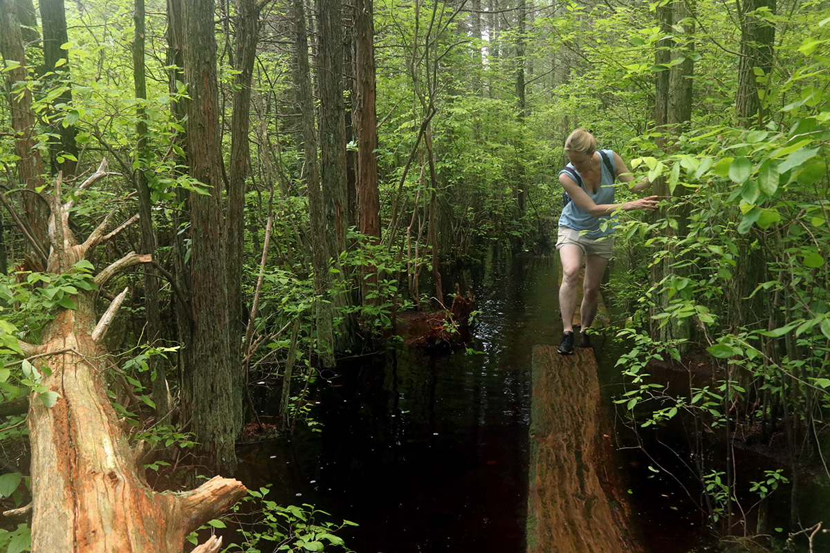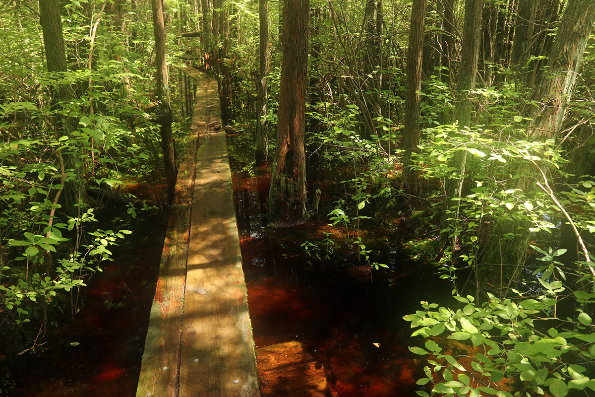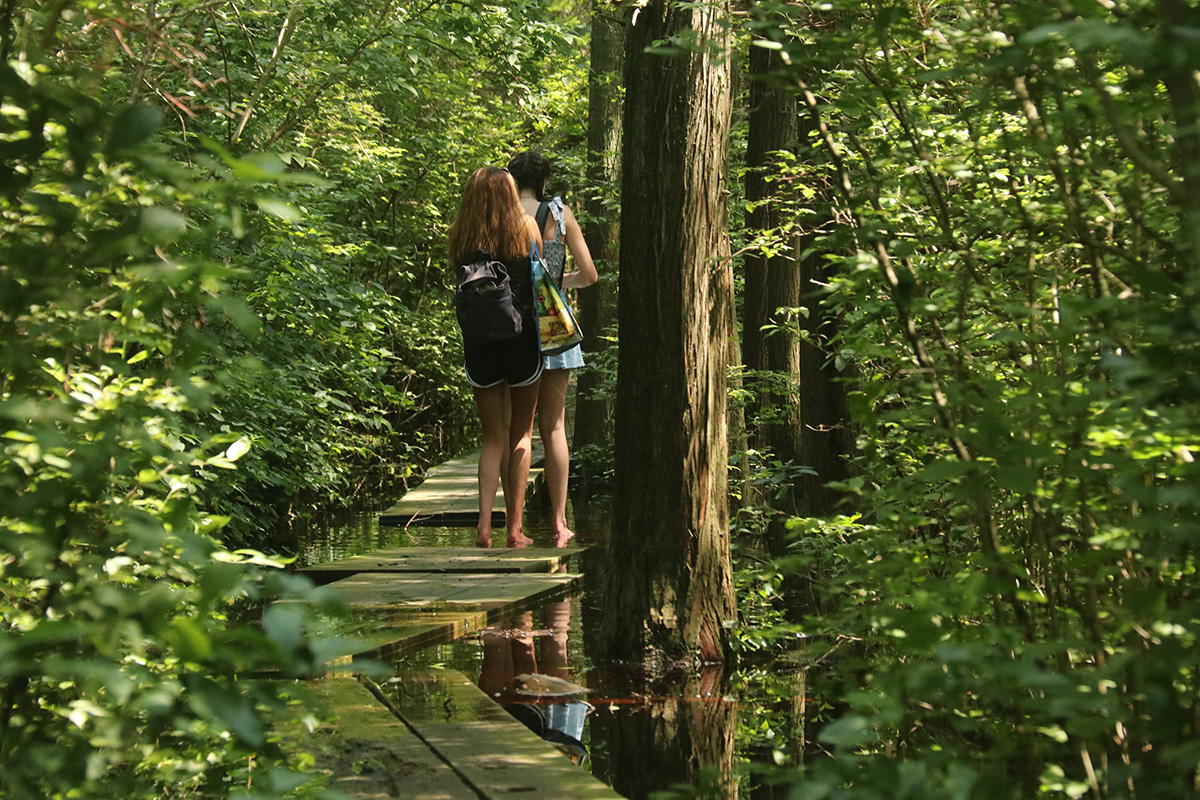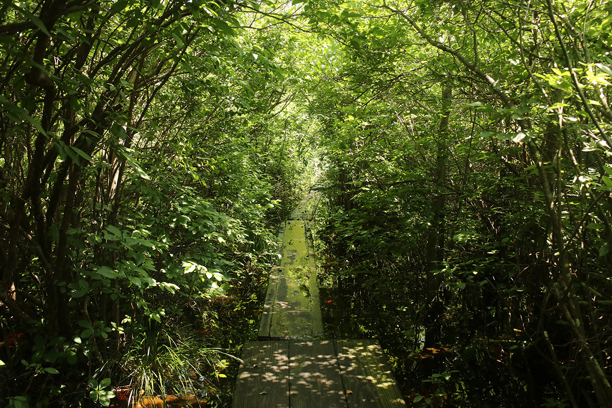 as i was taking a photo, i casually took a small step back and found myself falling into the bog. it happened so fast, i didn't even know what was happening, and i managed to dunk my dSLR camera briefly. apparently there was a hole in one of the planks and my left leg just fell through up to my thigh. eliza was concerned, kept asking if i was okay, i think i was more embarrassed than anything else, total rookie mistake. she also asked if i needed to go back, but i said i was okay. i think it looked worse than it actually was, the only injury was maybe a small cut and a bruise on the back of my knee. i was more concerned about the camera. after wiping it clean, i tested it to see if it was okay. it was still working, the canon 80D has some weatherproofing, but still, it wasn't designed to be an underwater camera. the lens suffered a bit more. some water must've gotten inside and it kept fogging up. it took a while for me to realize this, but all the photo i took with the 18-200mm afterwards had that soft-focused look because of the fogging. my other lenses were fine - the macro and the wide-angle - but this was my main lens, so it kind of took the wind out of my photography sail. also once we began to realize how challenging it was navigating the boardwalk, i put away the camera to keep my arms free, so if i started to teeter on a board i could use my hands to grab onto the branches on either side. eliza fell at one point as well, early in our walk. she also went down to her thigh, but quickly scrambled back onto the plank.
