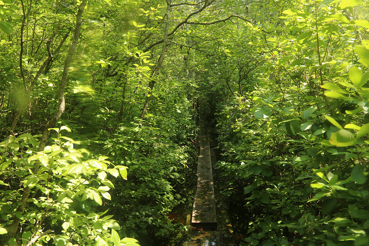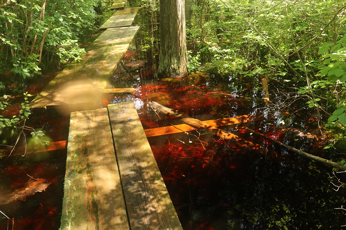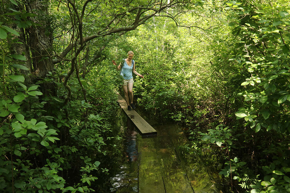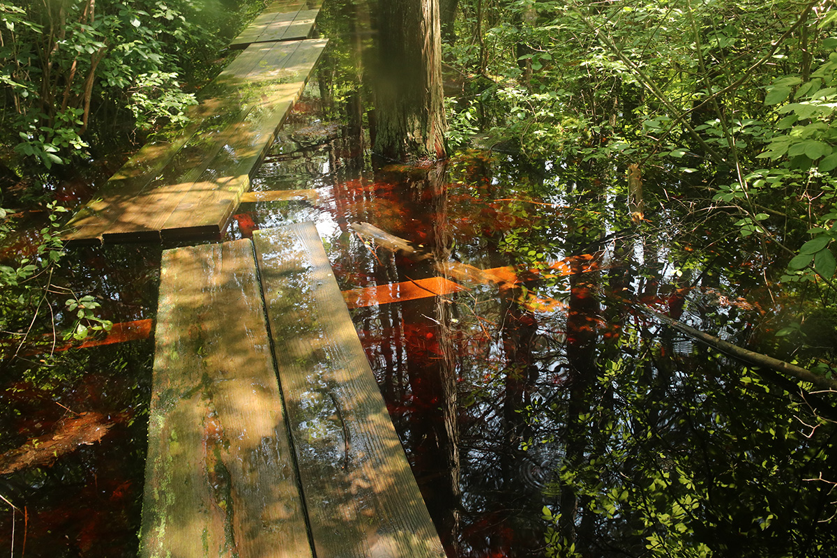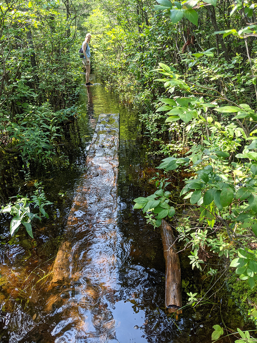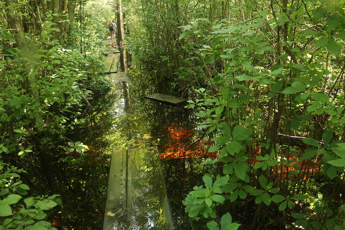 as soon as we entered the bog, we knew it'd be impossible to keep our shoes wet. the planks of the boardwalk were all floating. standing on a plank, you immediately since to above your ankle. some of the boards were also slippery from algae. so it wasn't so much a leisurely walk but more of an obstacle course, stepping from one board to another.