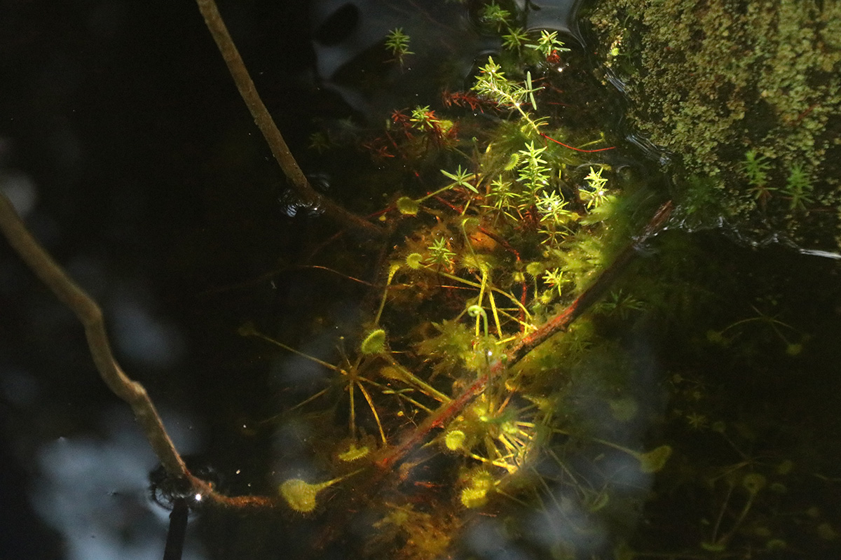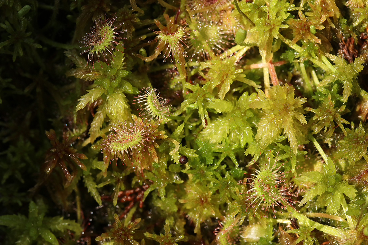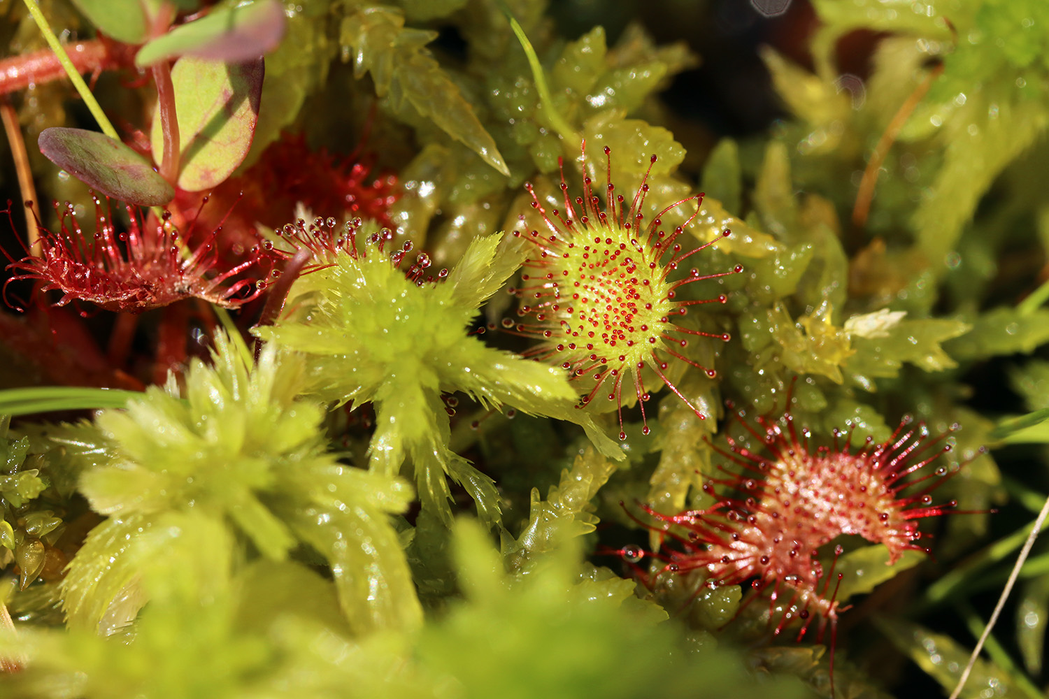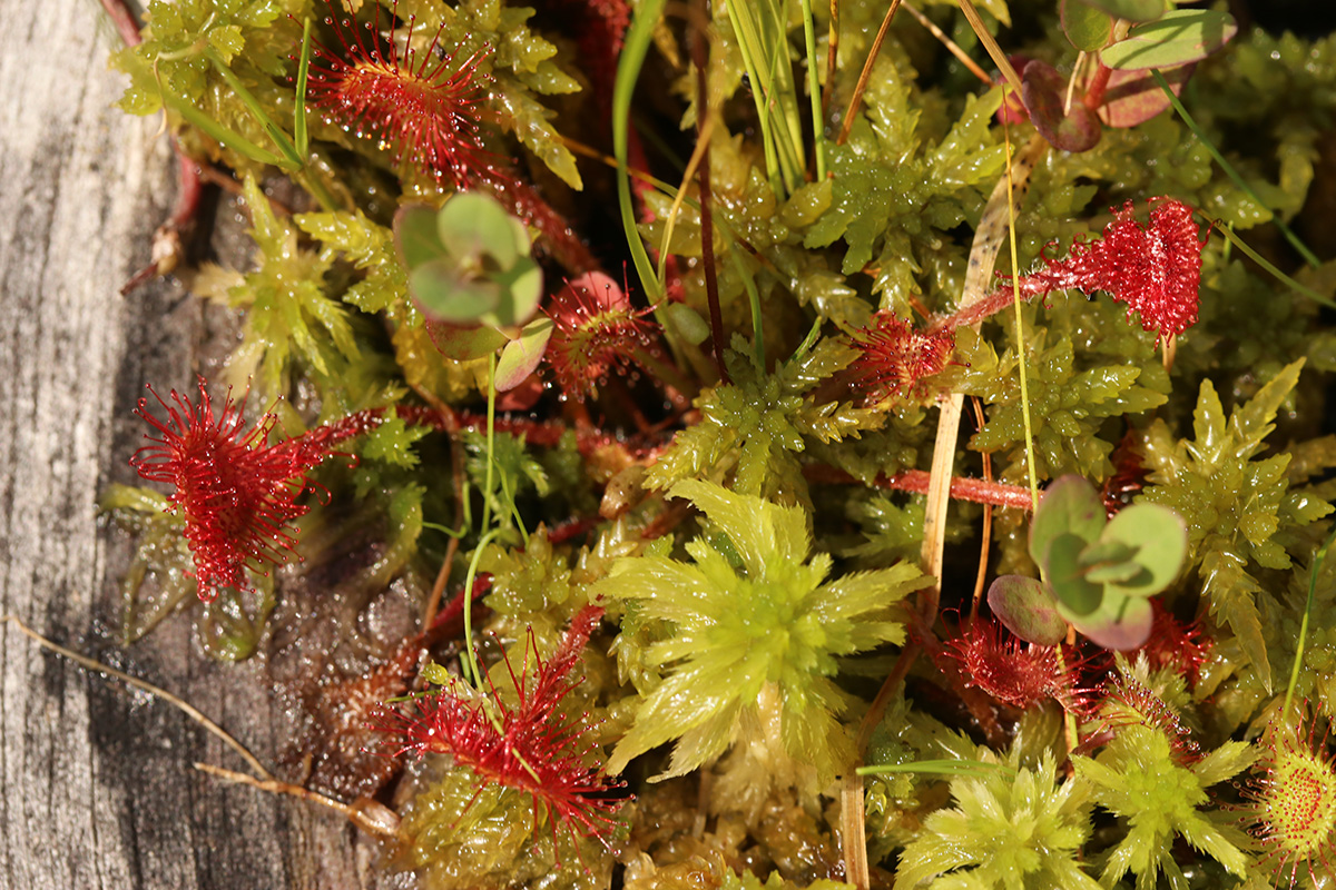 i started seeing pitcher plants and sundews, but many of them were underwater. i also saw the third type of carnivorous plants - bladderworts - but they do fine in the water since they're aquatic. so the bog transitioned from cedar swamp into a boggy clearing of sphagnum moss carpet. the entire boardwalk is just 2/5 miles, but it took nearly an hour just to get from the bog entrance to the bog clearing. the boardwalk was on more solid footing in the clearing area, but being out in the sun instead of the forest shade also meant it was hotter. also because we'd been balancing on floating planks for the past hour, we actually experienced some sea legs once back on solid ground. here were sundews growing amongst the moss, turning red from being out in the sun. i could've stayed here for another hour just taking sundew photos, but we continued onwards.
