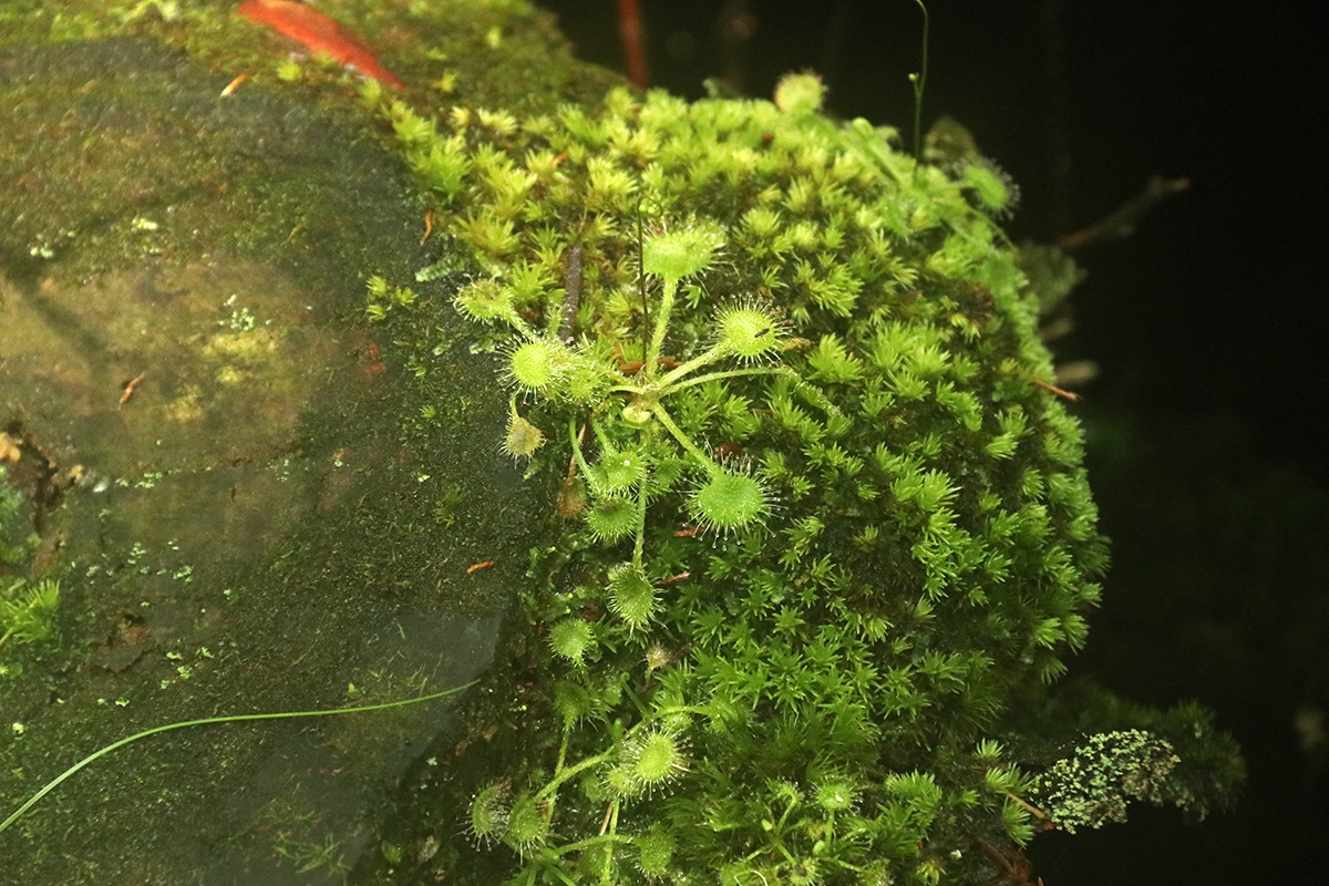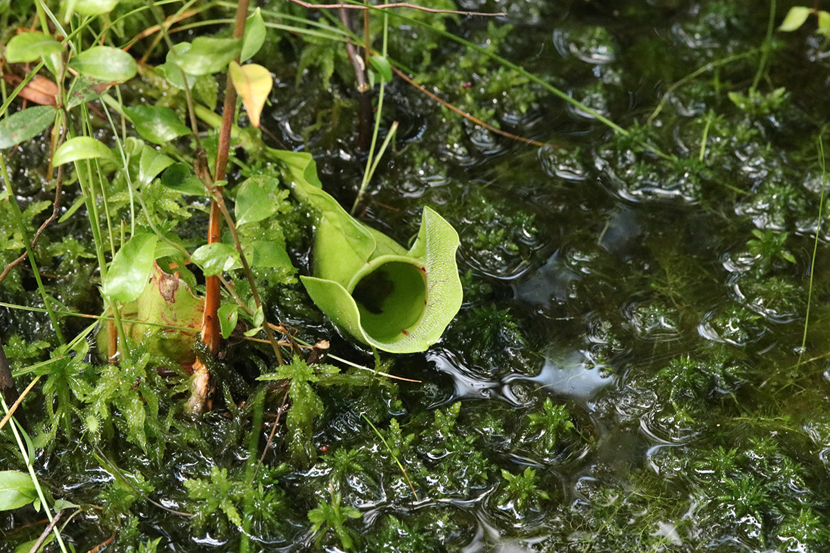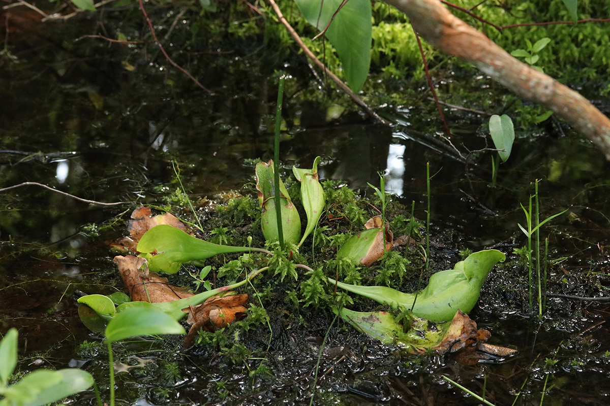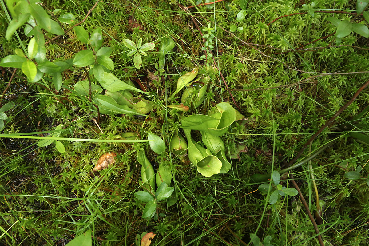 i started seeing pitcher plants and sundews, but many of them were underwater. i also saw the third type of carnivorous plants - bladderworts - but they do fine in the water since they're aquatic. so the bog transitioned from cedar swamp into a boggy clearing of sphagnum moss carpet. the entire boardwalk is just 2/5 miles, but it took nearly an hour just to get from the bog entrance to the bog clearing. the boardwalk was on more solid footing in the clearing area, but being out in the sun instead of the forest shade also meant it was hotter. also because we'd been balancing on floating planks for the past hour, we actually experienced some sea legs once back on solid ground. here were sundews growing amongst the moss, turning red from being out in the sun. i could've stayed here for another hour just taking sundew photos, but we continued onwards.