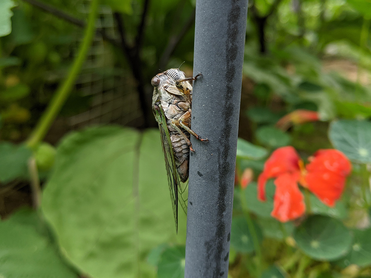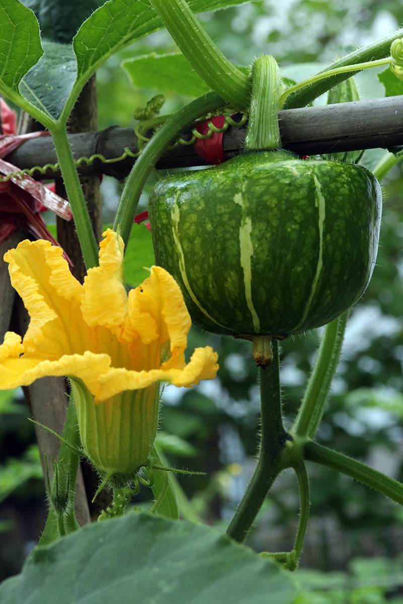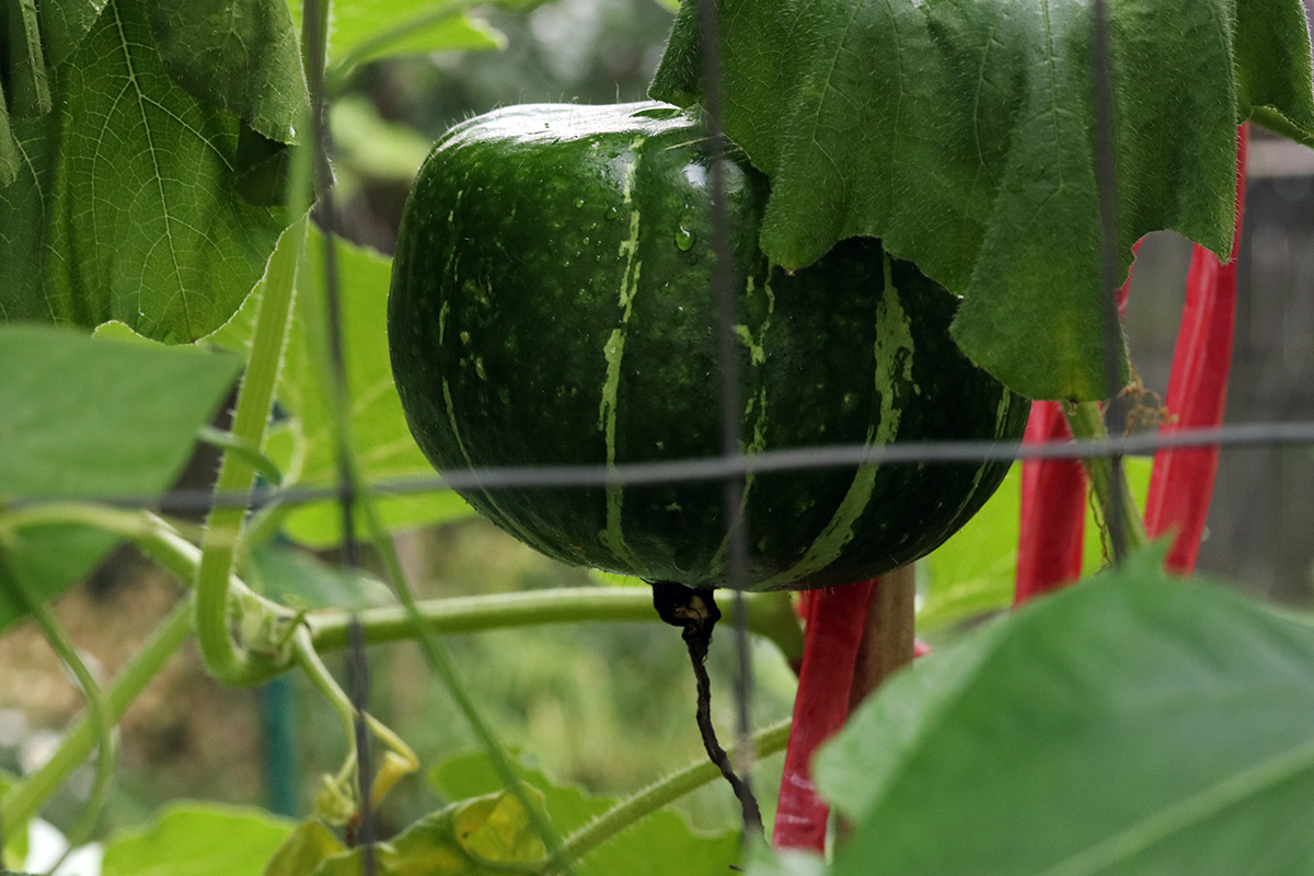 i took a few snapshots in the garden with the dSLR. like yesterday, i got a few more mosquito bites on my legs. maybe because of all the turning i did yesterday, but the compost didn't smell today. the ground-grown squash next to RB0 has a fruit that i believe is the second largest squash we have. none of the ones we have can compare to the monster sizes we used to grow (2018). maybe ground grown squash with vines that can root in the soil produce bigger fruits. although hanging squashes take up less space, they can only get so large (2019 2020). if we don't get a second batch of squashes, this year will be the least amount of squash (by overall weight) even though we expended the maximum effort.