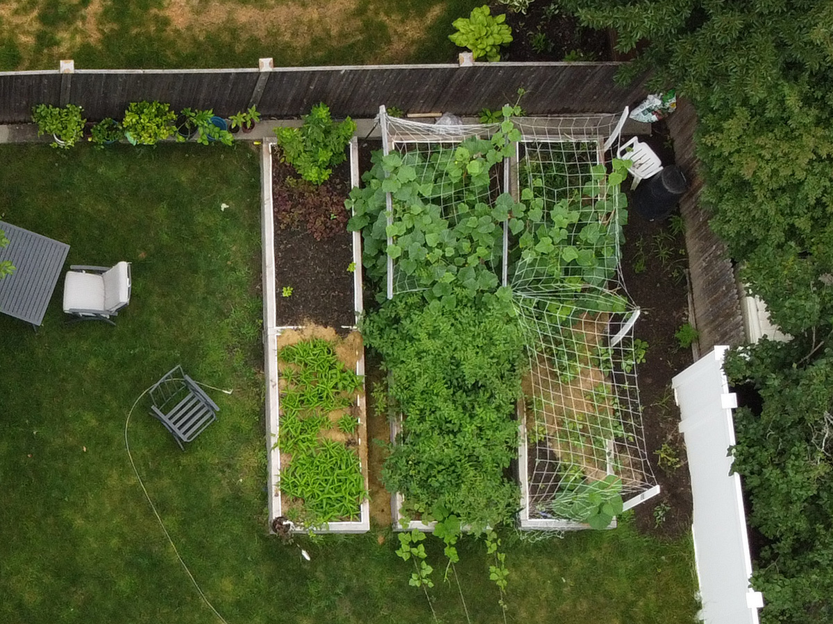 in the late afternoon i decided to fly the drone again, this time to take a peek at our neighbor's backyard across the street. when i flew over yesterday i noticed they had some raised beds, but i was too high (400ft) to make out what they were. this time i was only at 100ft and had a much better look. they have a bunch of squash and a few beans, but the rest i can't identify. maybe tomatoes? and some red-leaf lettuce? but everything else is a mystery. i also wanted to see how far i could fly the drone, this time to the center of fresh pond before i got nervous and decided to fly back. i probably could've pushed it a bit farther, i was still at 60% RC signal.
