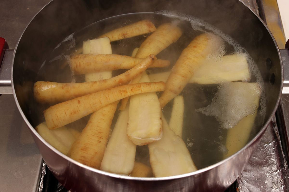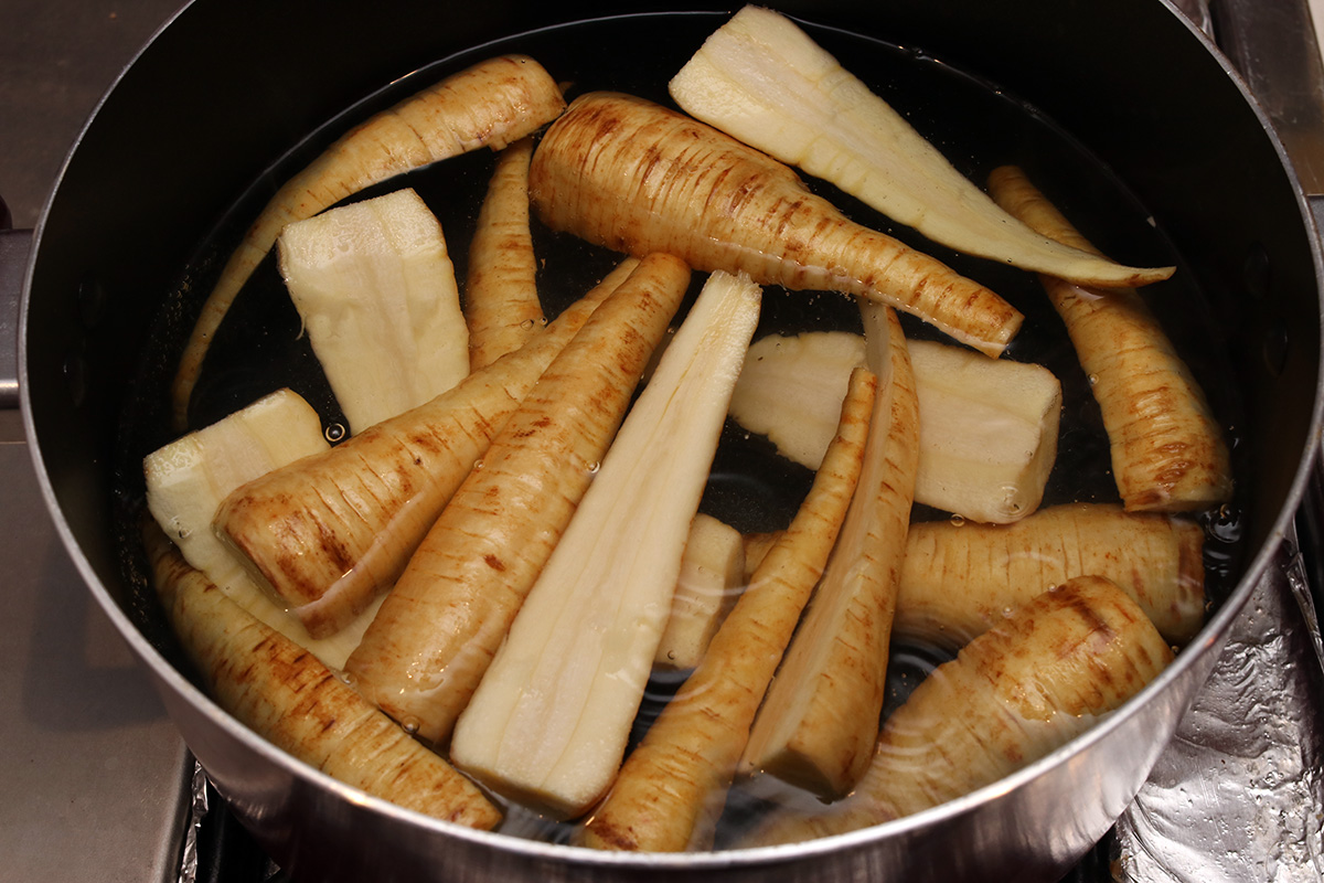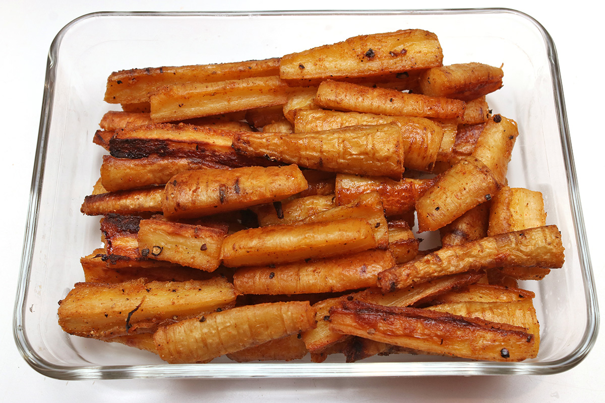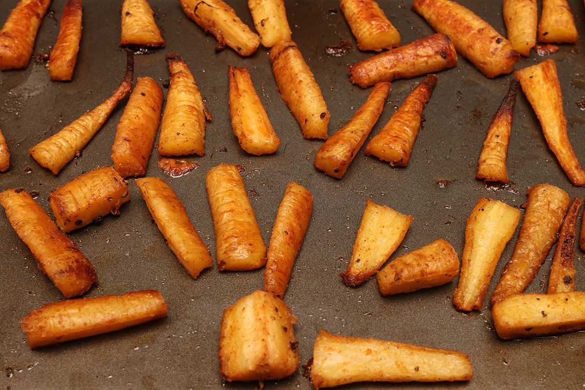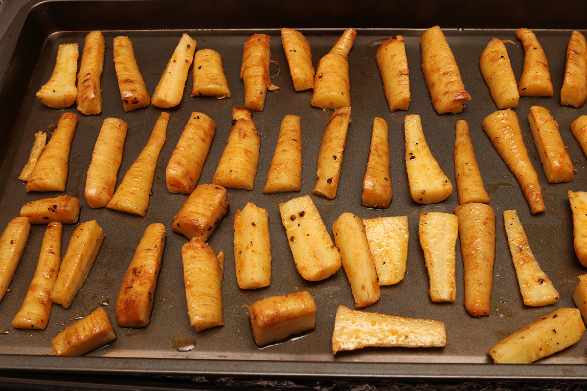 as for the parsnips, i first trimmed off the tops, then parboiled them in water for 8 minutes. this is to soften them up, as i read the thicker pieces can be tough if roasted directly, particularly the woodsy interior. once they finished boiling, i cut them into smaller pieces then tossed with olive oil, salt, pepper, paprika, and ground garlic powder. i then placed them on a pan and roasted them in the oven for 30 minutes, turning them with tongs every 10 minutes so they brown on all sides.