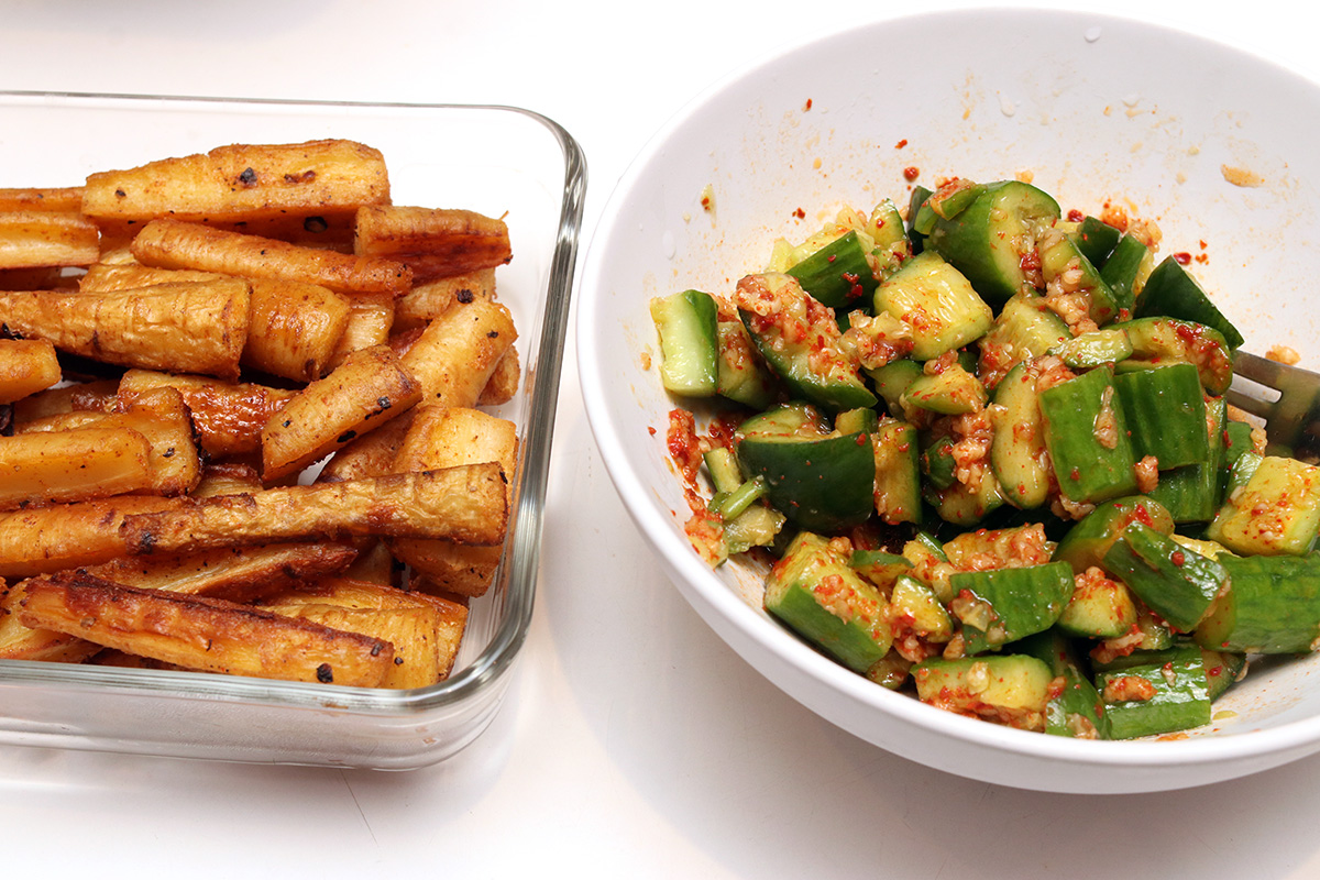 besides an encore preparation of smashed cucumbers (this time with rice vinegar), i decided to also roast the parsnips i bought yesterday.