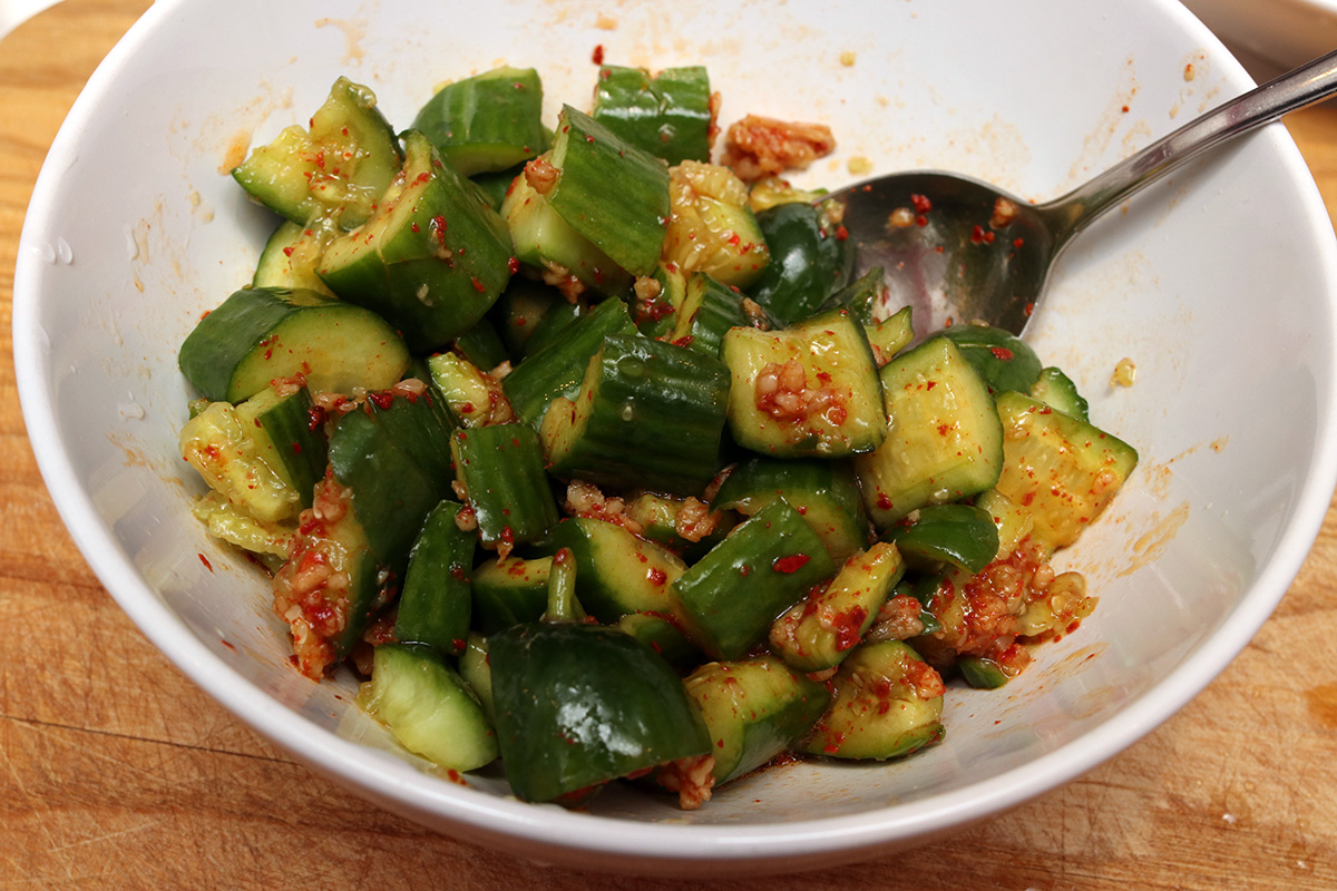 i still wasn't happy with the smashed cucumbers. yesterday they were too sweet, today they were too sour. i tasted the rice vinegar, i really didn't notice any difference compared to regular vinegar, of which i have many different bottles (red wine, regular, cider, balsamic). i think next time i'll need to add some sugar just to balance out the sourness. i could also ask my mother, who occasionally makes this as well, maybe she has some flavor tips. fortunately i bought another cucumber today (english), so i can make this recipe a few more times. i can't imagine anyone would object if i ate a lot of cucumbers, i imagine they're a lot healthier than what i normally eat.