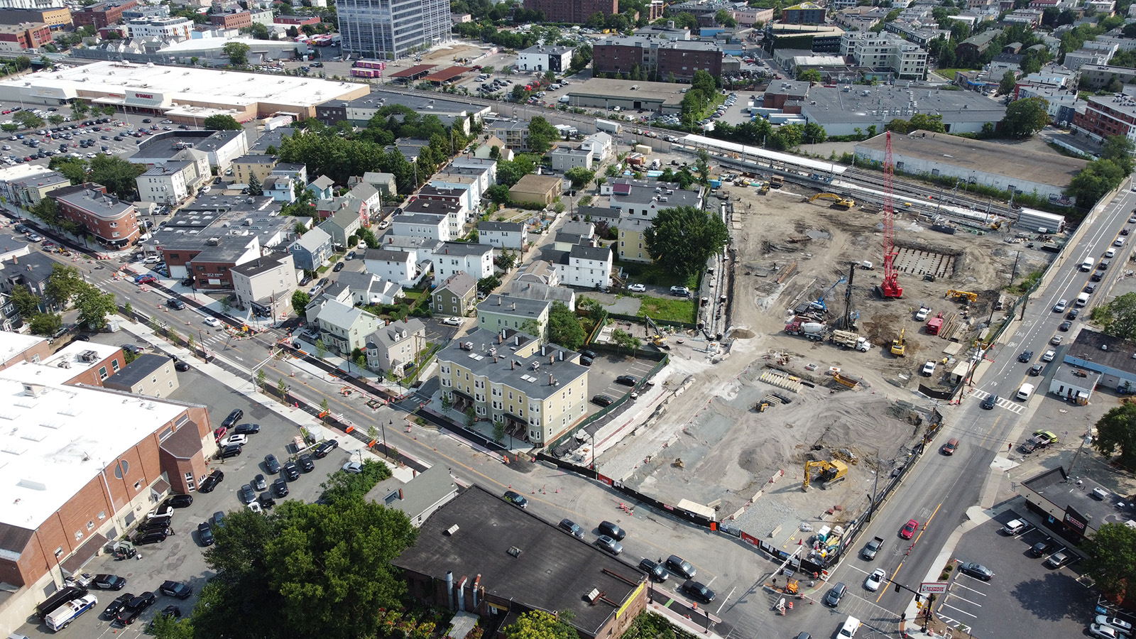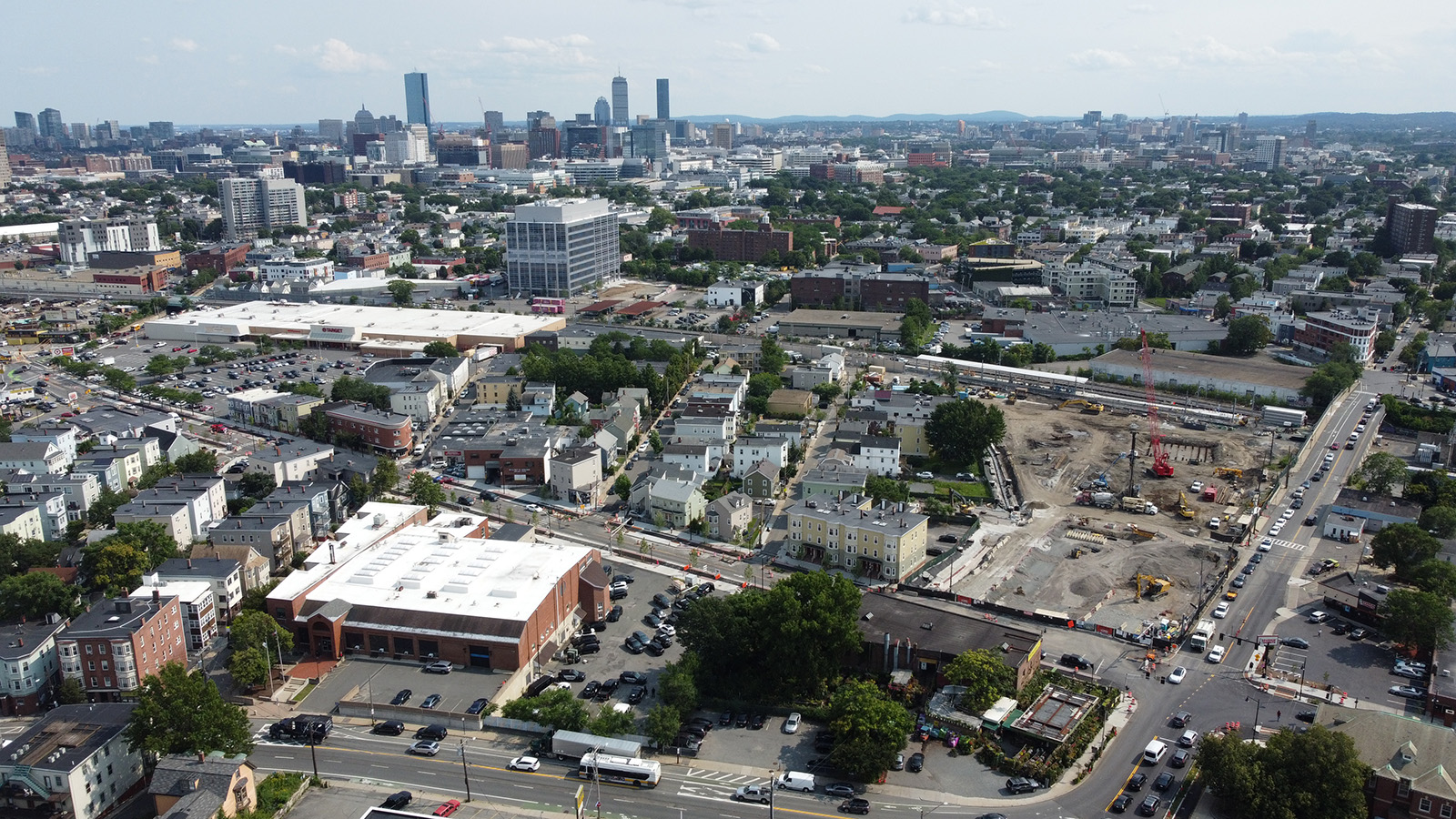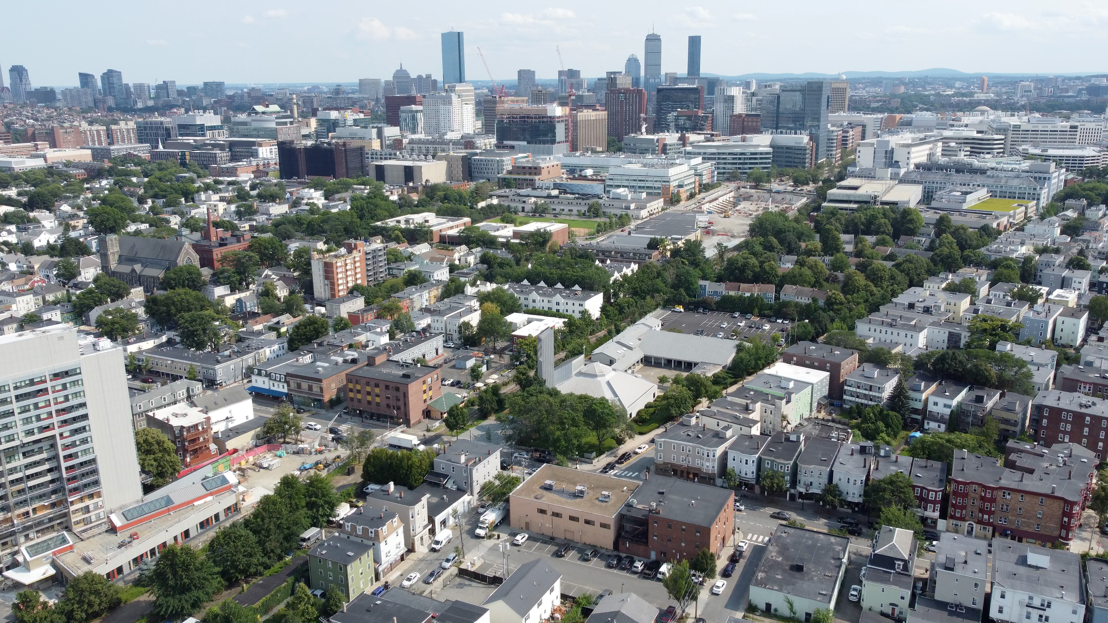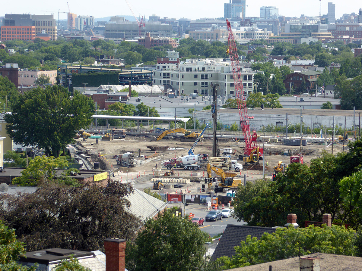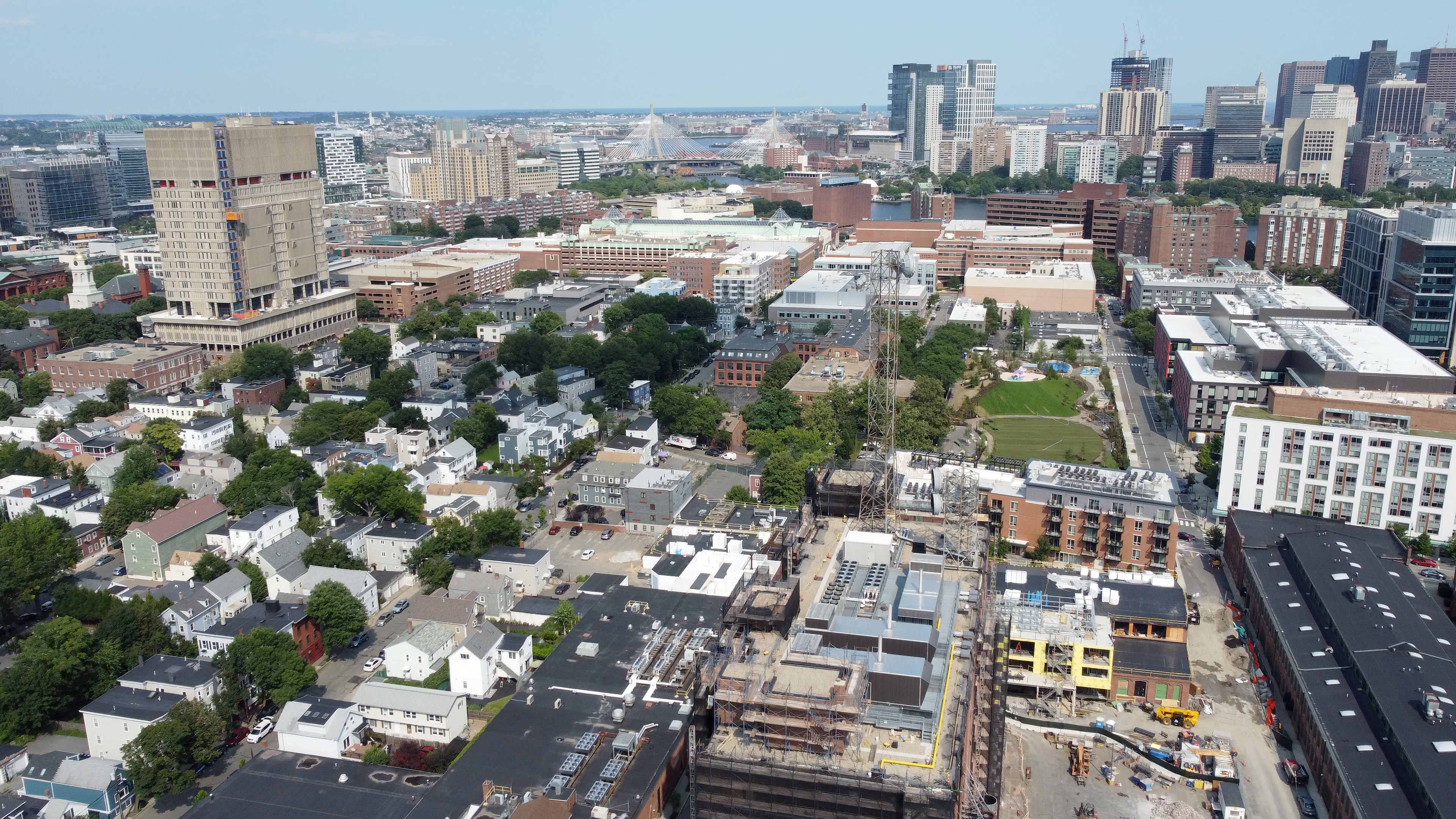 the couple beneath the tree actually heard my drone ascending into the air. i flew it over the union square MBTA extension station construction site (at 200ft elevation measured from prospect hill), then continued onwards towards boston, in a south-southeastern direction. i flew as far as rogers street in east cambridge, my former workplace (since torn down and replaced with a biogen lab).