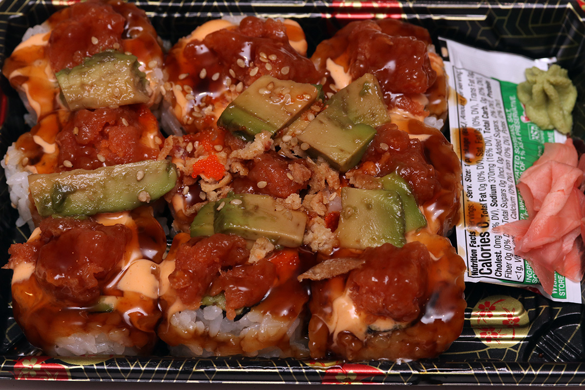 in the afternoon i went to market basket for the 3rd consecutive day in a row. i had a pineapple lindy's italian ice last night and it was pretty good so i went back for more. my mother also asked me to get some scallions and cilantro. plus i finally got that sushi i was eyeballing yesterday, saving it for dinner. they didn't have any pineapple-mango italian ice, but they did have watermelon-strawberry, so i got a box of that. i came home to drop off the sushi before riding to the cafe to deliver the supplies.